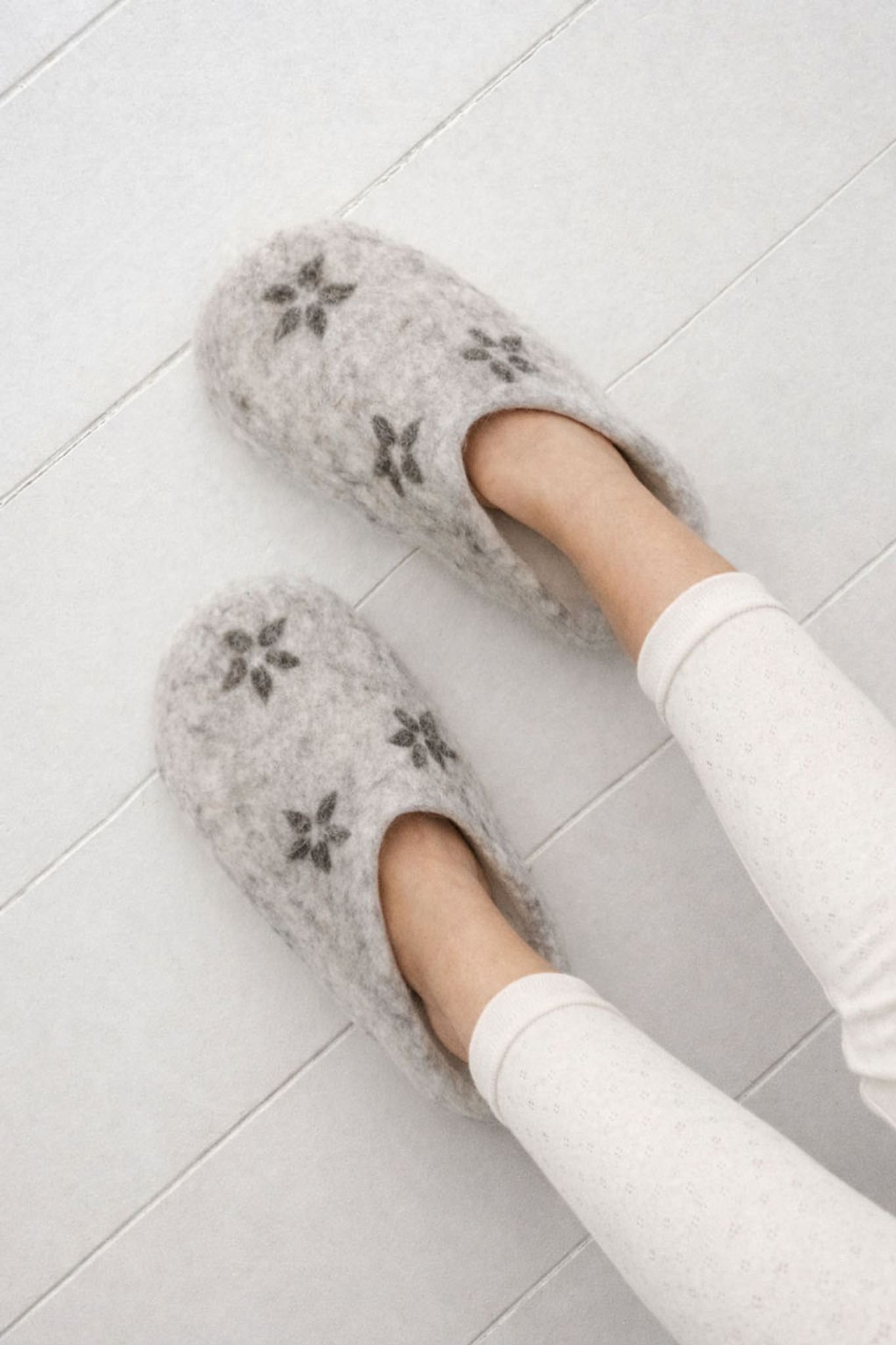 Ett par mjuka ulltofflor i tovad ull med små broderade blommor. De är lätta och sköna att ha på sig och håller fötterna varma när det är kallt, men känns också svala och behagliga när det är varmt. Perfekta för lugna morgnar, kvällar hemma, sommarens altanhäng och sena grillkvällar när luften blir lite sval.