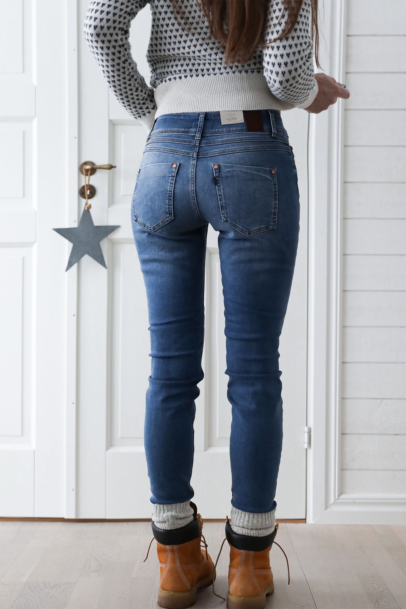 Underbara jeans i snygg blå tvätt och jättefin modell. Perfekta varjedag-jeans som får en att känna sig fin och bekväm. Materialet är mjukt och stretchigt.