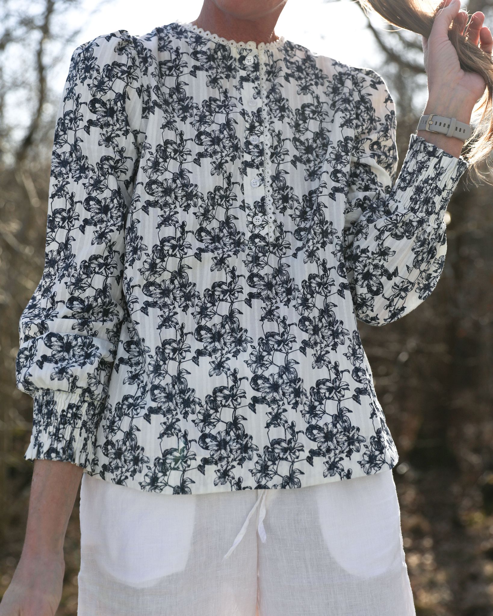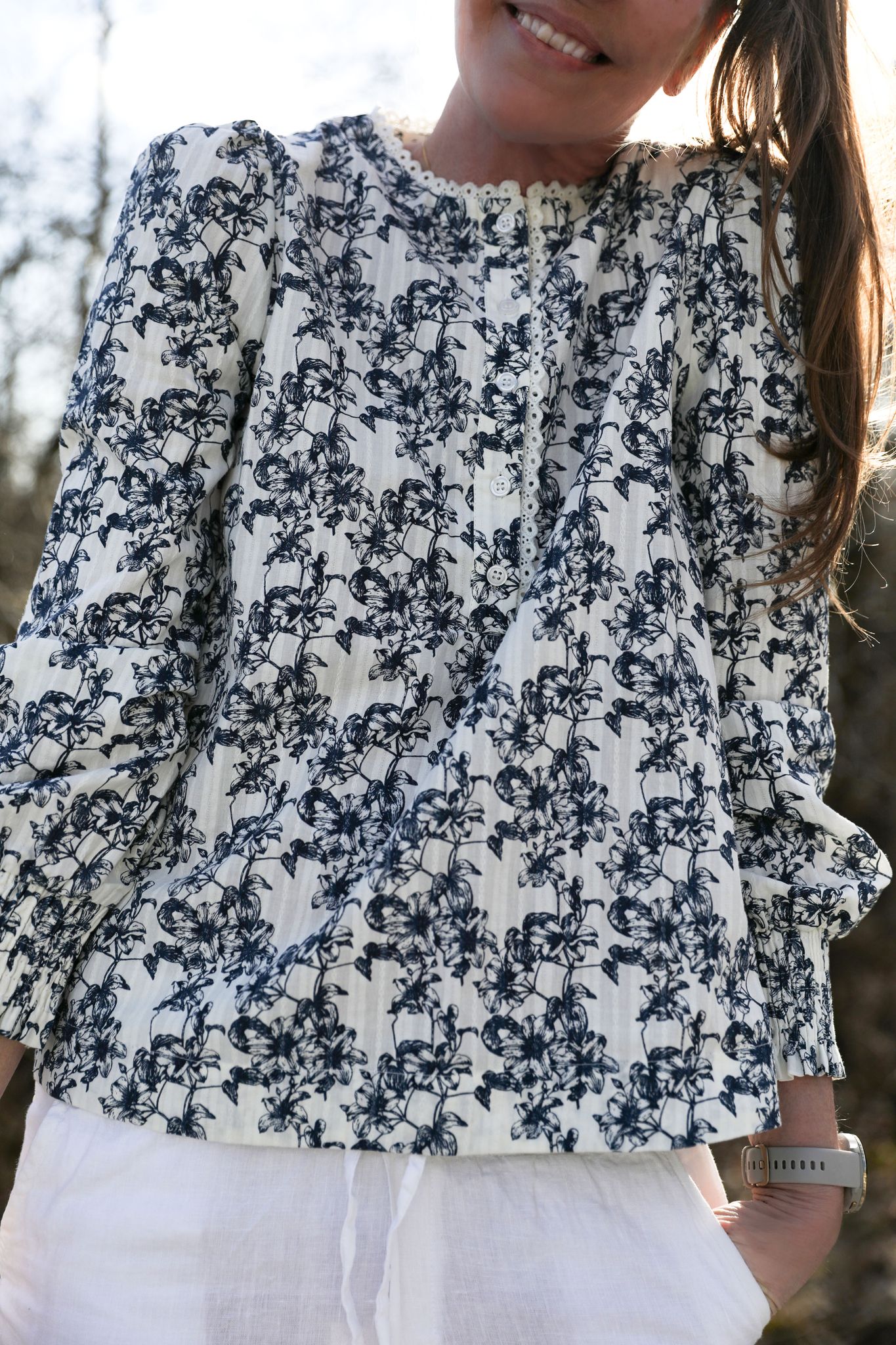 Underbar bomullsblus med mörkblå blommor och söta virkade spetsdetaljer vid halsringning och knäppning, sydd i en bomullsväv med en lite gammaldags, fin struktur i tyget. Blusen har en kort knäppning framtill med små knappar. Ärmarna är lätt puffade och har smock i ärmsluten som sitter mjukt runt handleden.
