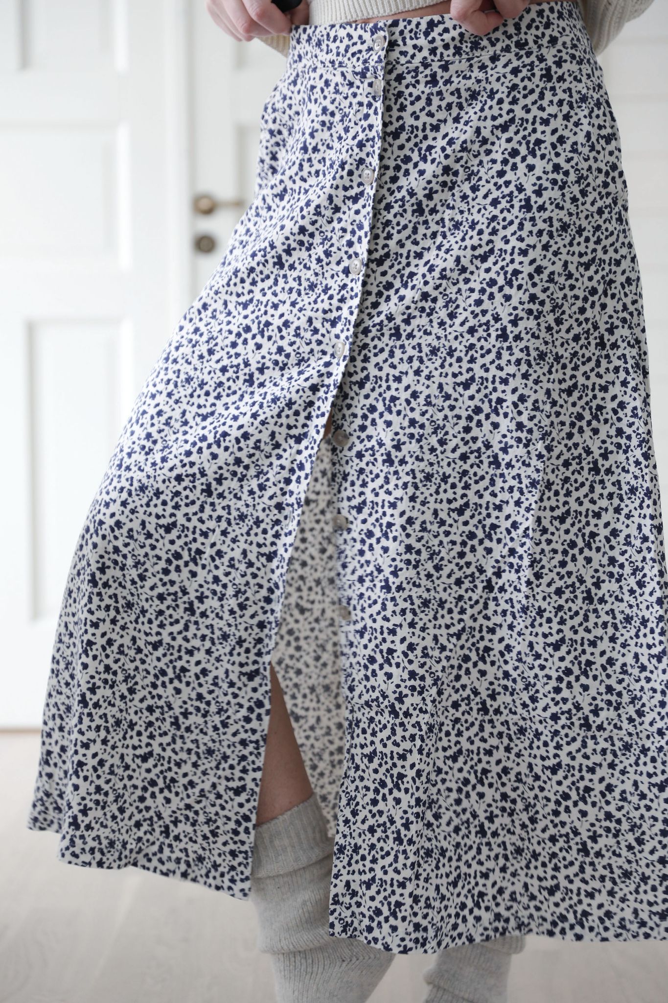 Blommig lång kjol i linne och viskos med knappar framtill