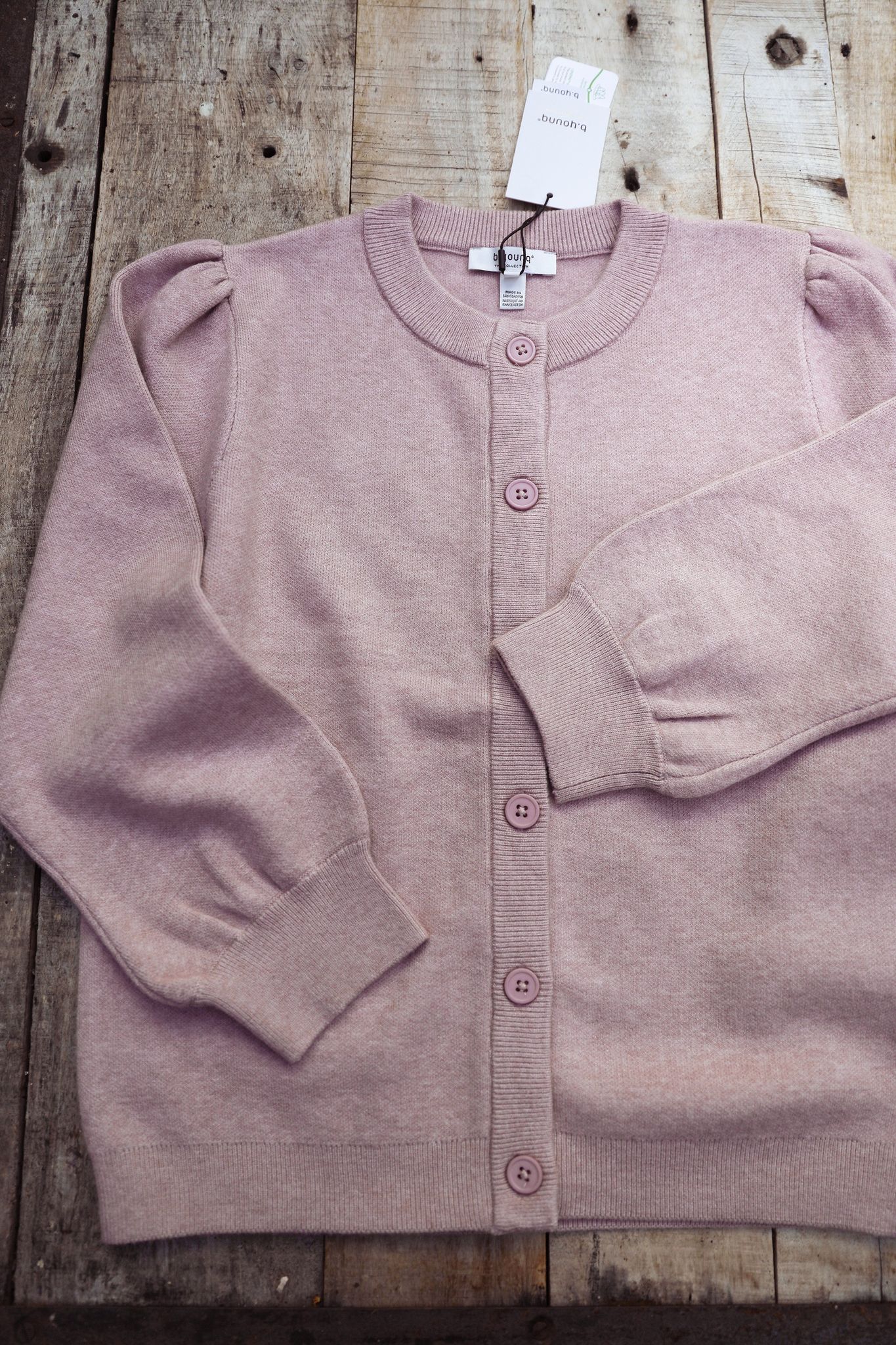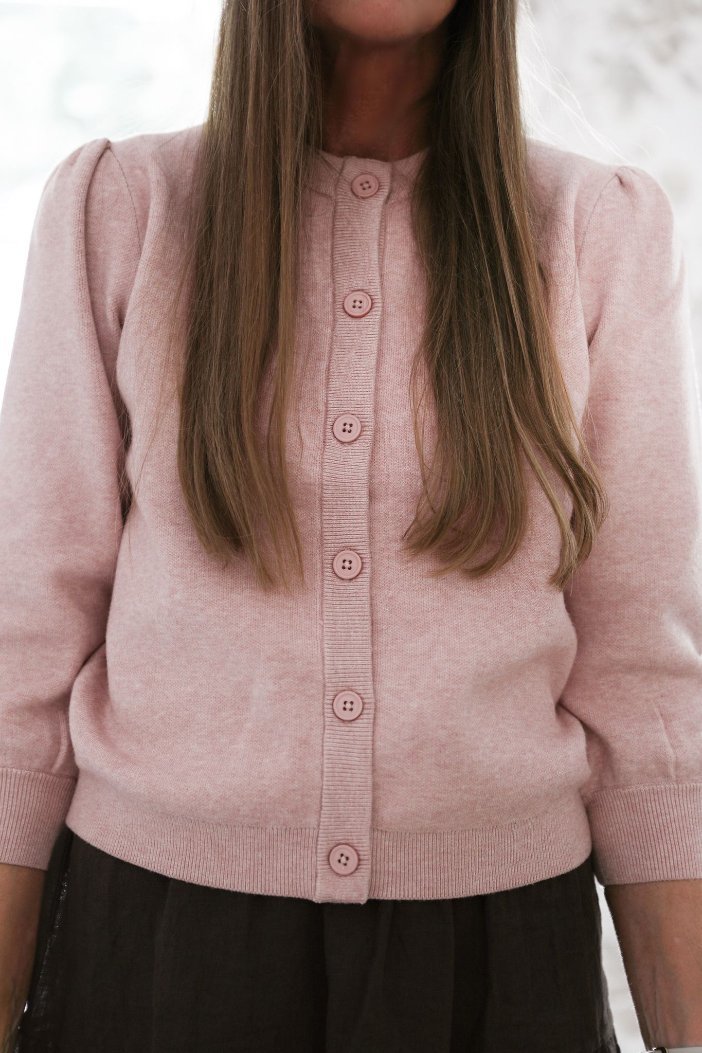 Gullig rosa kofta med puffärm i 3/4 dels-längd. Mjukt och tjockt stickat material som känns lent mot huden. Bär för sig själv, eller över blusar och klänningar om du känner dig frusen, eller kanske bara vill ha en fin kofta på din outfit.
