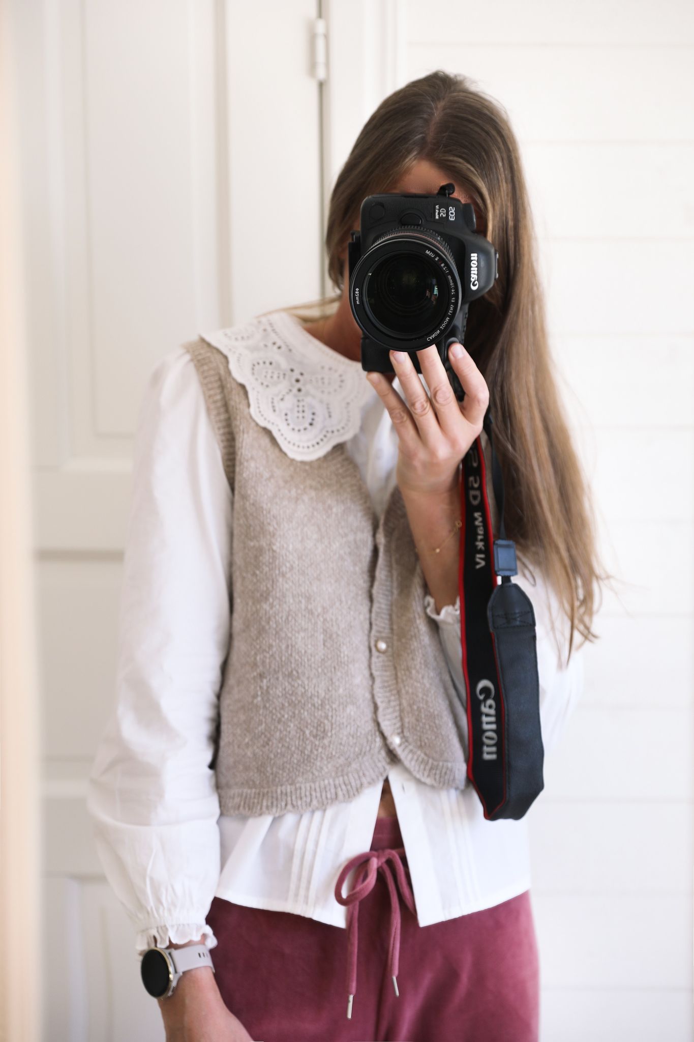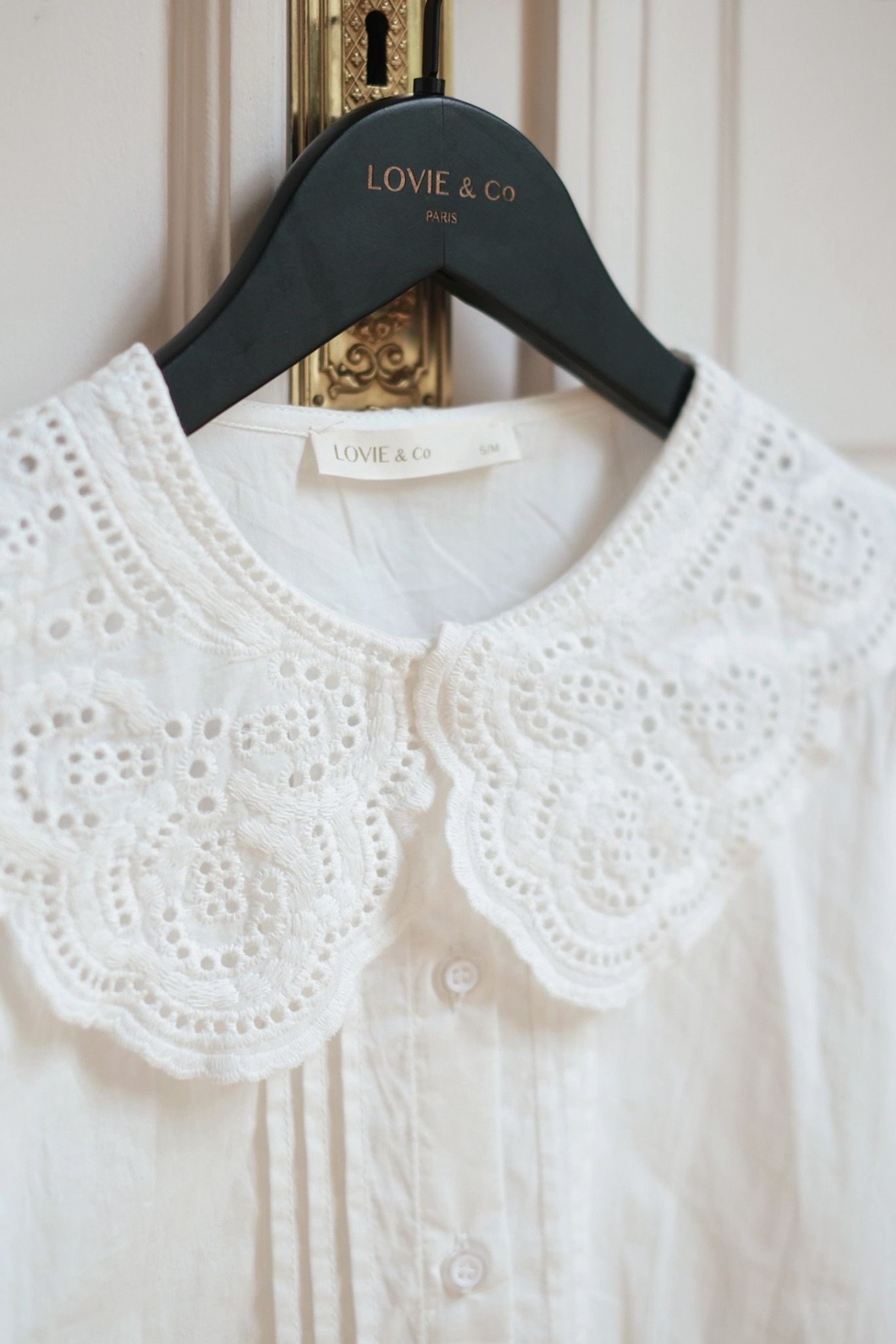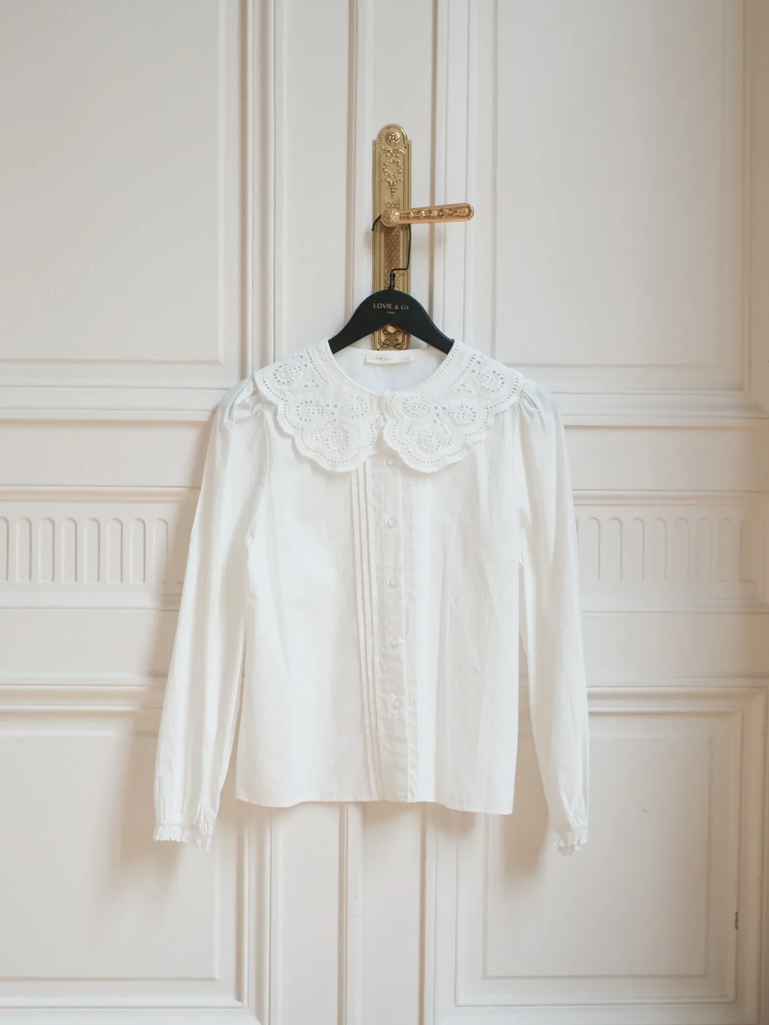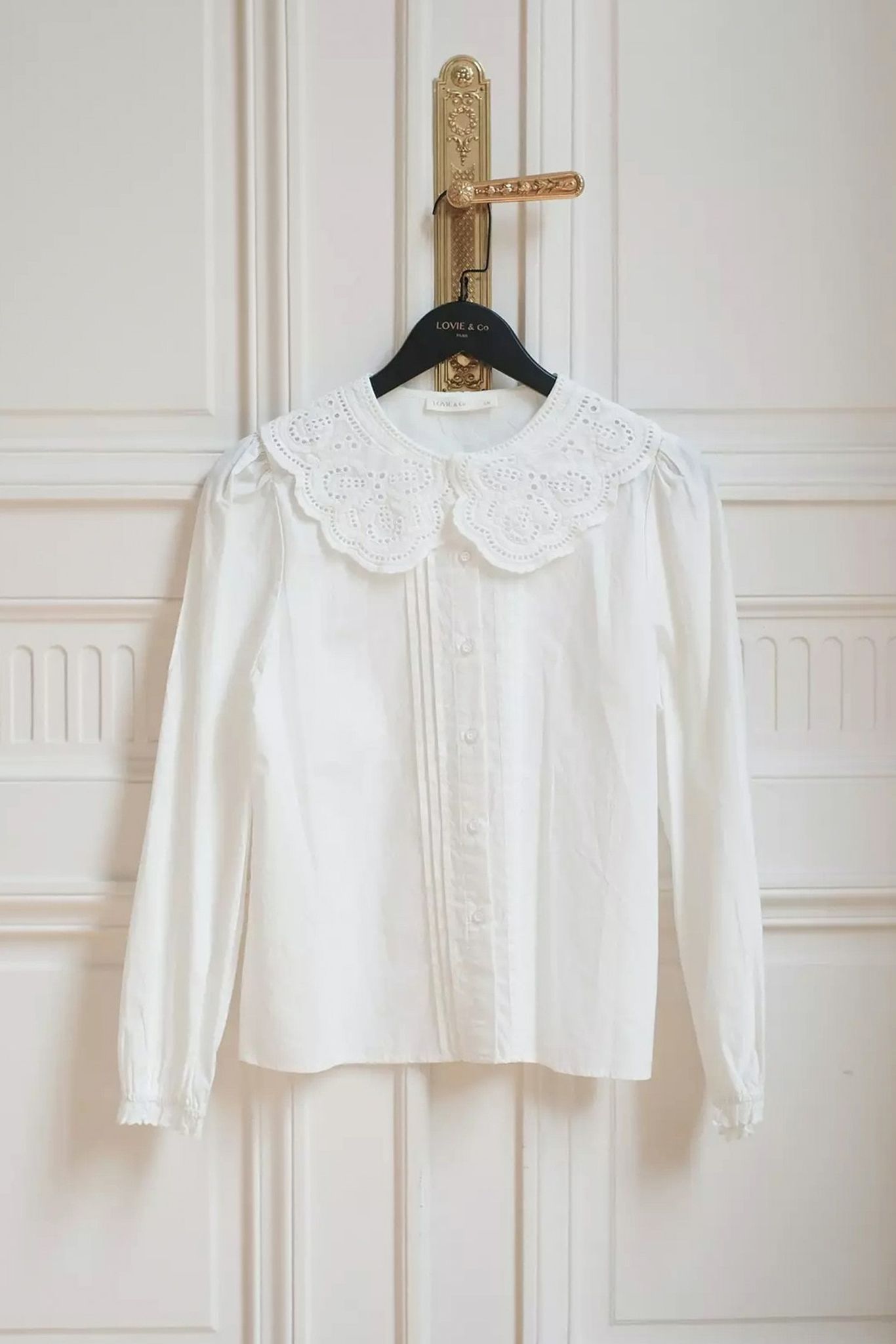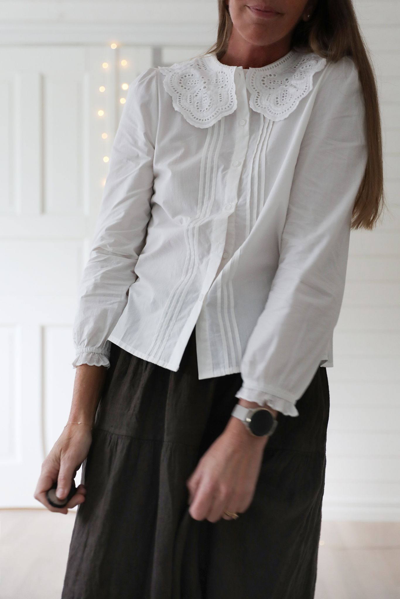Vit, lantlig blus med stor spetskrage. Underbart söt, i mjuk och len bomullsväv. Jättefin under koftor och västar med vackra kragen utanpå.