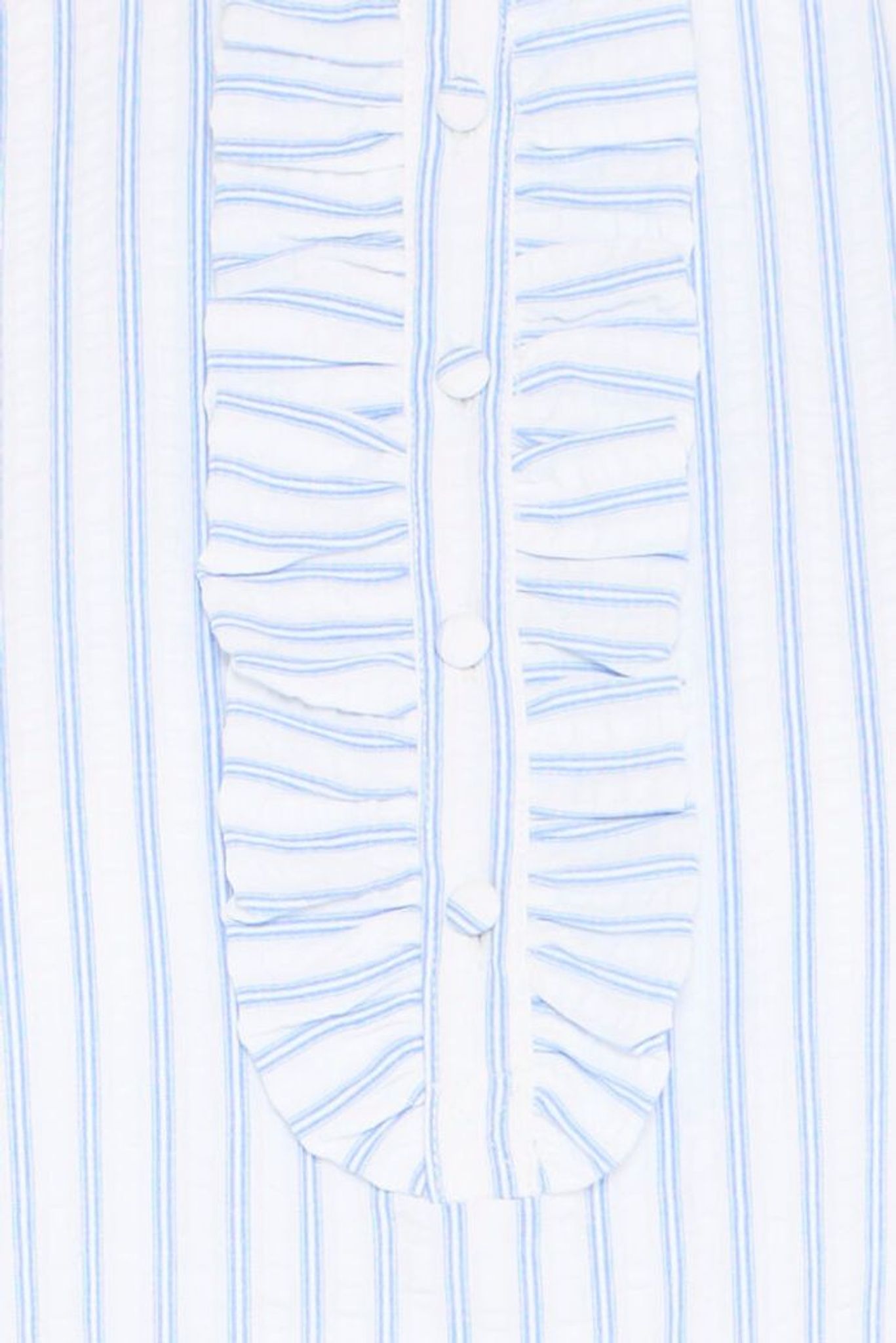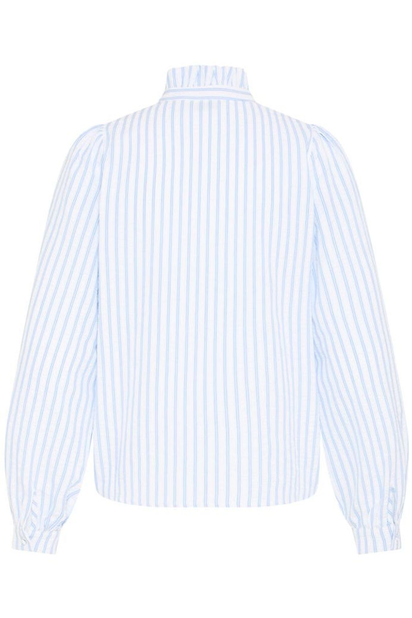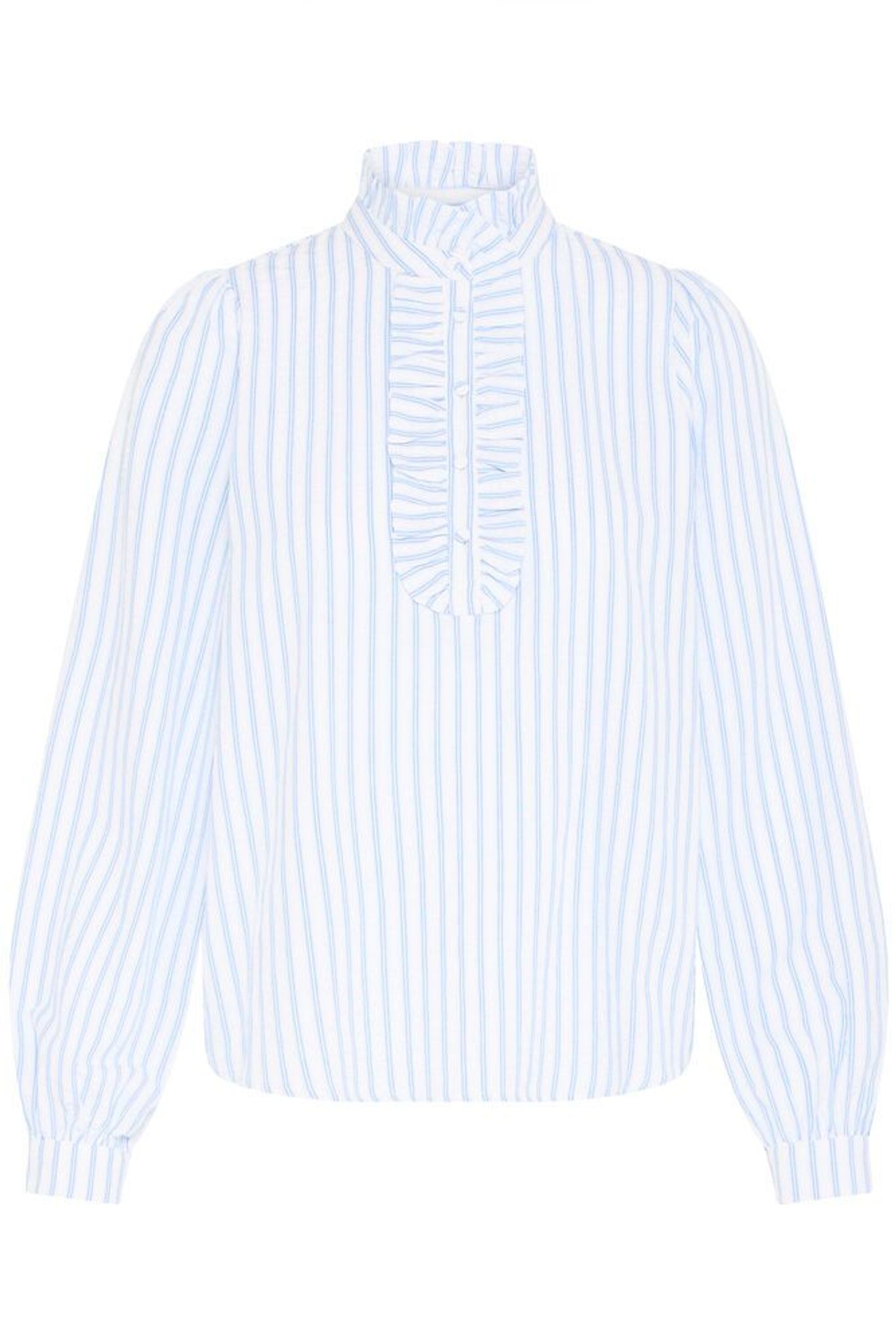 Elsa är en lantlig och feminin blus med vackra, genomarbetade detaljer – klädda knappar framtill, fina kruskanter längs knappslån och eleganta manchetter med klädda knappar. Den ljusblå randningen ger ett tidlöst uttryck som känns både klassiskt och levande.