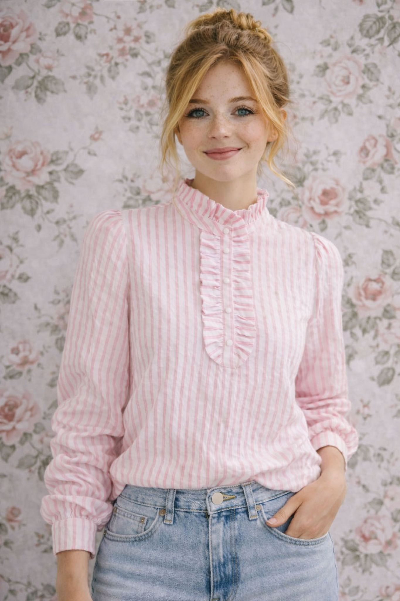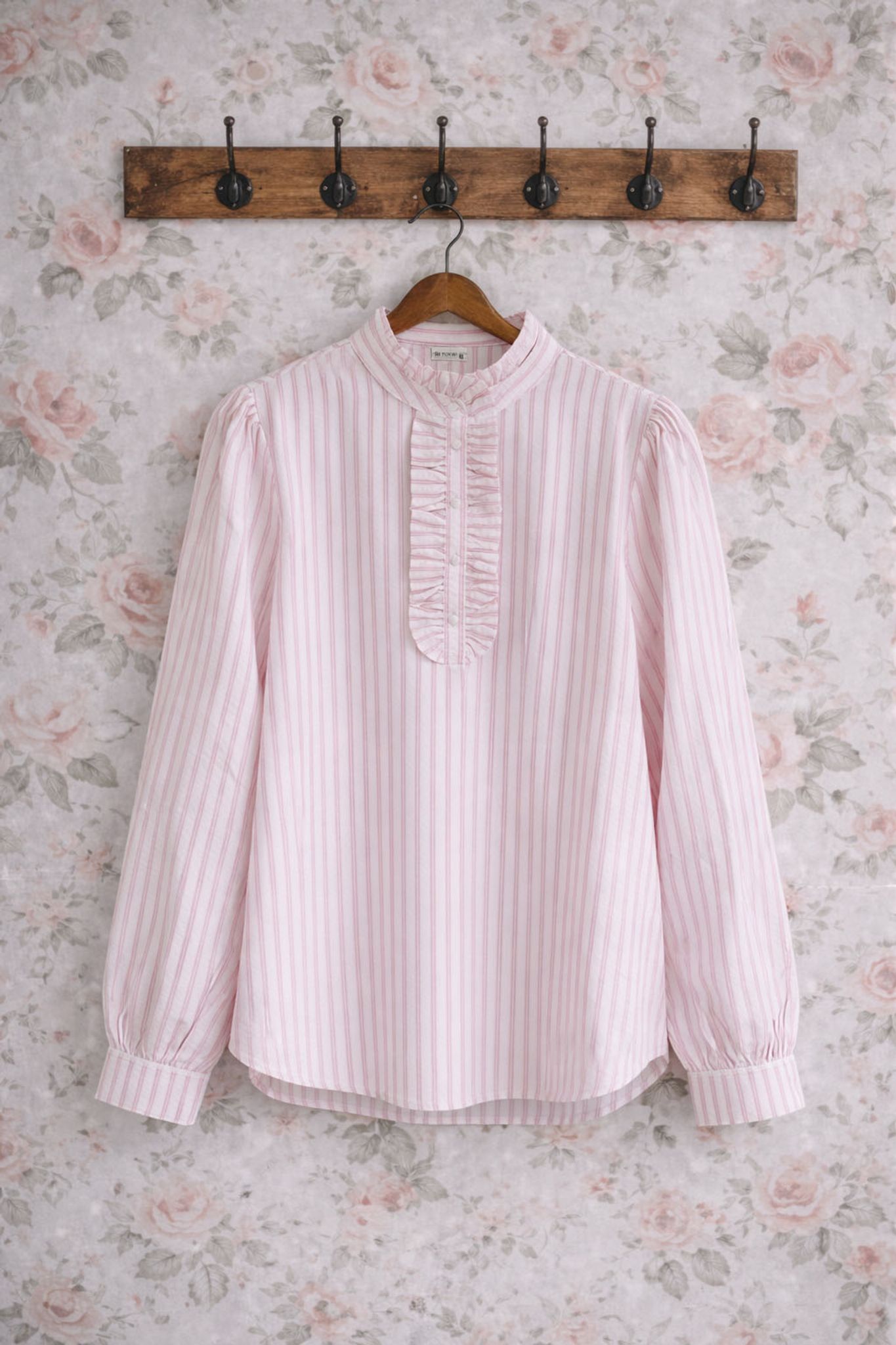 Elsa är en lantlig och feminin blus med vackra, genomarbetade detaljer – klädda knappar framtill, fina kruskanter längs knappslån och eleganta manchetter med klädda knappar. Den ljusblå randningen ger ett tidlöst uttryck som känns både klassiskt och levande.