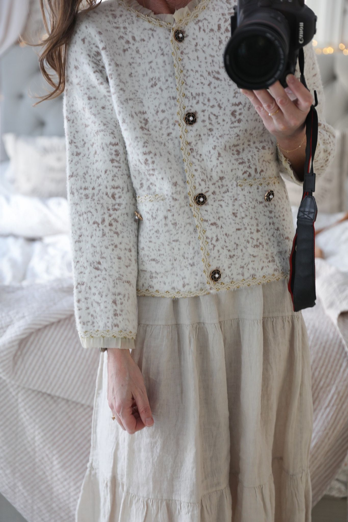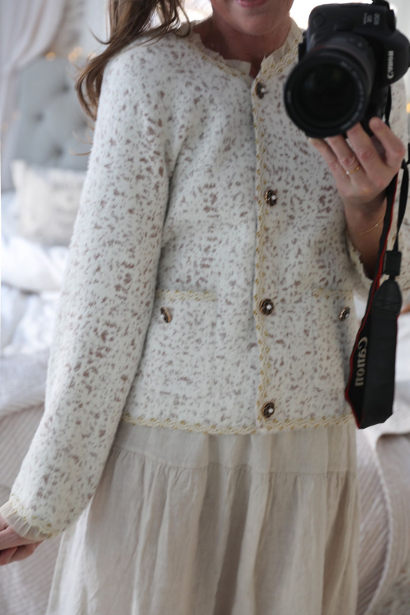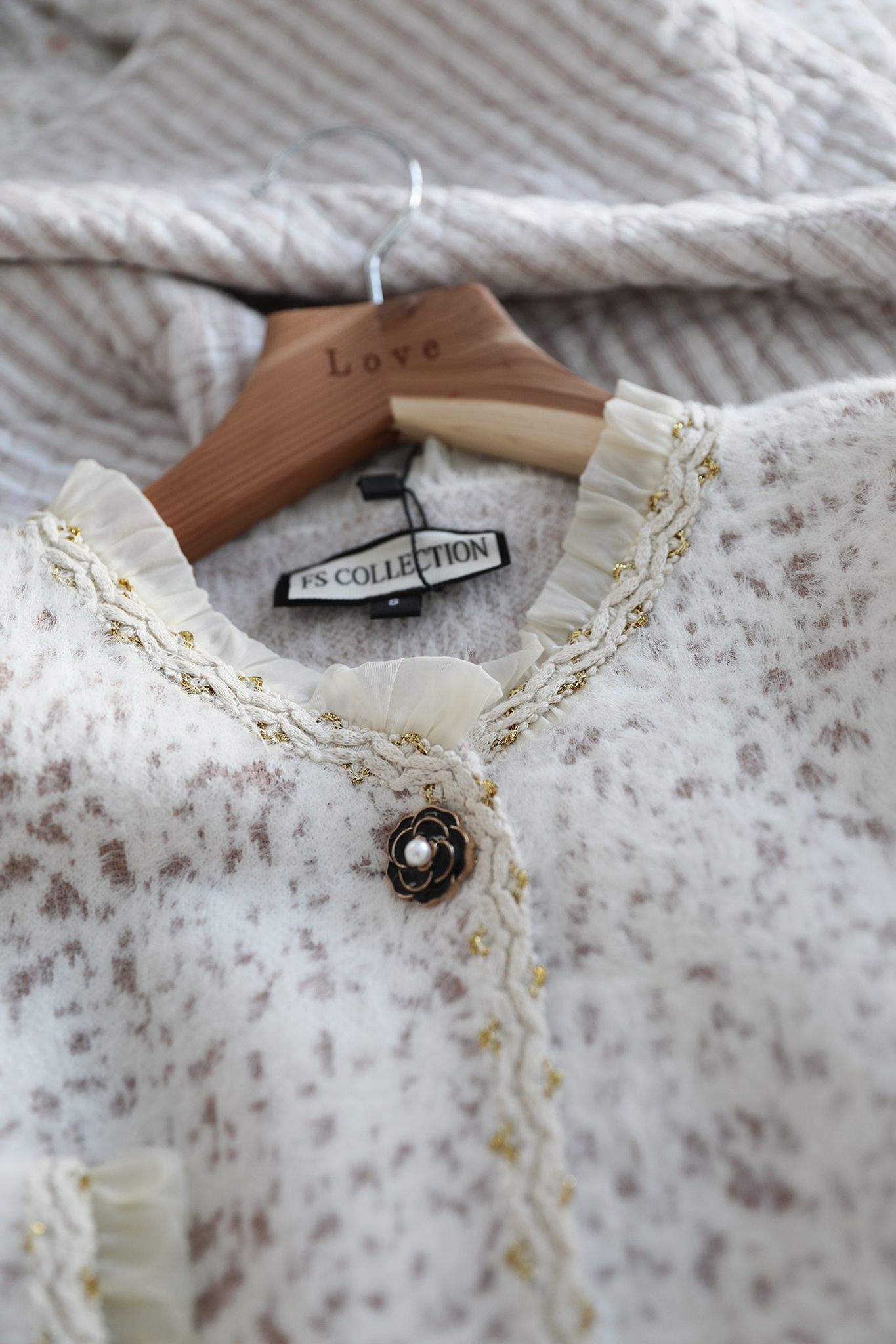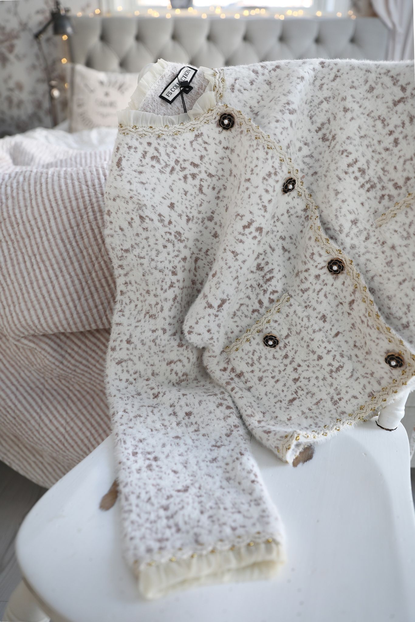 kruskanter i tyll, bandkanter med guldbroderi, vackra blomknappar och framfickor som ger ett omsorgsfullt och romantiskt uttryck. Älskar den subtila leopardmönstringen i rosa mot offwhite, så himla fint.