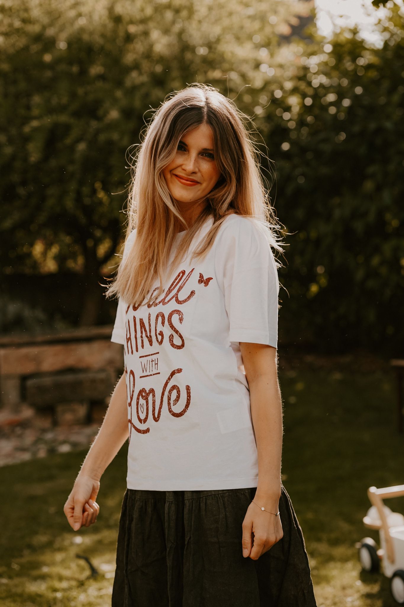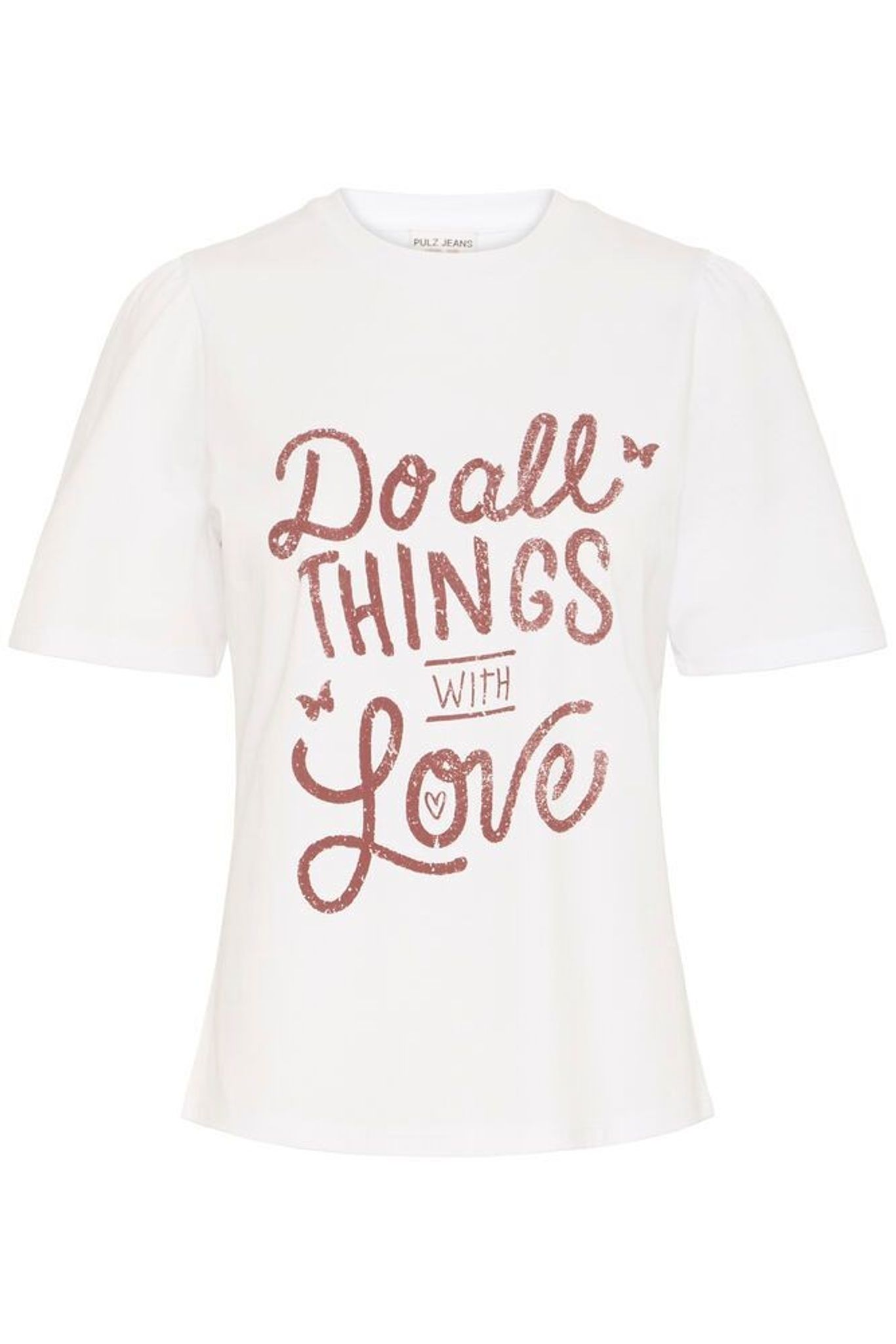 Söt T-shirt med puffärmar och kärleksfullt vinrött print. Härlig, bekväm modell med lite längre ärmar. Älskar att den är skön som en avslappnad tisha men lite finare med de långa puffärmarna.