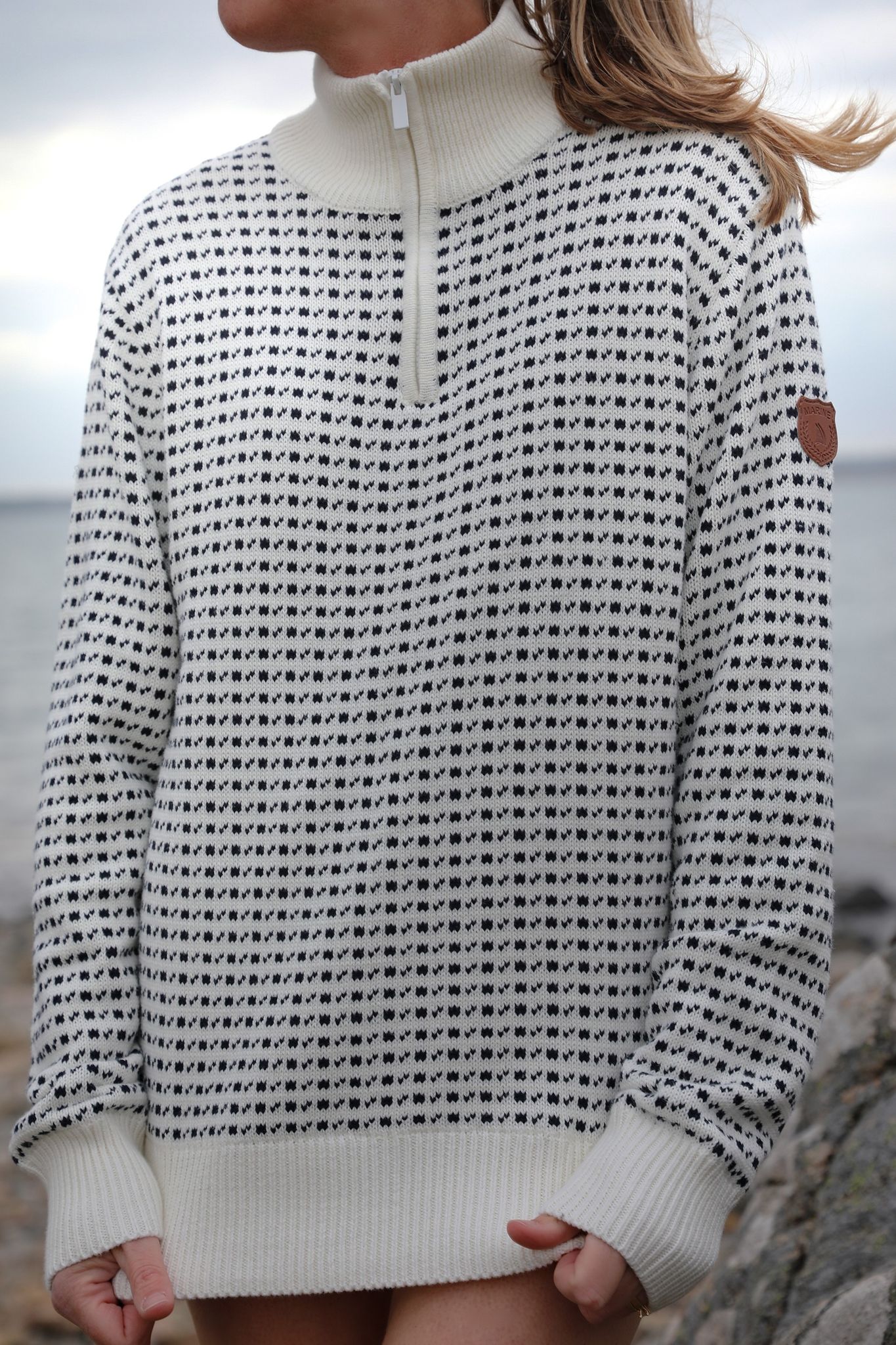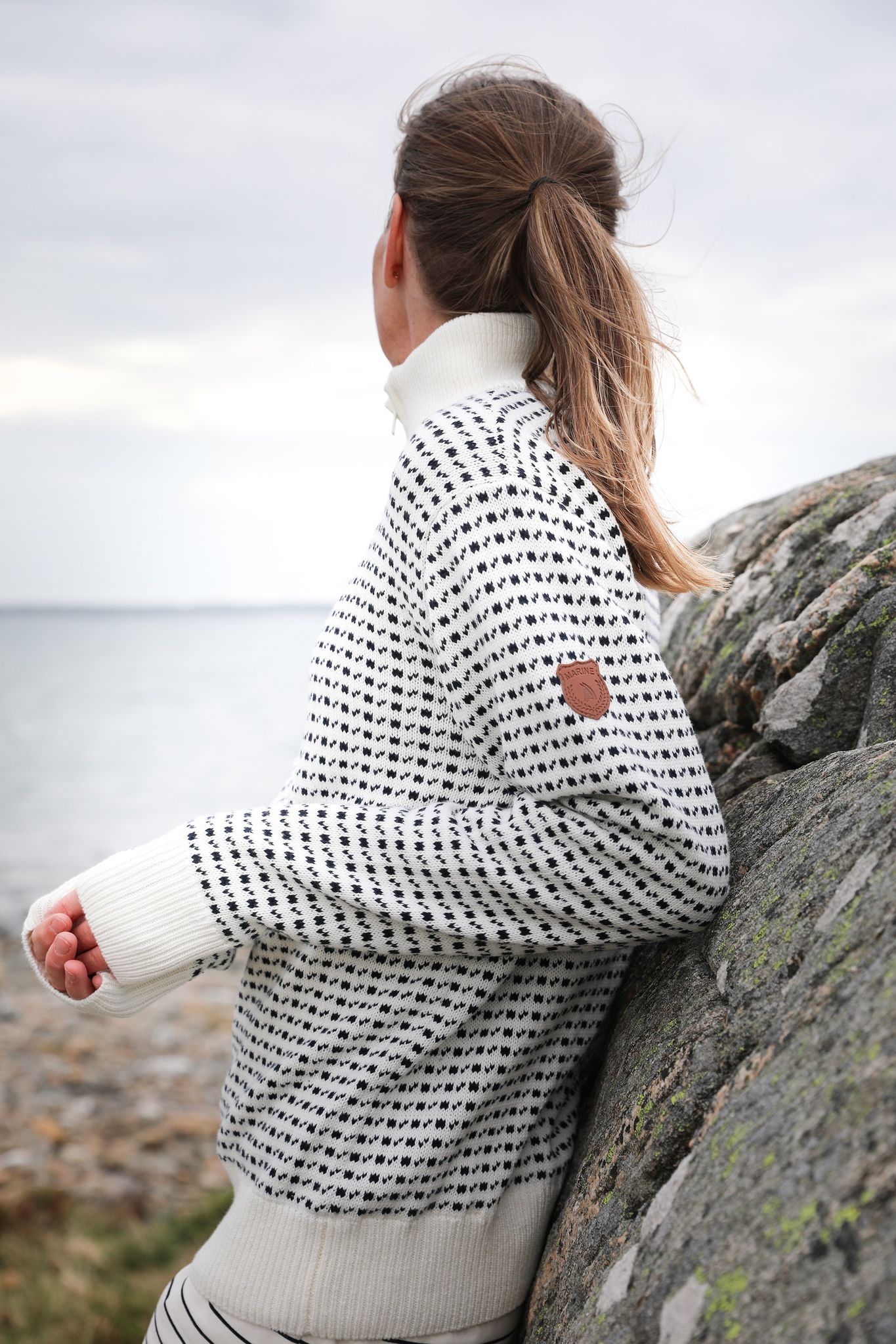 Offwhite fiskartröja i nordisk lusekoftestil, stickad i mjuk bomull med tunt foder
