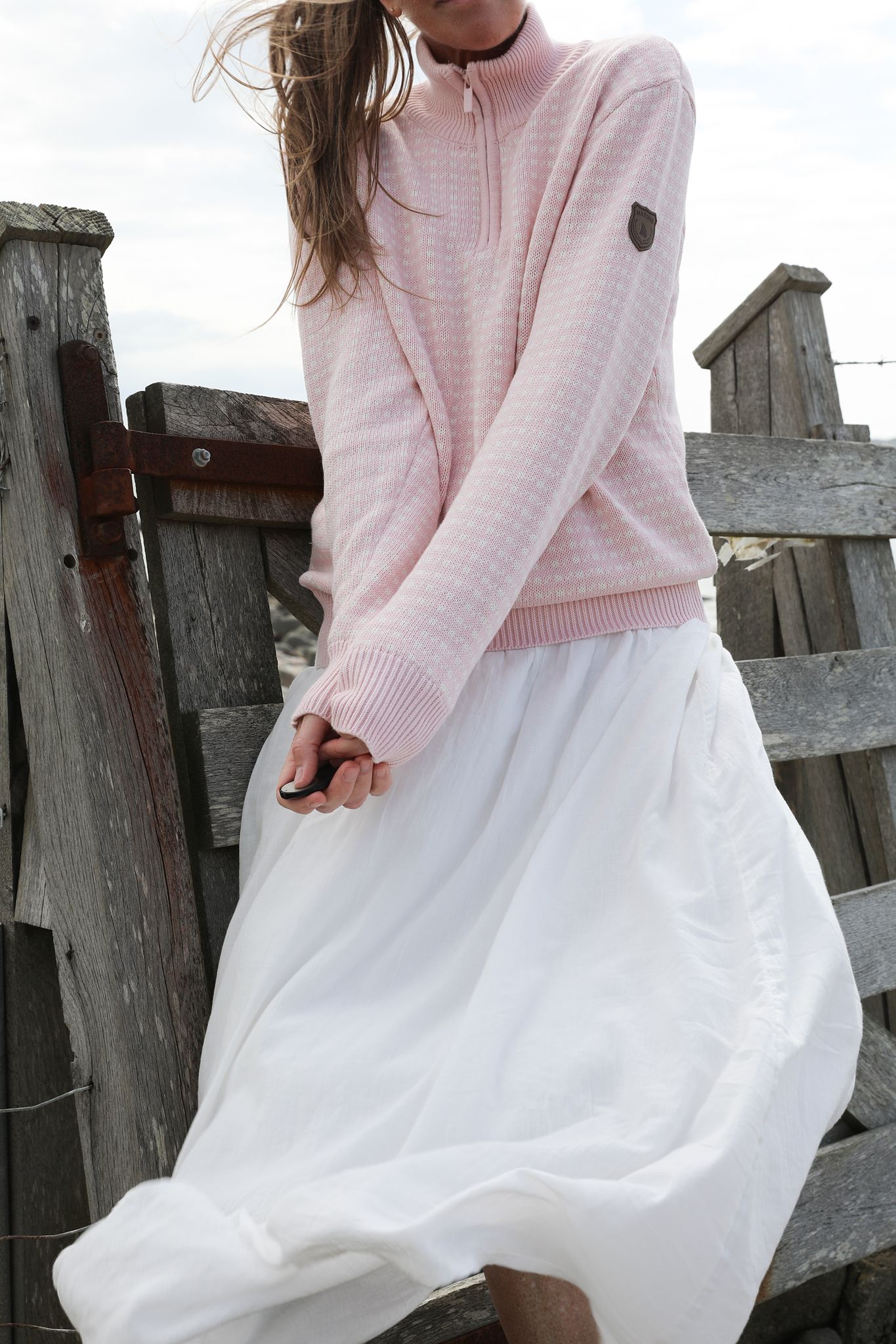 Mjuk fiskartröja i nordisk stil med stickat yttertyg i bomull, tunt vindstoppande foder och lätt oversized passform. En varm och omtyckt tröja som fungerar lika fint inomhus som ute under svalare dagar.