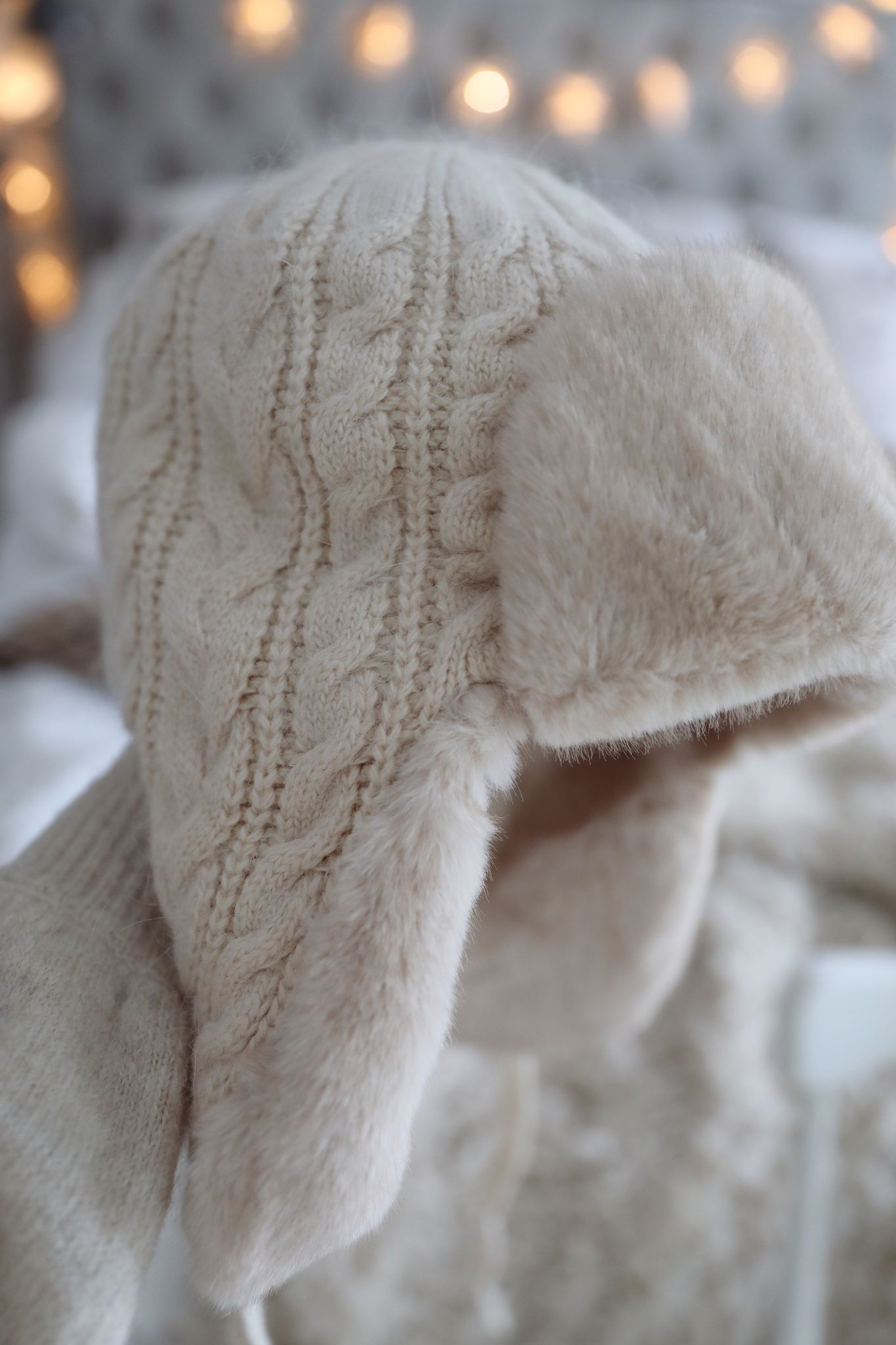 Öronlappsmössa i mjuk ullblandning. Väldigt gullig i beige kabelstickad ullbllandning med beige len fuskpäls i öronlappanrna och resten fodrad med len fleece. I denna behöver du aldrig frysa den är väldigt varm och gosig. Perfekt för kalla vinterutflykter, eller julmarknaden och så klart även en underbar julklapp. Även denna passar in i timmerstugestilen som känns så mysig, speciellt i juletid.