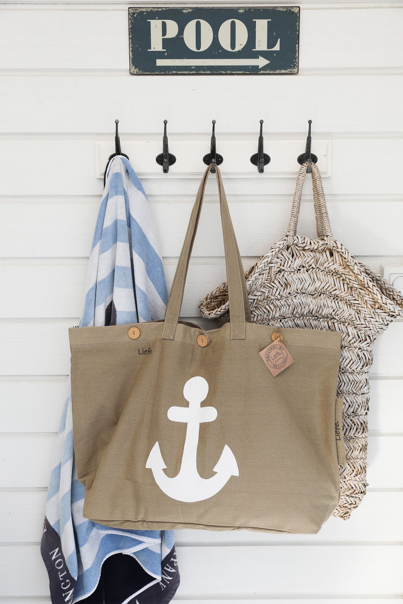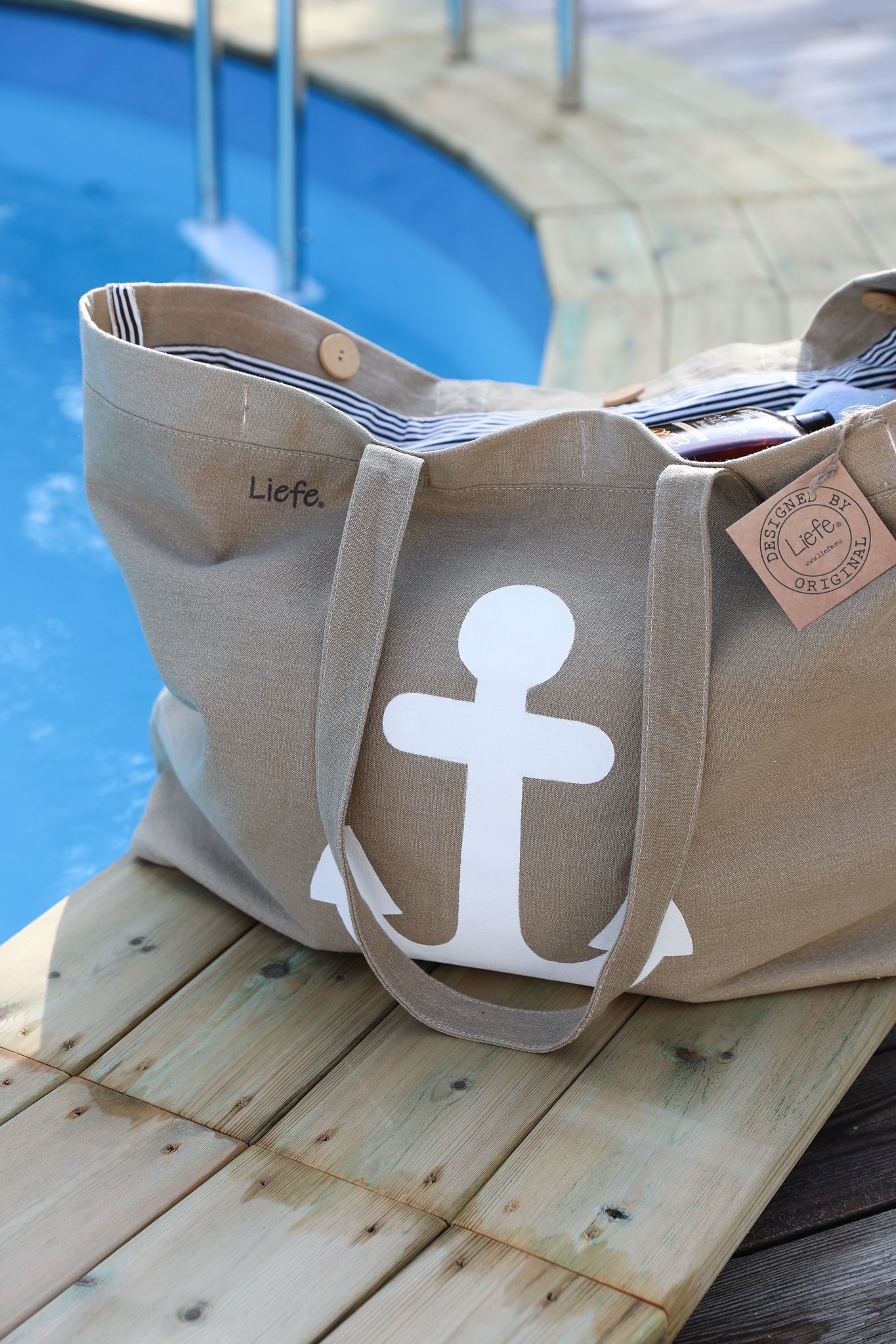 Perfekt som strandväska eller weekendväska. Det får plats mycket packning i denna. Väskan är fodrad med randigt bomullsfoder i blått och vitt och har ett fack med dragkedja inuti för telefon nycklar och andra värdesaker. Väskan stängs med stora träknappar.