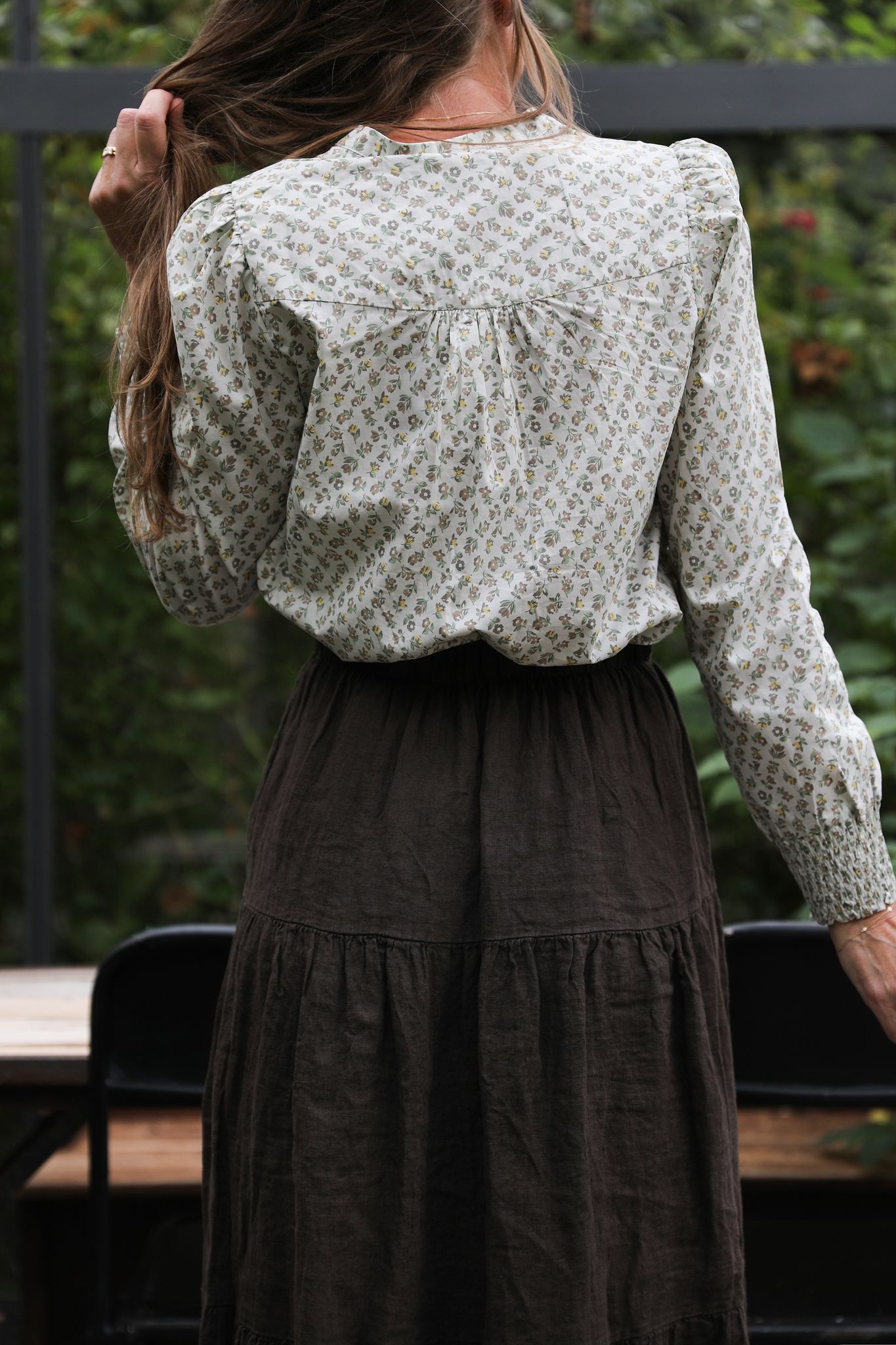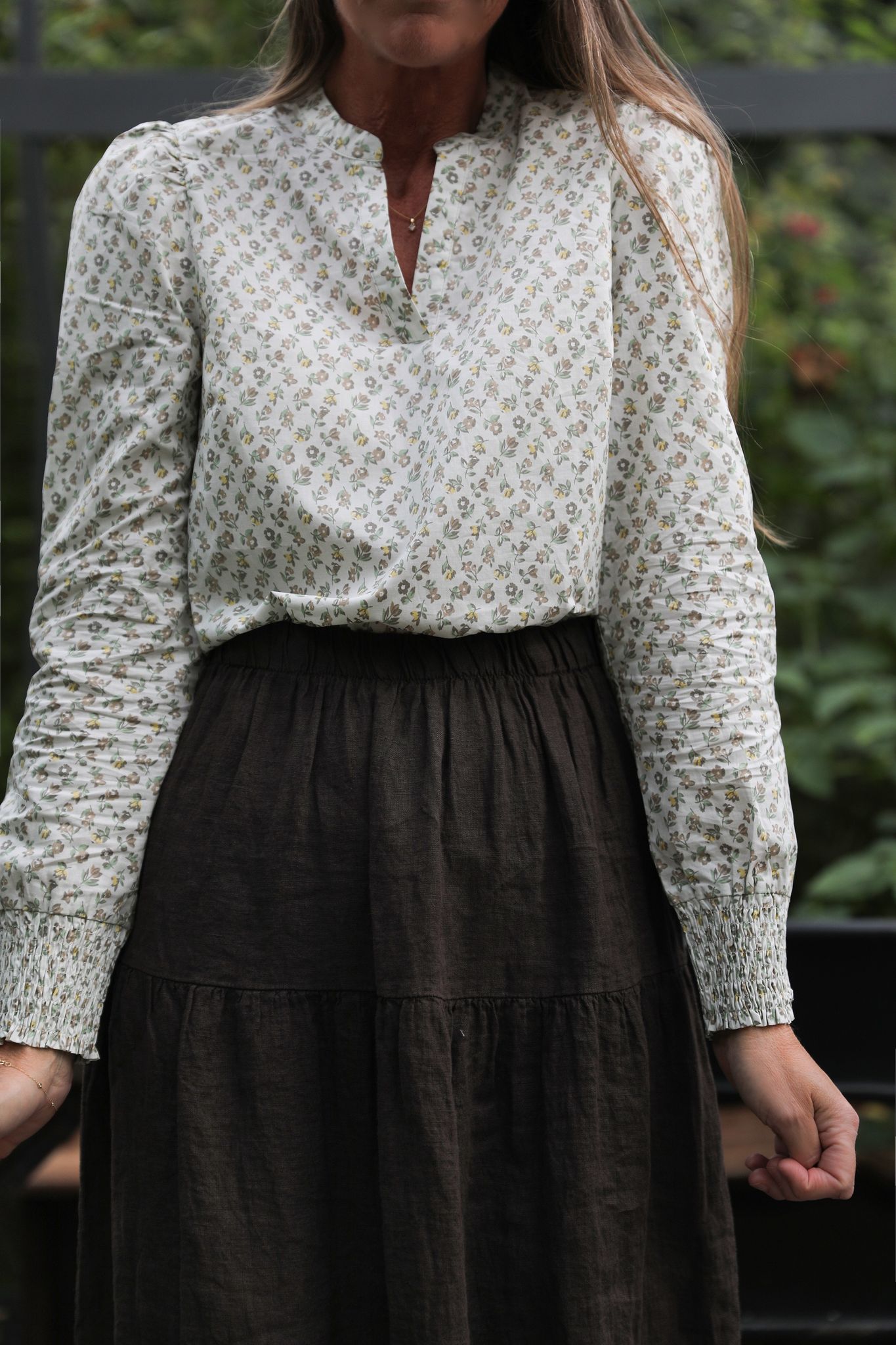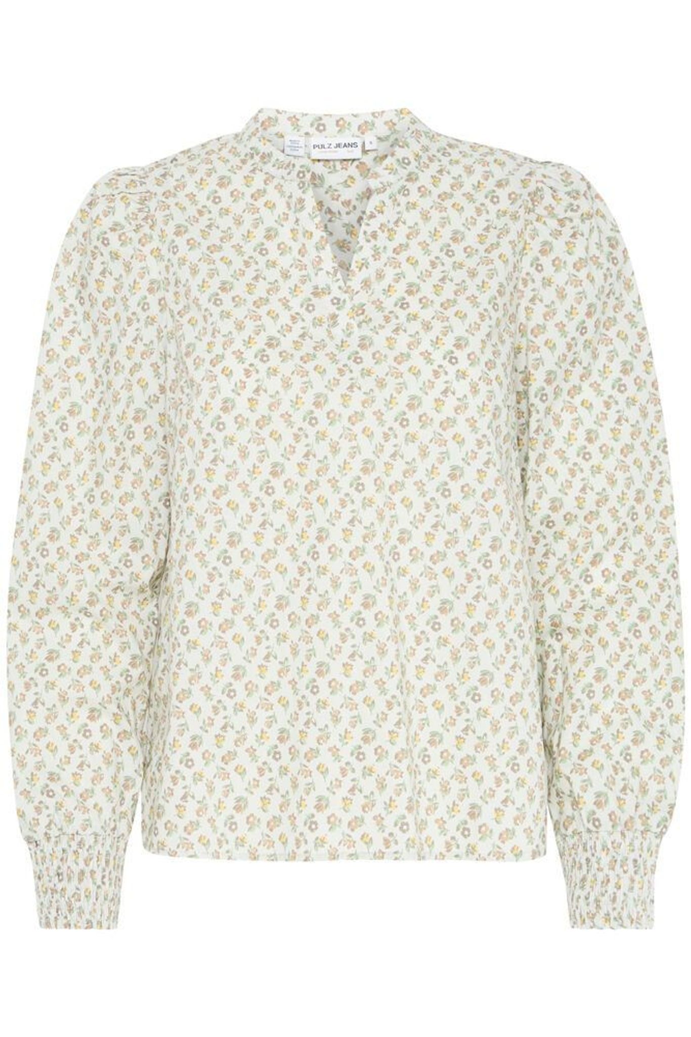 Blommig blus med kinakrage och puffärmar, smocksöm i ärmsluten. Så söt modell som blir lika fin till dina favoritjeans som våra fina volangkjolar i linne.