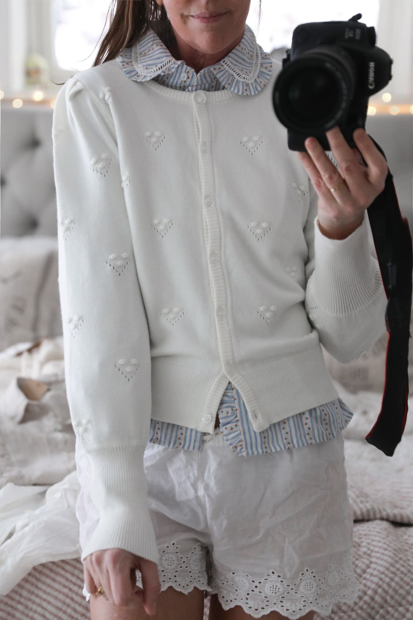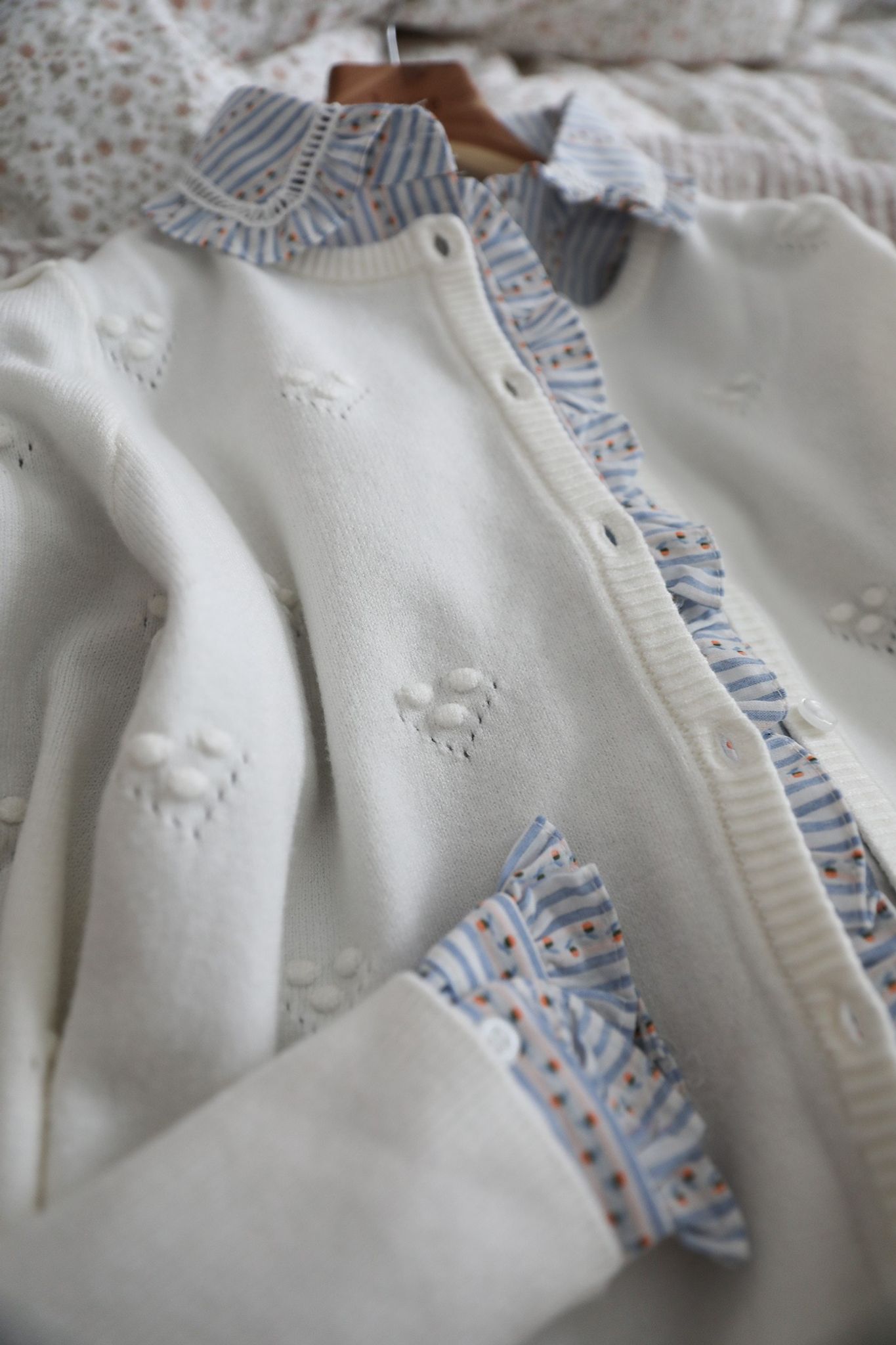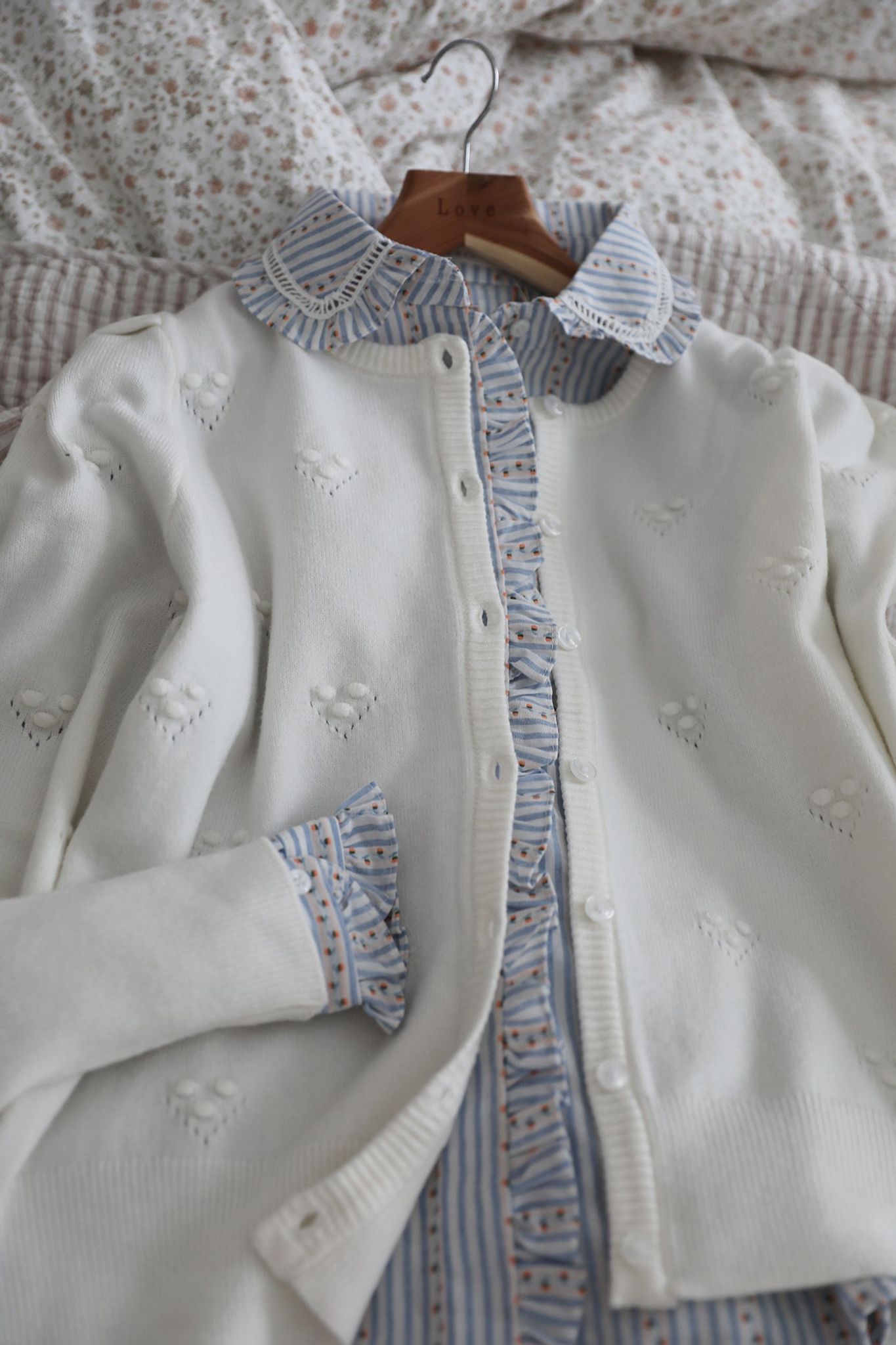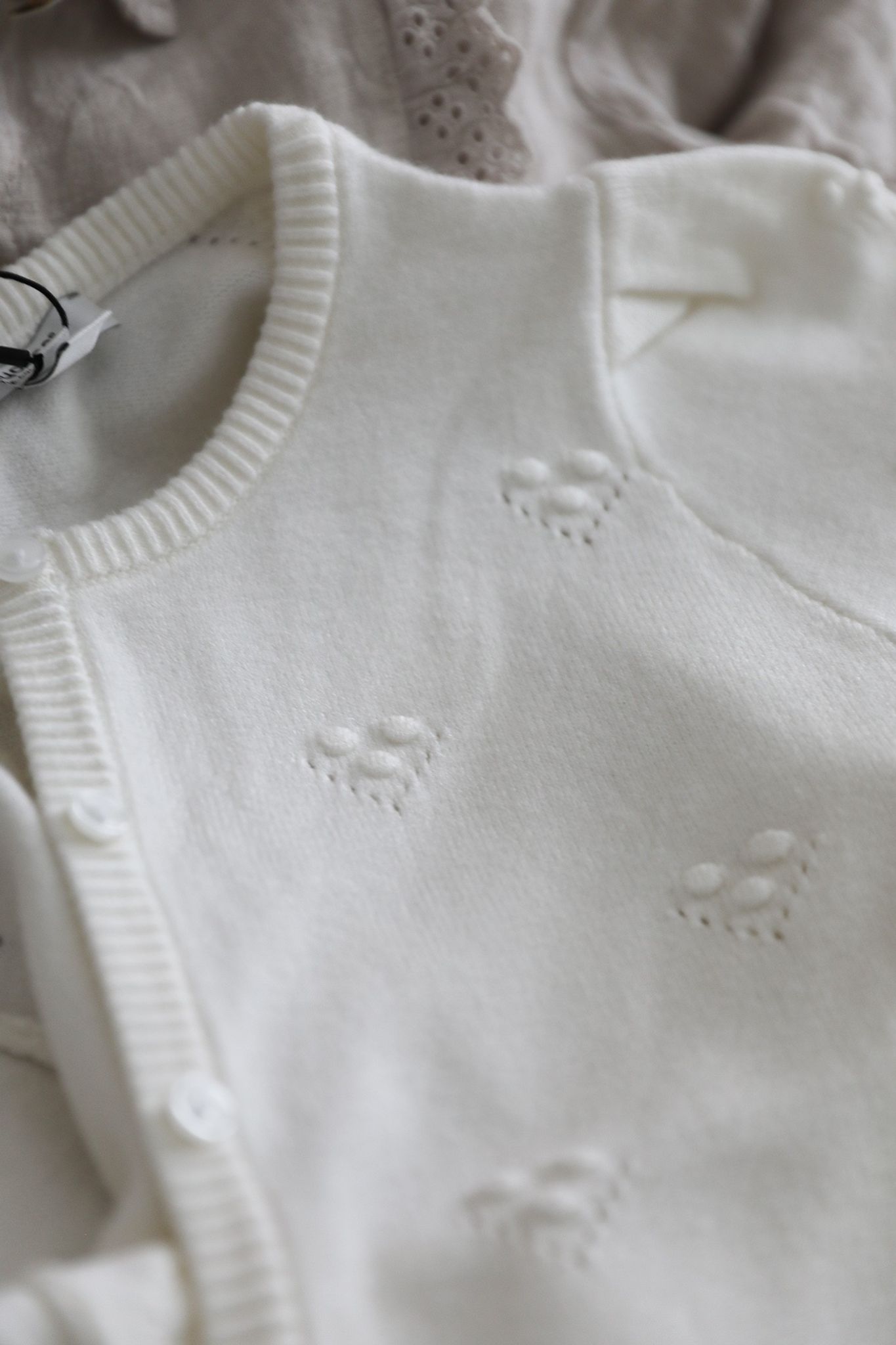 En jättesöt kofta i romantisk, lantlig stil med puffärmar och långa ärmmuddar. Stickad med fin stickteknik med subtilt och gulligt hjärtmönster över hela koftan. Väldigt mjuk och skön och passar till det mesta.
