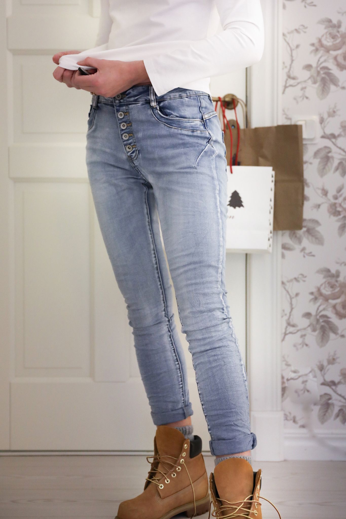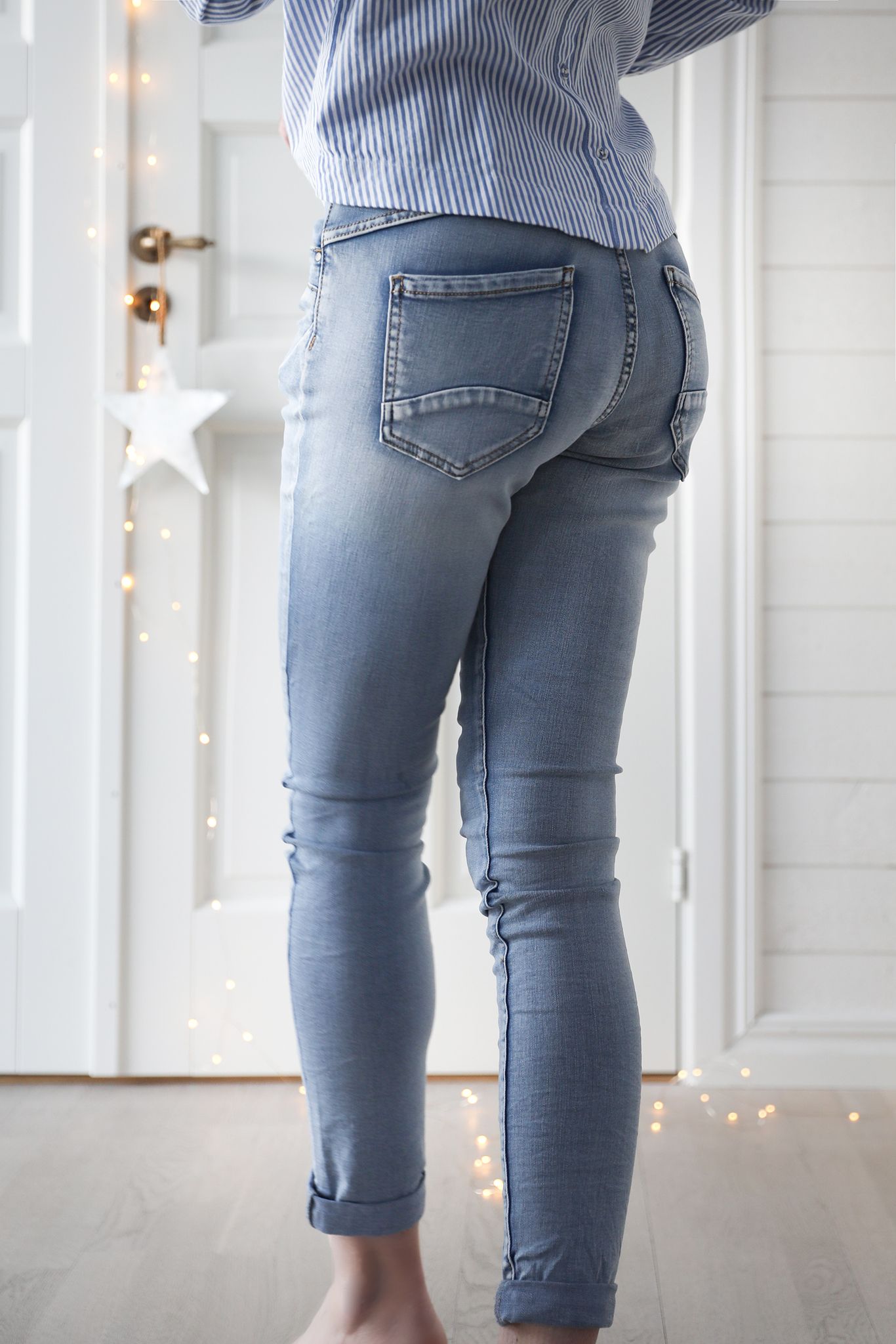 Jeans i favoritmodell ljusblå med mjuk stretch och knappar i gylfen