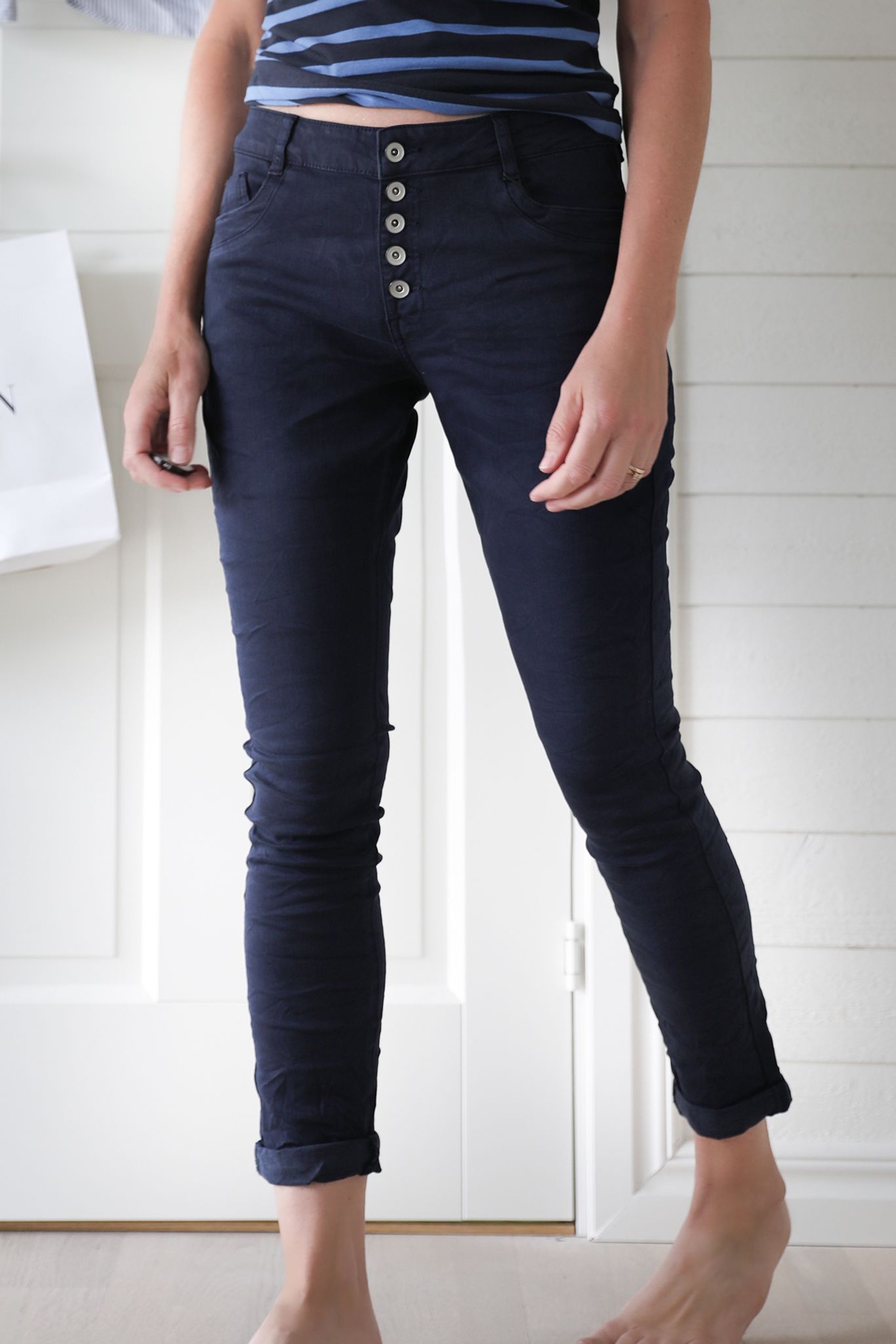 Jeans i favoritmodell marinblå med mjuk stretch och knappar i gylfen