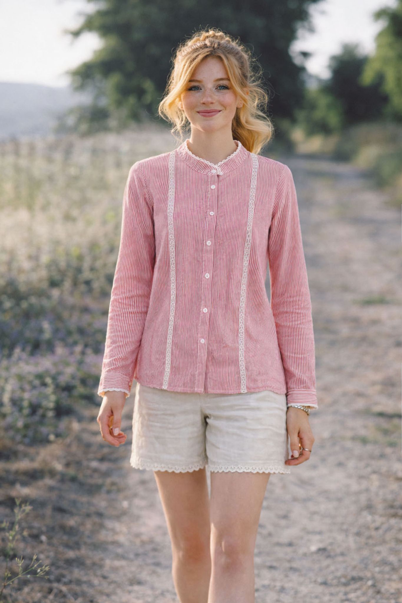En rödvit randig bomullsblus som känns som sommar på landet. Tunn och mjuk i 100% bomull, med smala ränder i rött och vitt och små spetsdetaljer som gör den extra fin.