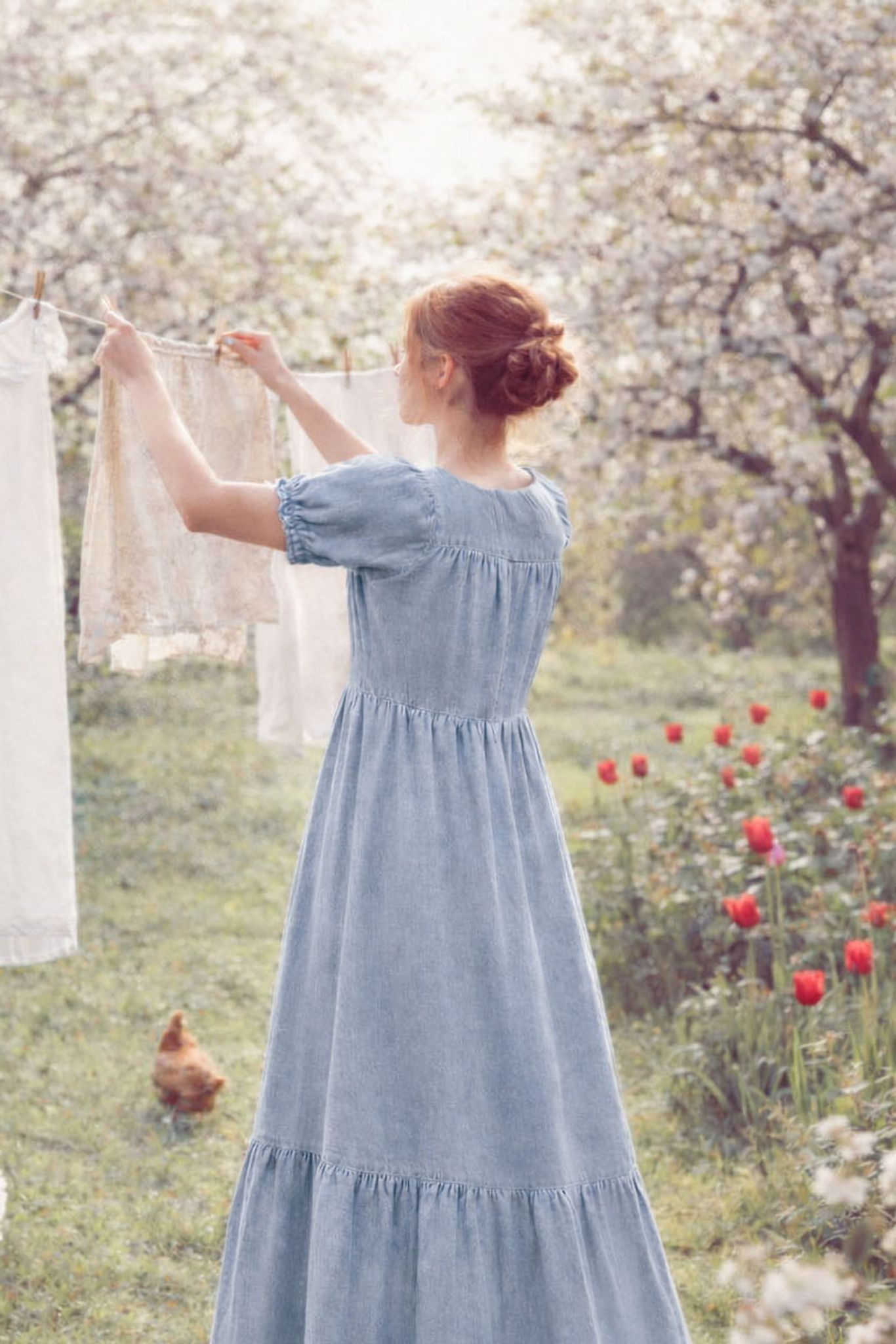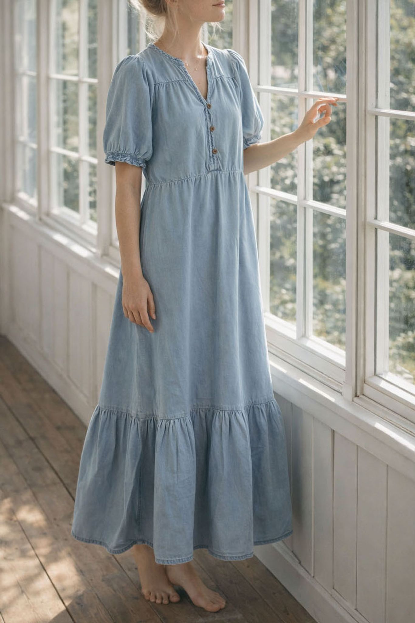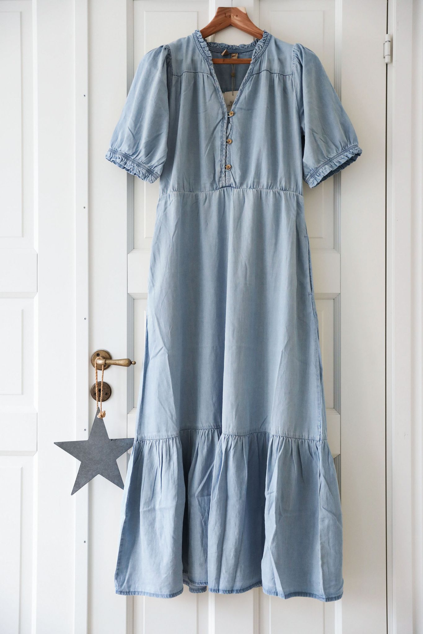 Bomullsdenimen är tunn och följsam med ett fint fall och lyocell gör den väldigt mjuk och len. Jeansklänningen är i lantlig modell med puffärm, kruskant runt halskant och ärmslut, v-ringning och liten knappslå med bruna söta knappar. Klänningen har avskärning vid bröstet och går ut i en vid kjol med en romantisk volang.