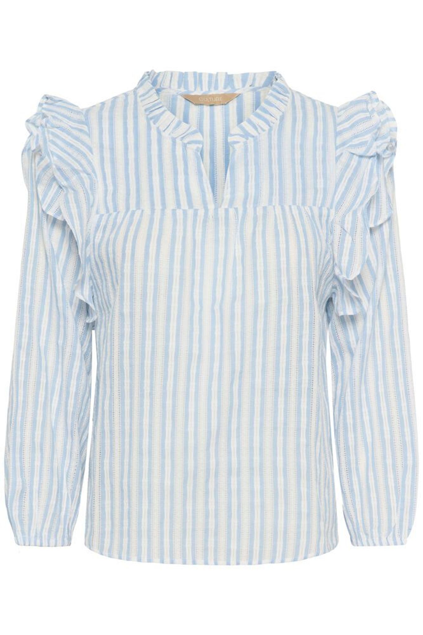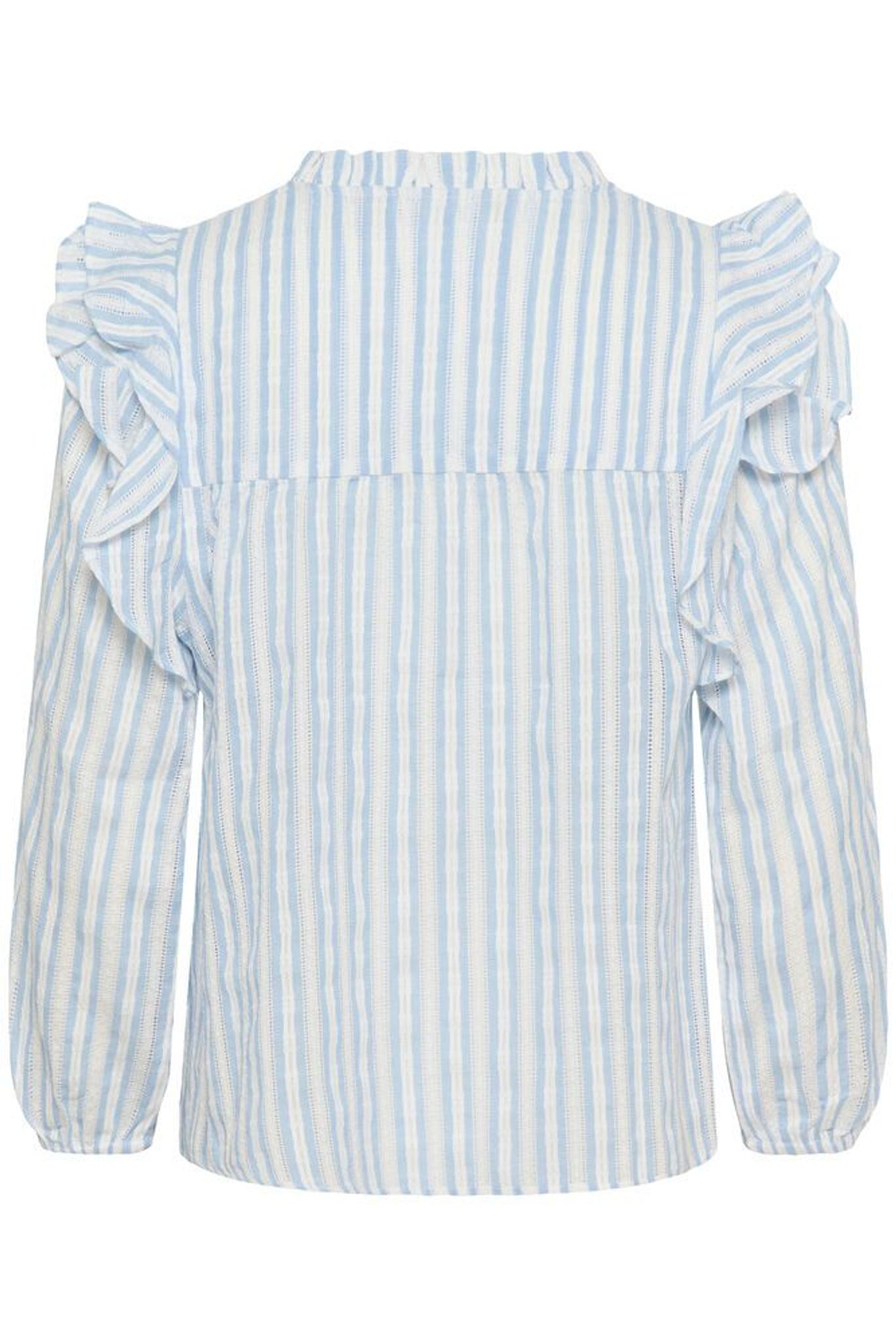 Ljusblå randig blus i mjuk bomull med volanger och krusad ringning