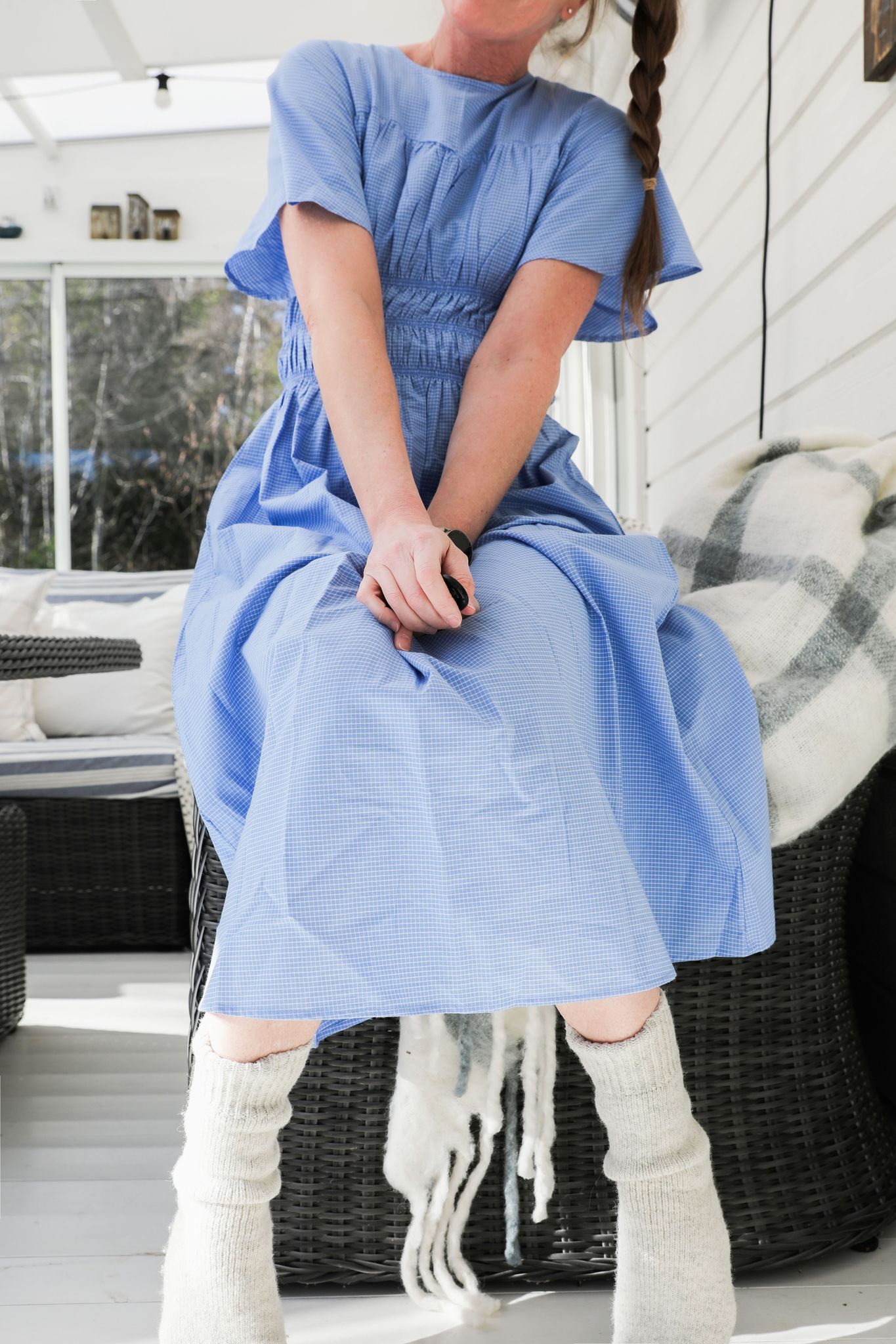 En somrig klänning i ljusblå bomullsväv med små, tunna vita linjer som bildar ett mjukt rutmönster. Tyget känns svalt och lätt mot huden och har den där fina, naturliga strukturen som bomullsväv får.
