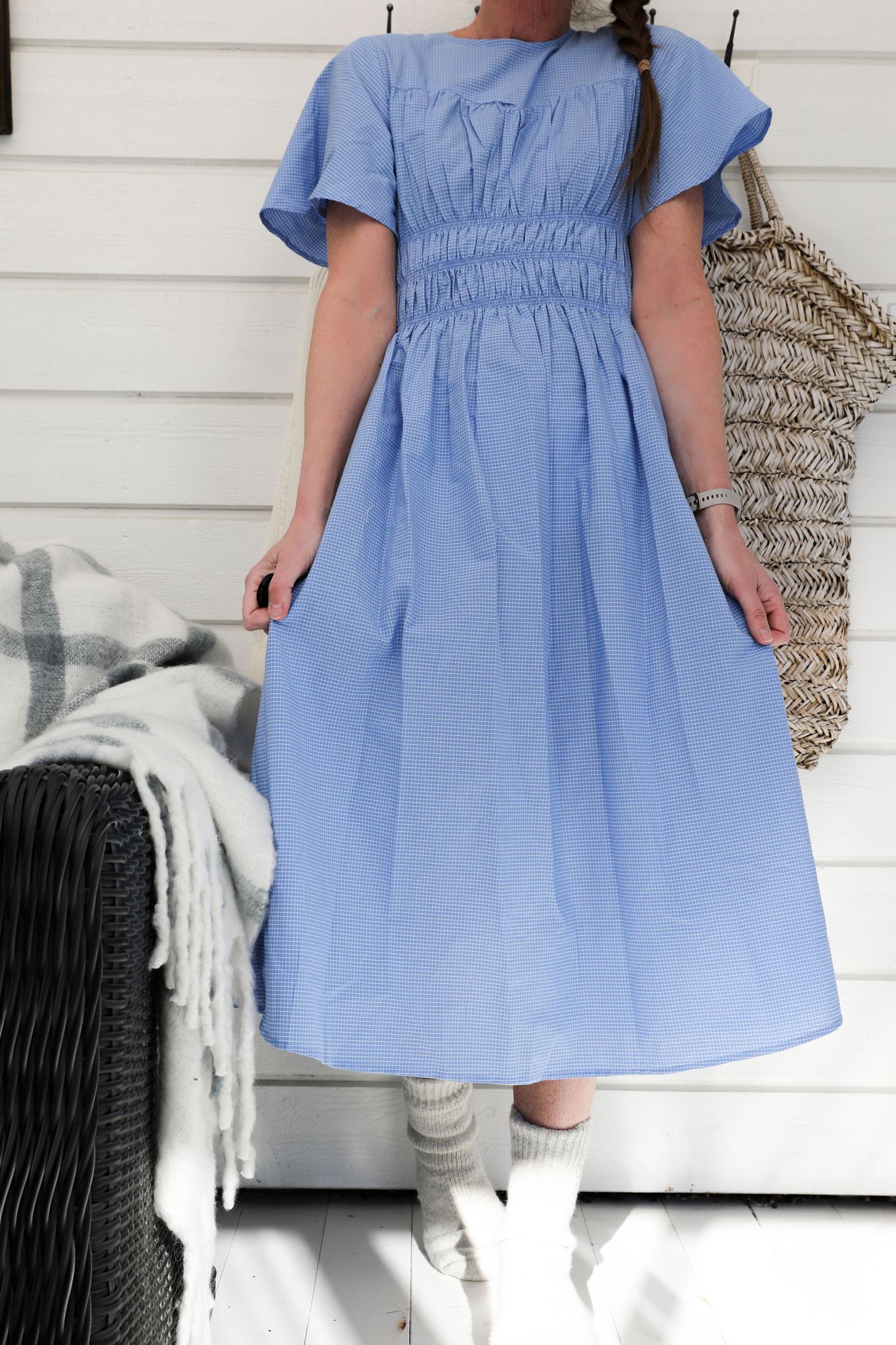 En ljusblå klänning med små rutor och smickrande smock
