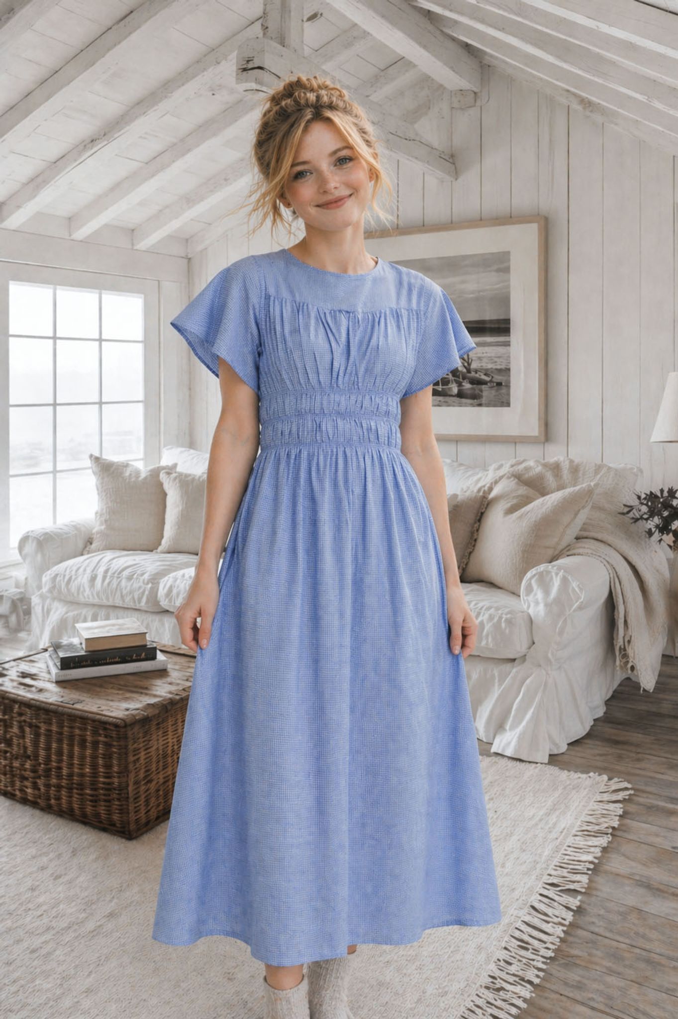 Den smockade midjan formar sig mjukt och sitter bekvämt, samtidigt som den ger klänningen en fin silhuett. Överdelen är lätt rynkad och möter en kjol som faller mjukt ner i en midilängd.