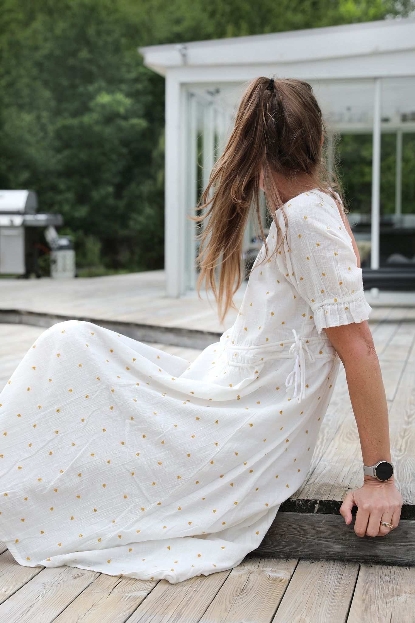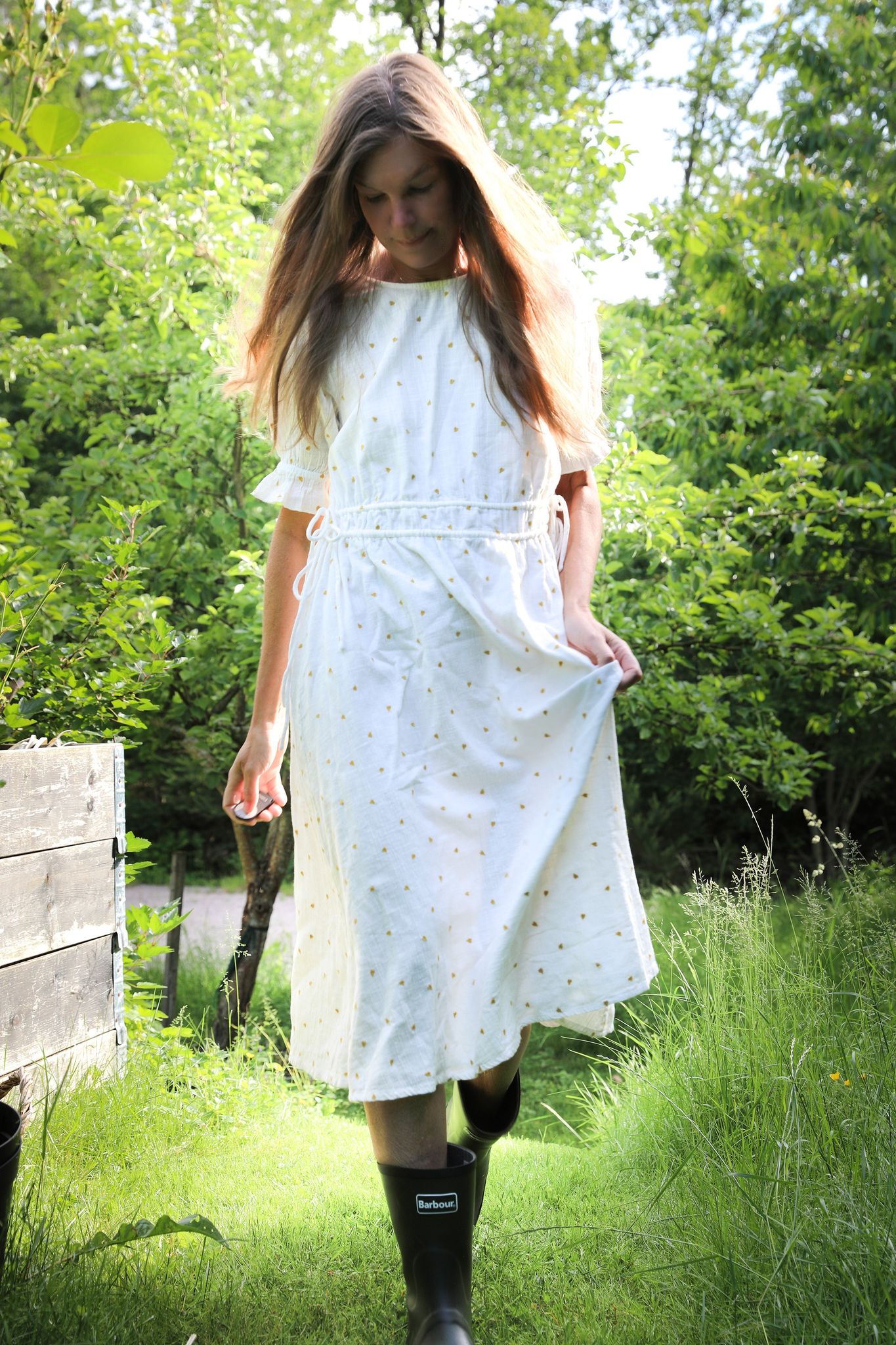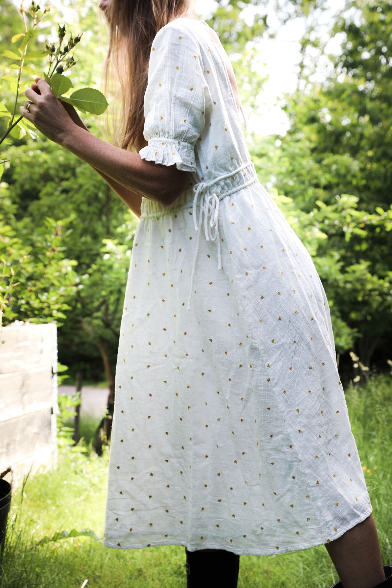 Alltså denna klänning, finare får man leta efter. Lätt creppat bomullstyg med rara små guldhjärtan broderade över hela klänningen. Supersöt modell med öppen rygg och knytband i nacken, dragsko i midjan som knyts till rosetter i sidorna. En helt ljuvlig sommarklänning som även blir fin med en kofta över om vädret inte är varmt nog att gå med bar rygg.