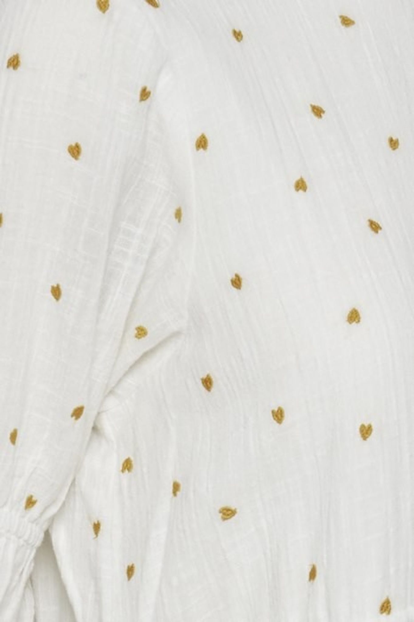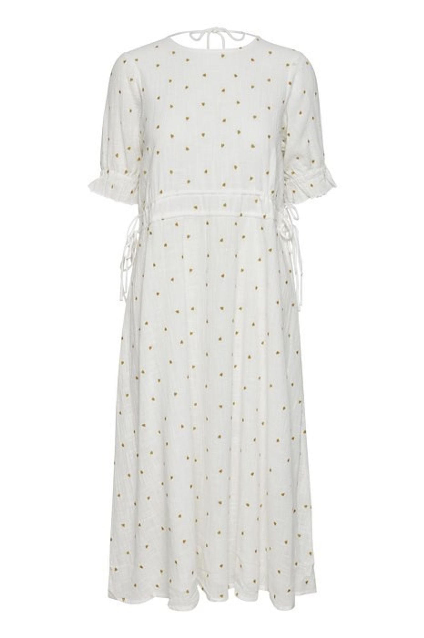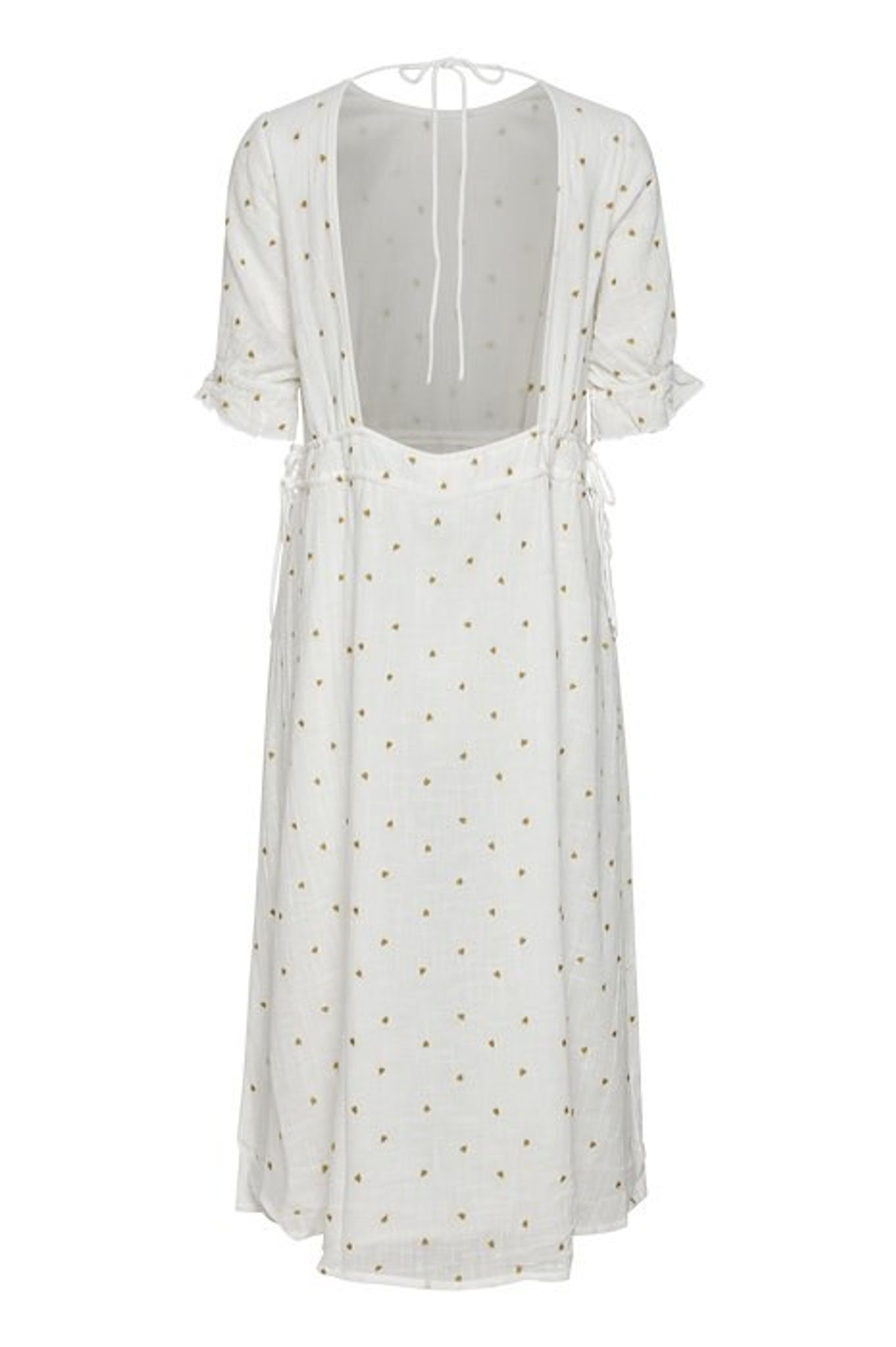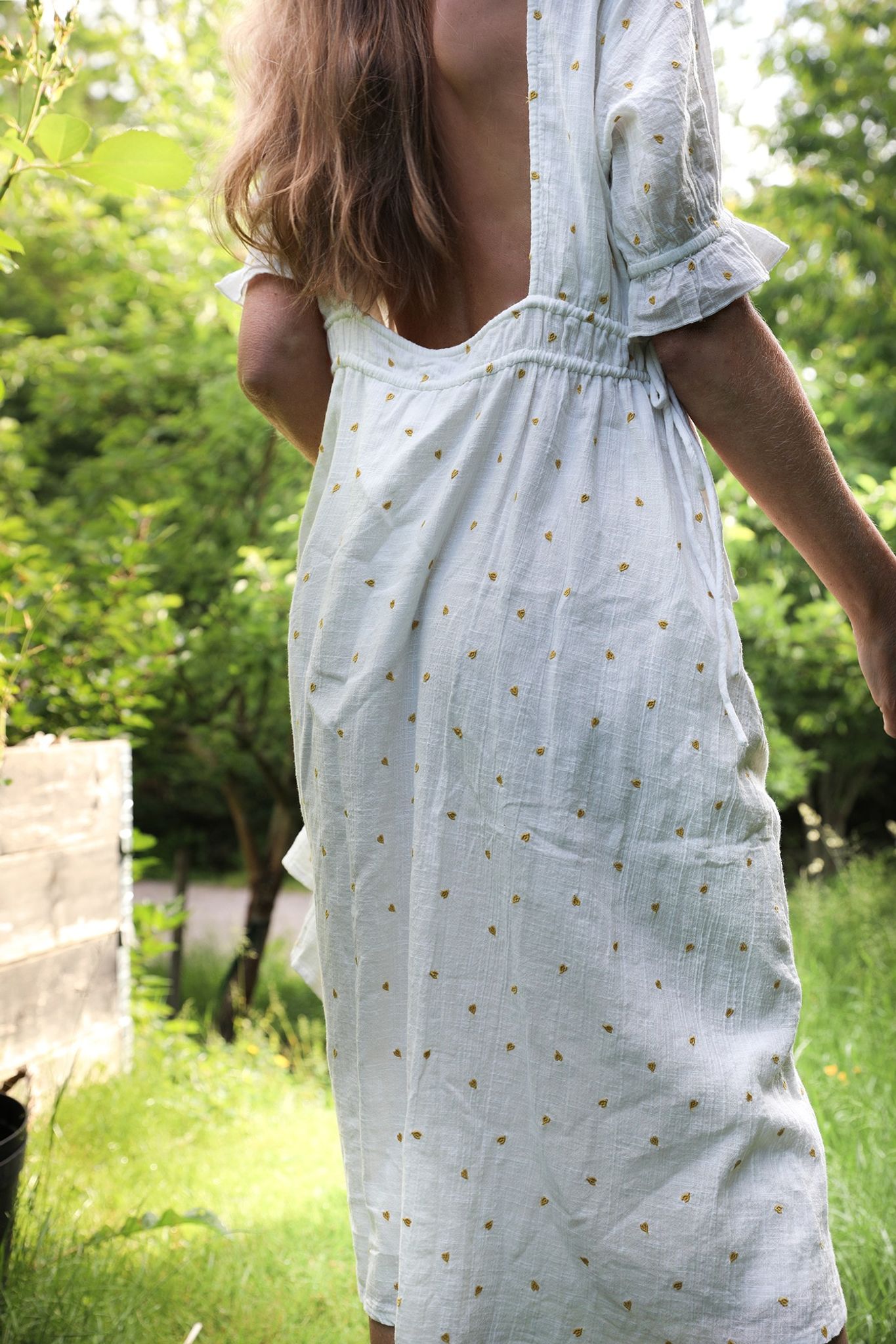Alltså denna klänning, finare får man leta efter. Lätt creppat bomullstyg med rara små guldhjärtan broderade över hela klänningen. Supersöt modell med öppen rygg och knytband i nacken, dragsko i midjan som knyts till rosetter i sidorna. En helt ljuvlig sommarklänning som även blir fin med en kofta över om vädret inte är varmt nog att gå med bar rygg.