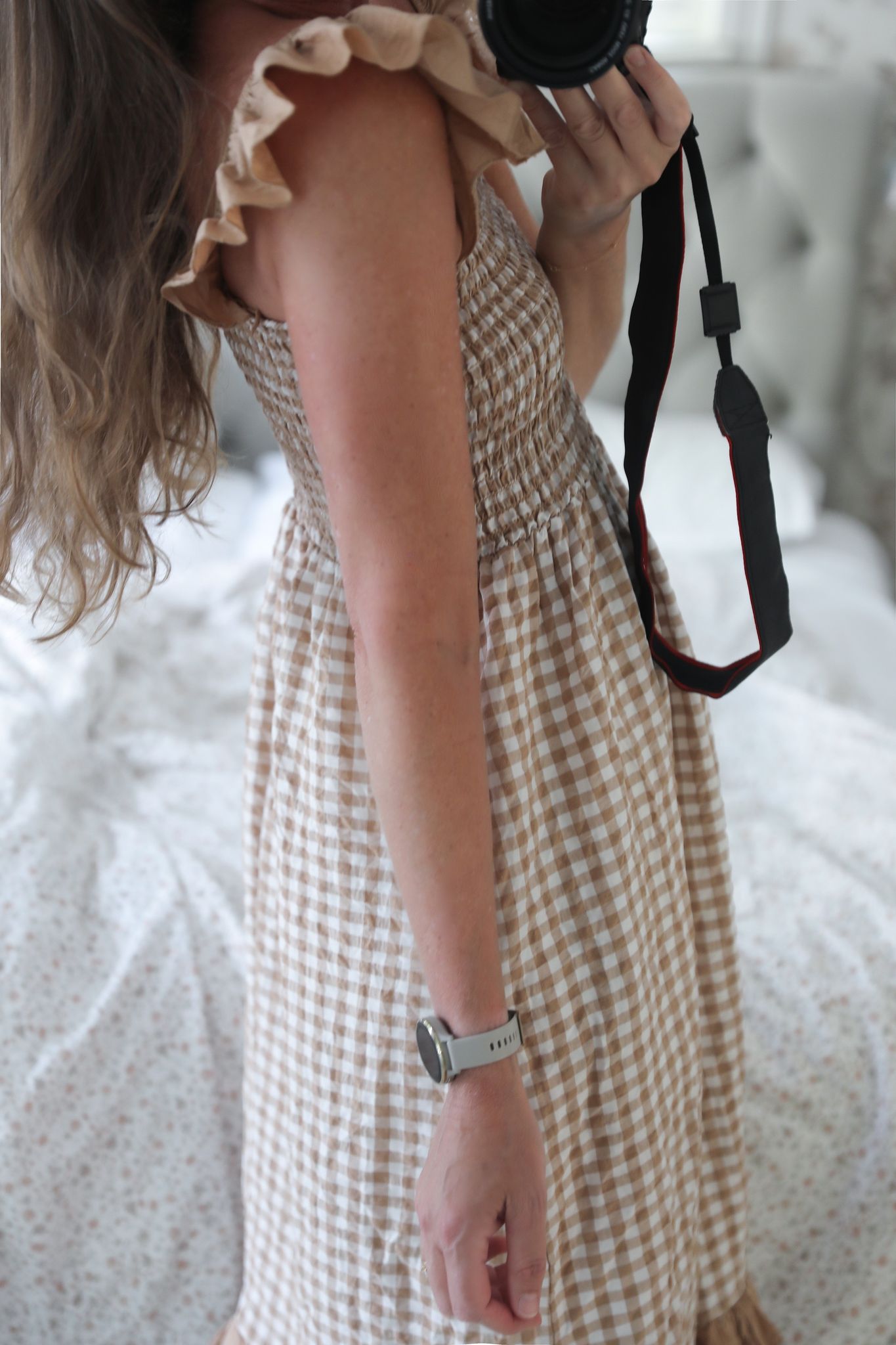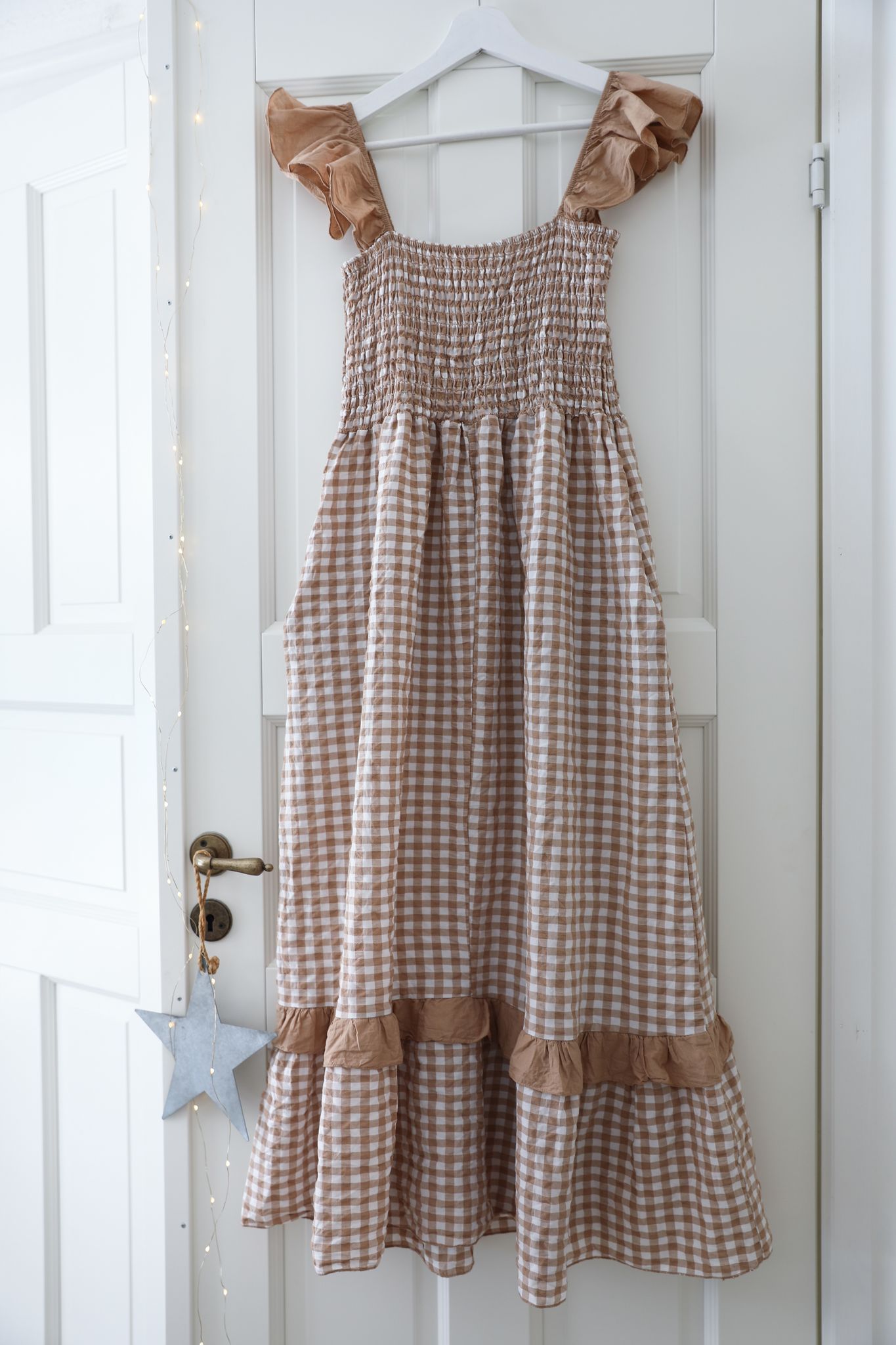 i mjukt beige och vitt. En lantlig dröm till sommarklänning i härligt rutigt bomullstyg i bäckebölja. Klänningen har praktiska sidfickor och fina volangdetaljer. Den sobra beige färgen gör att klänningen kommer att kännas aktuell långt in på sensommaren med kofta över om det är en lite kallare sensommardag, eller när kvällskylan smyger sig på.