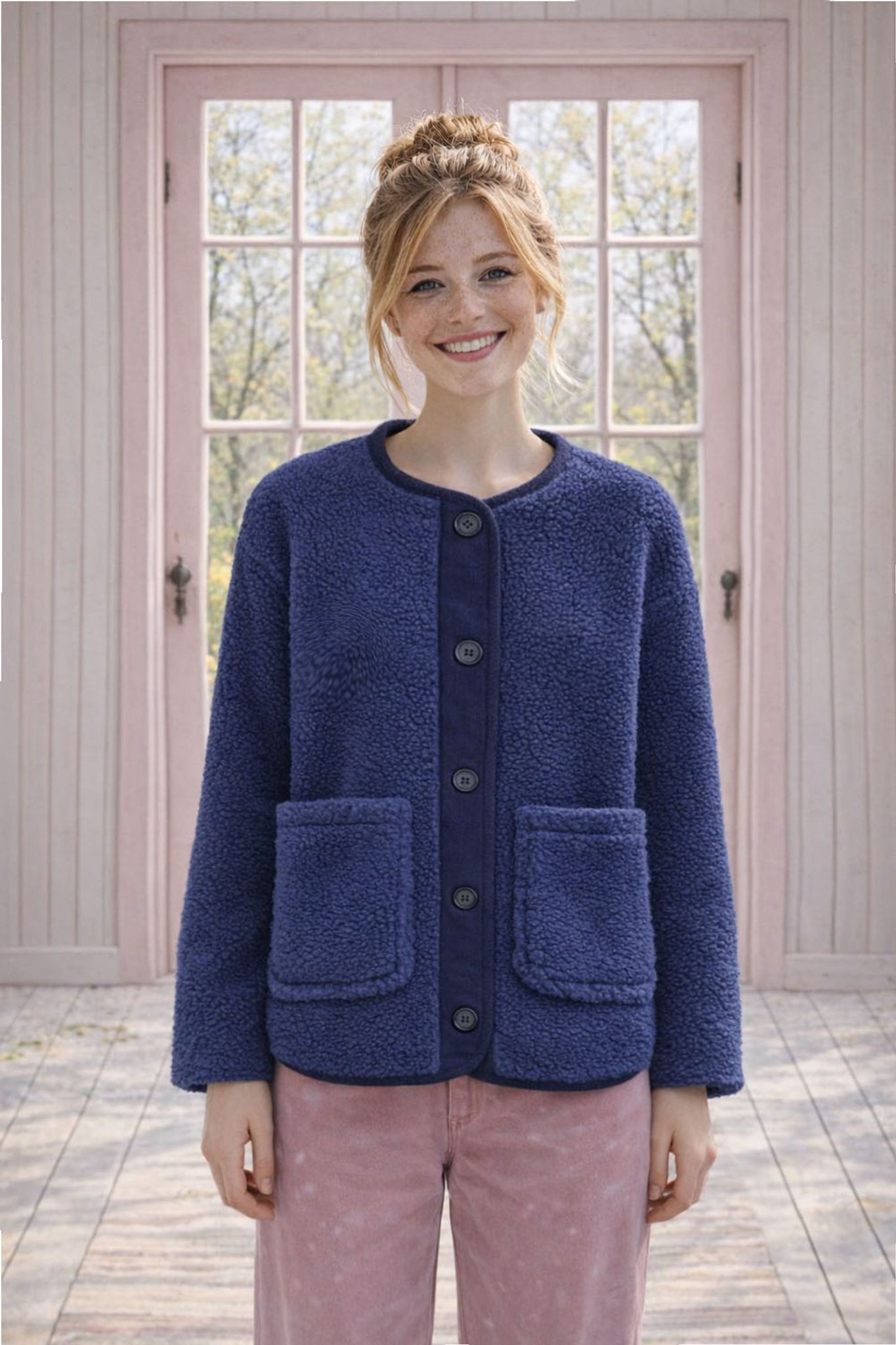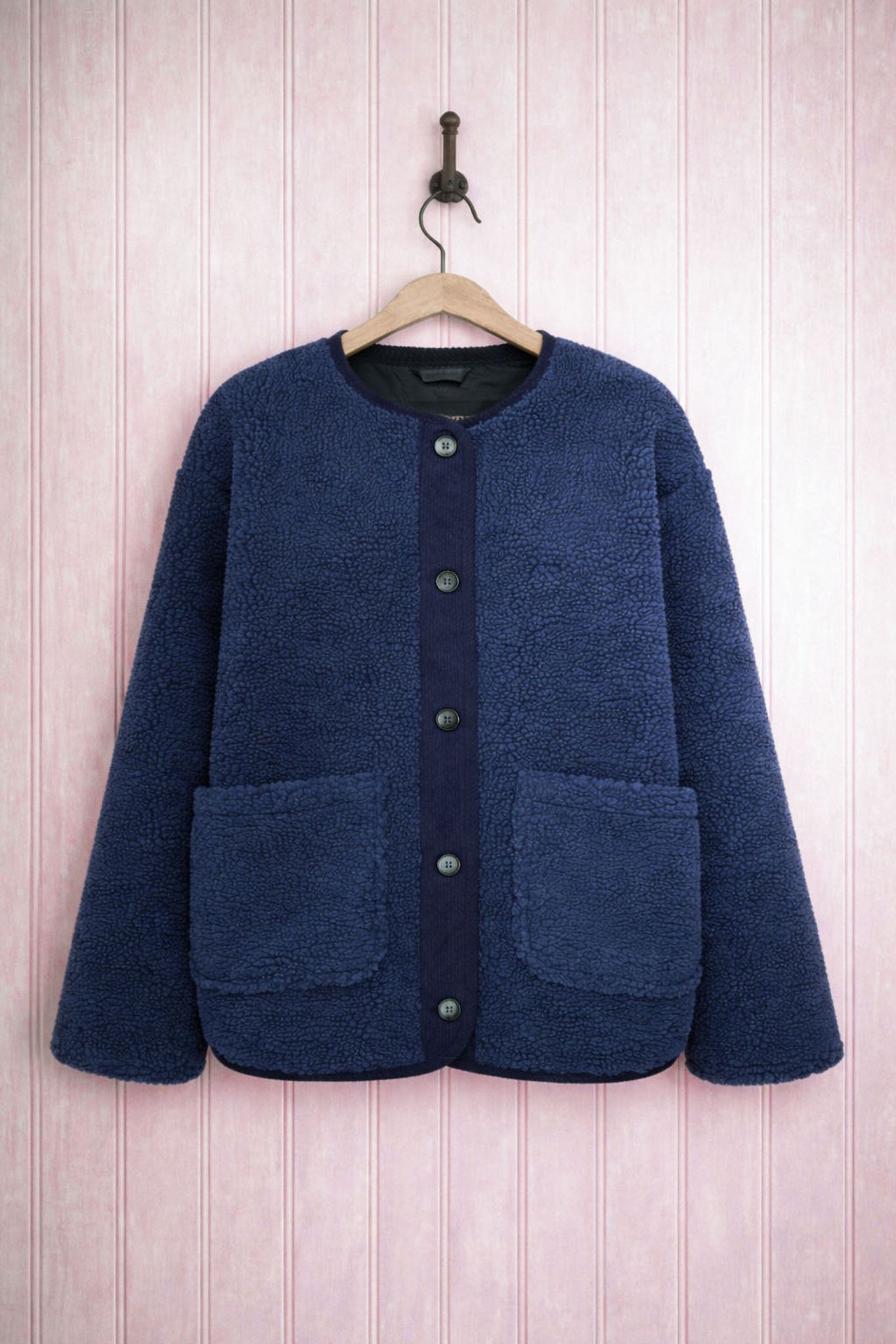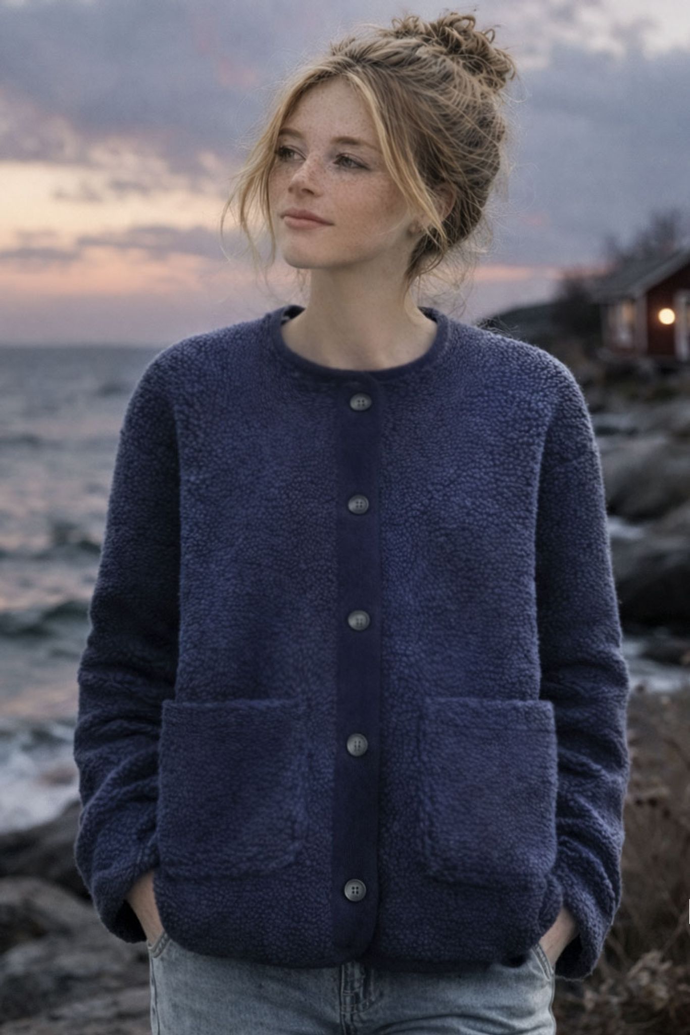 En mjuk teddytröja i mörkblått som är skön att ta på när det blir lite svalare.