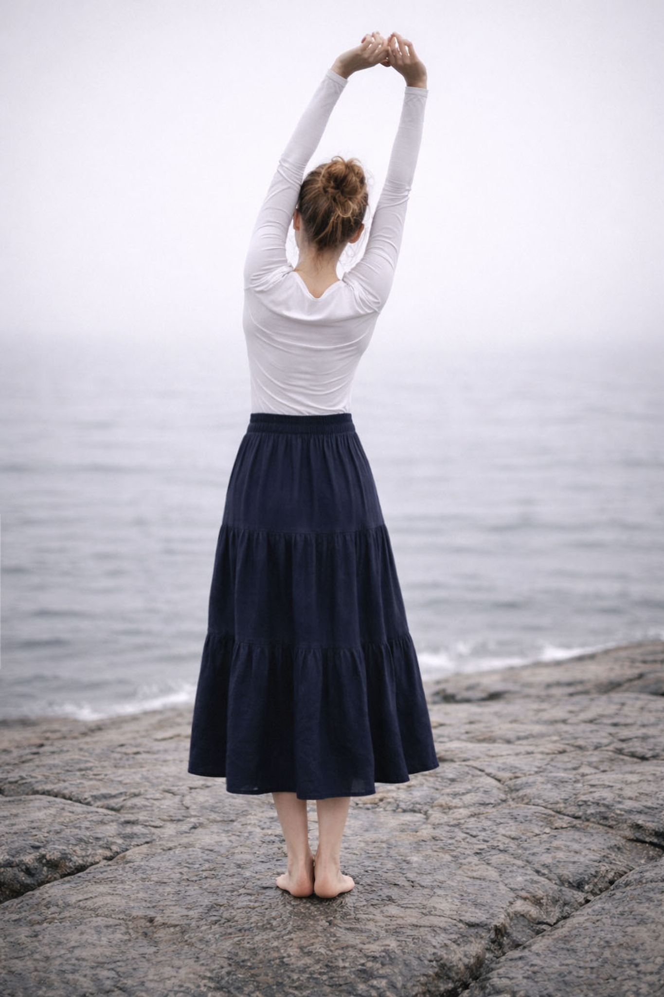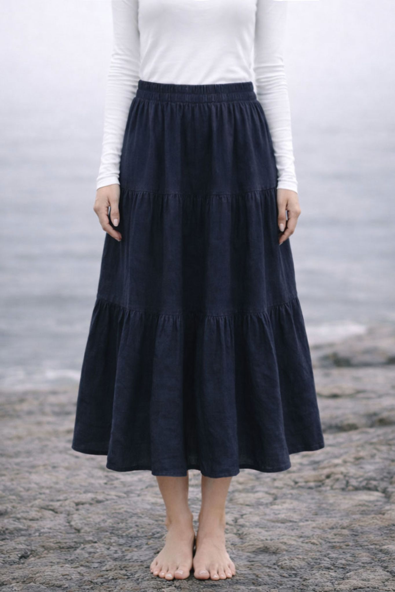 Lång mörkblå linnekjol med mjuka volanger och vacker vidd, sydd i 100% tvättat linne med en naturligt skrynklig känsla. En följsam och bekväm modell med elastisk midja som passar storlek 36–42.