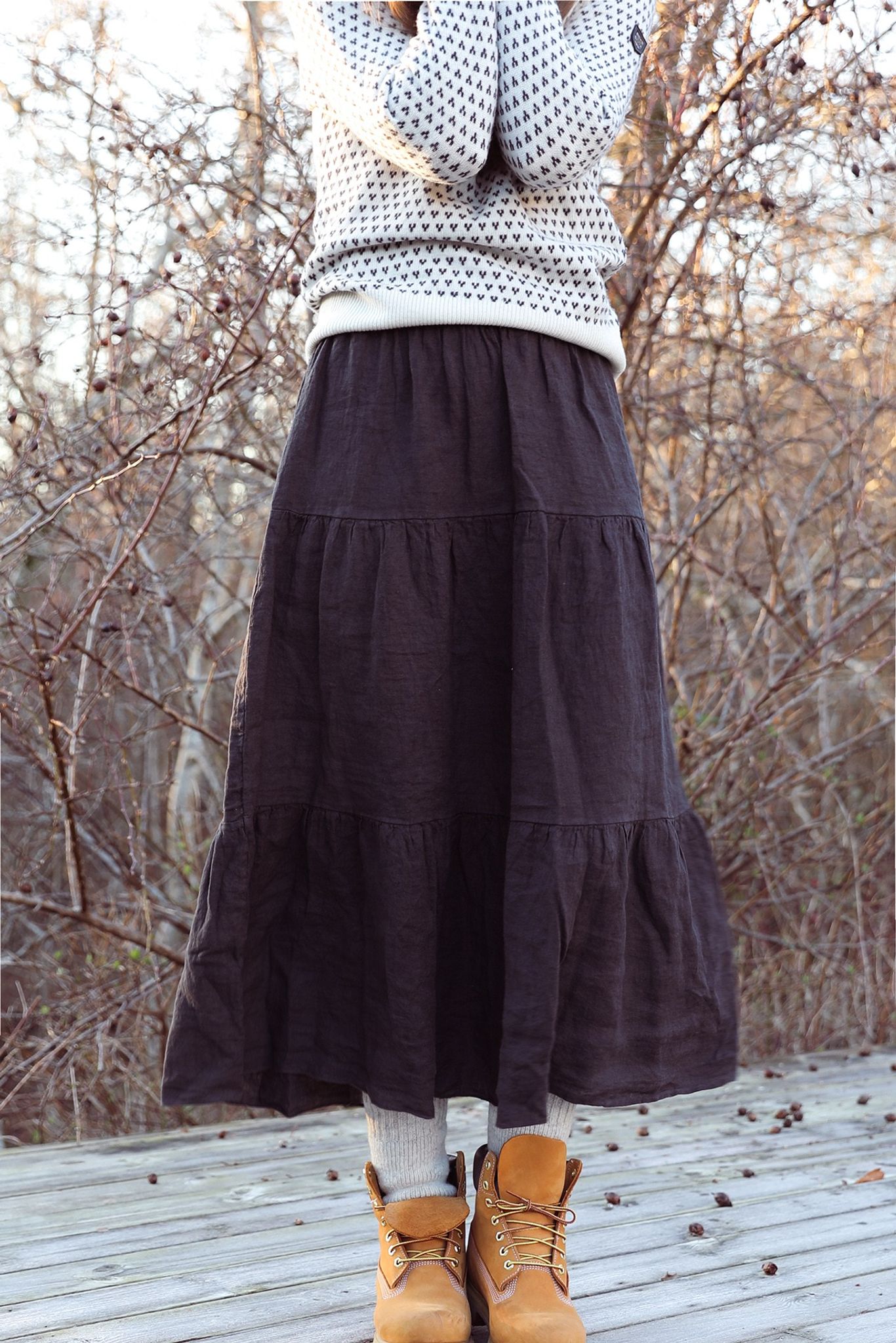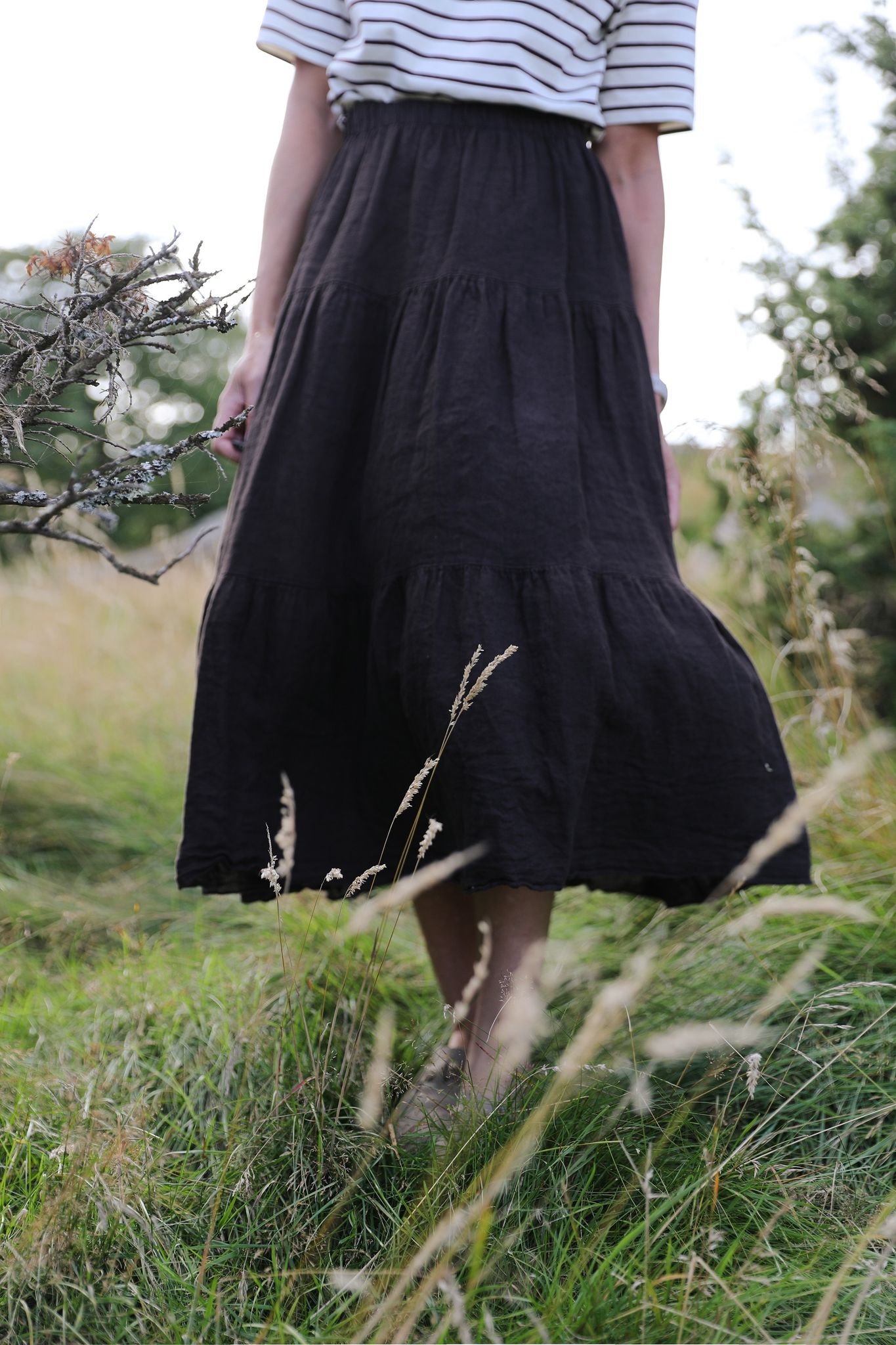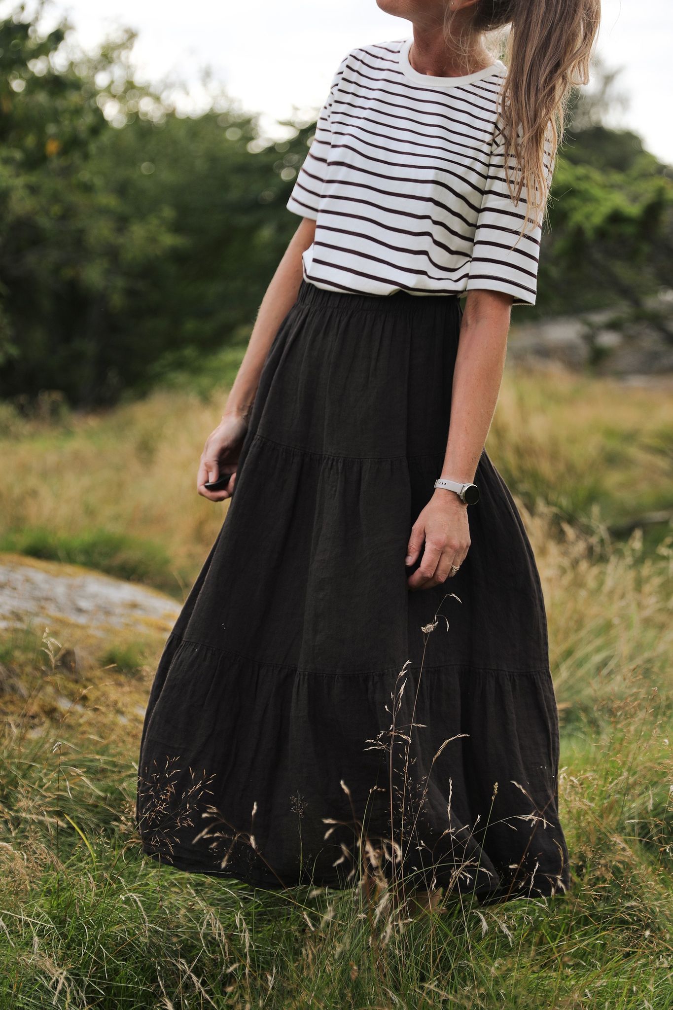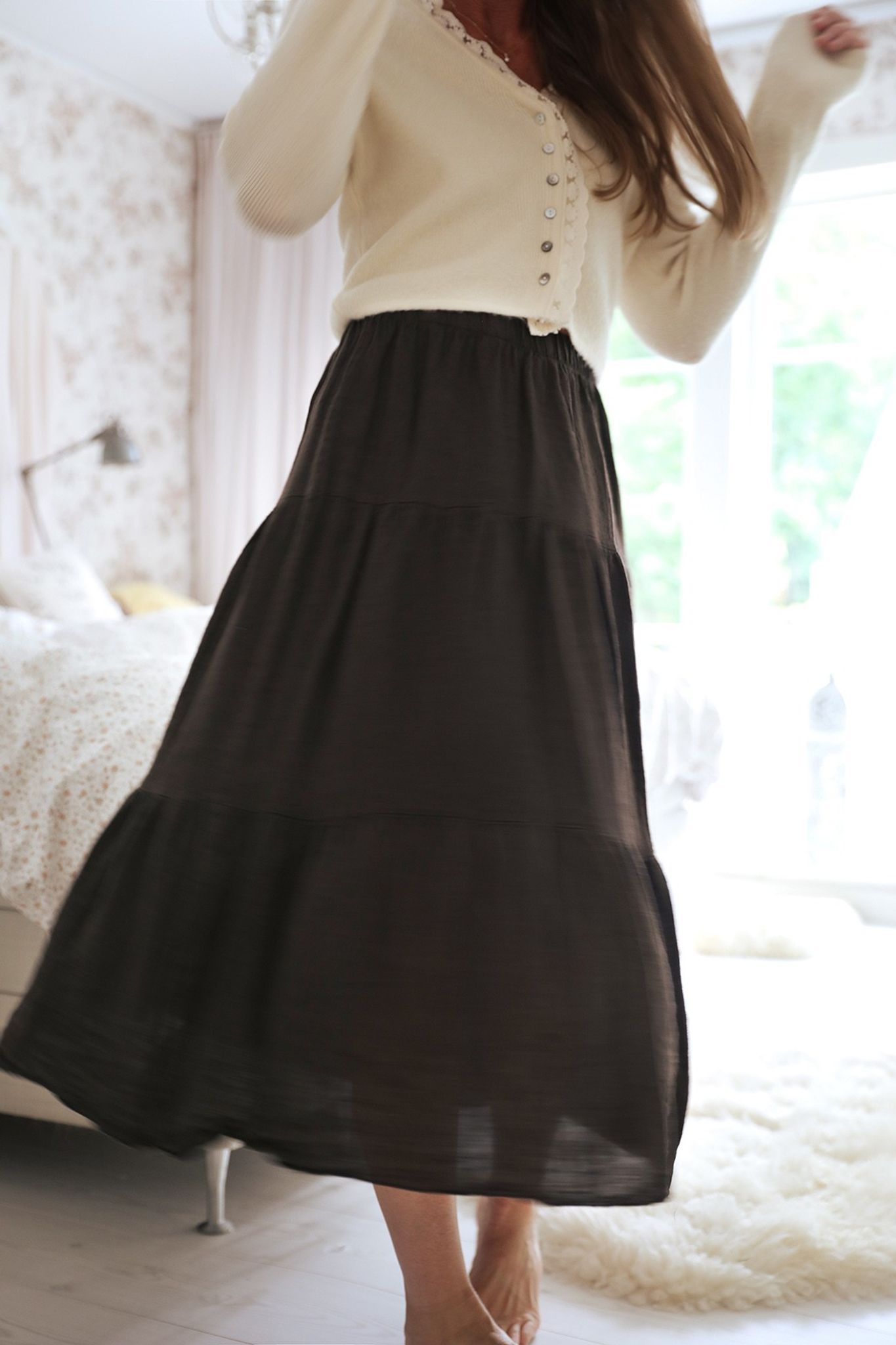 Lång mörkbrun linnekjol med mjuka volanger och vacker vidd, sydd i 100% tvättat linne med en naturligt skrynklig känsla. En följsam och bekväm modell med elastisk midja som passar storlek 36–42.