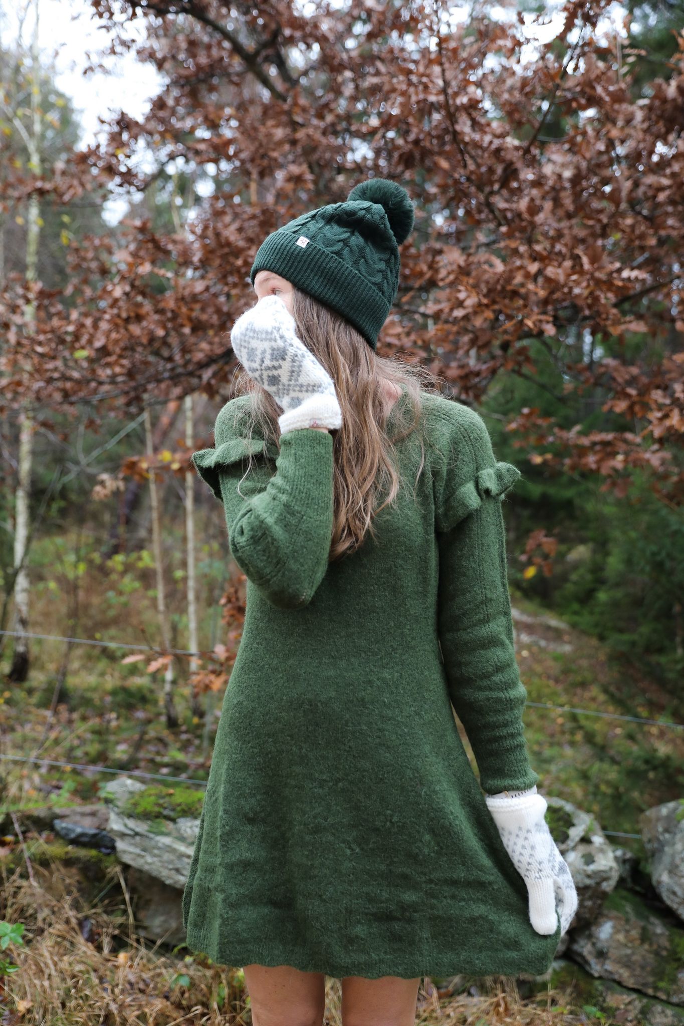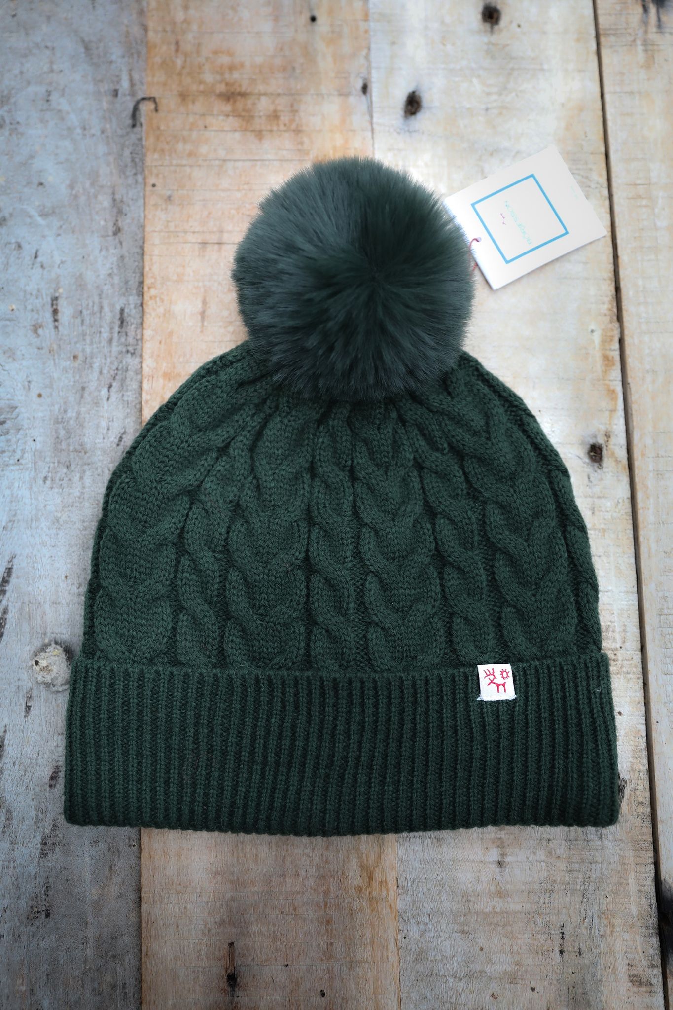 Galet söt mössa i grönt. Kabelstickad med stor rund tofs. Mössan har fleecefoder under uppviket. Kombinera med klänningen och vantarna på bilden, våra termostrumpbyxor och riktigt tjock ulltröja och leta upp en islagd liten skogs-sjö att åka skridskor på. Glöm inte att packa med varm choklad!