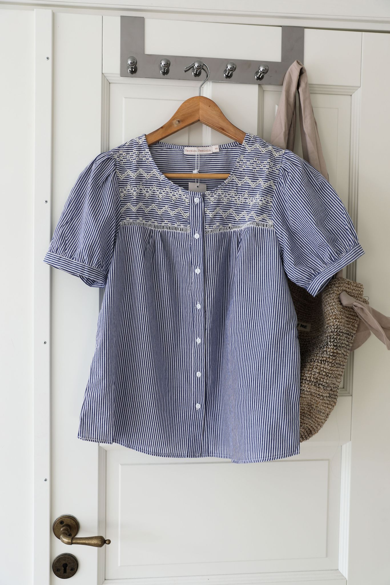 En randig blus med broderier