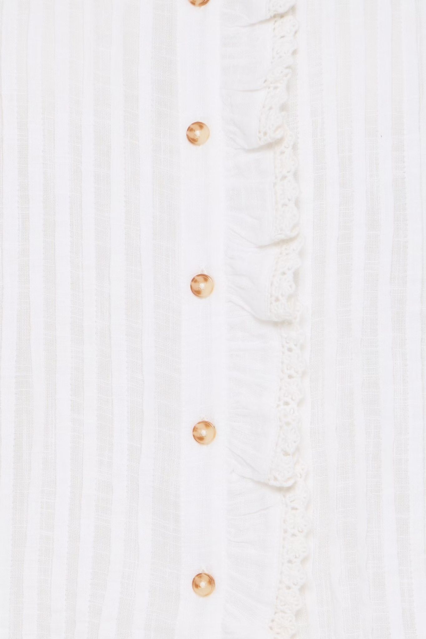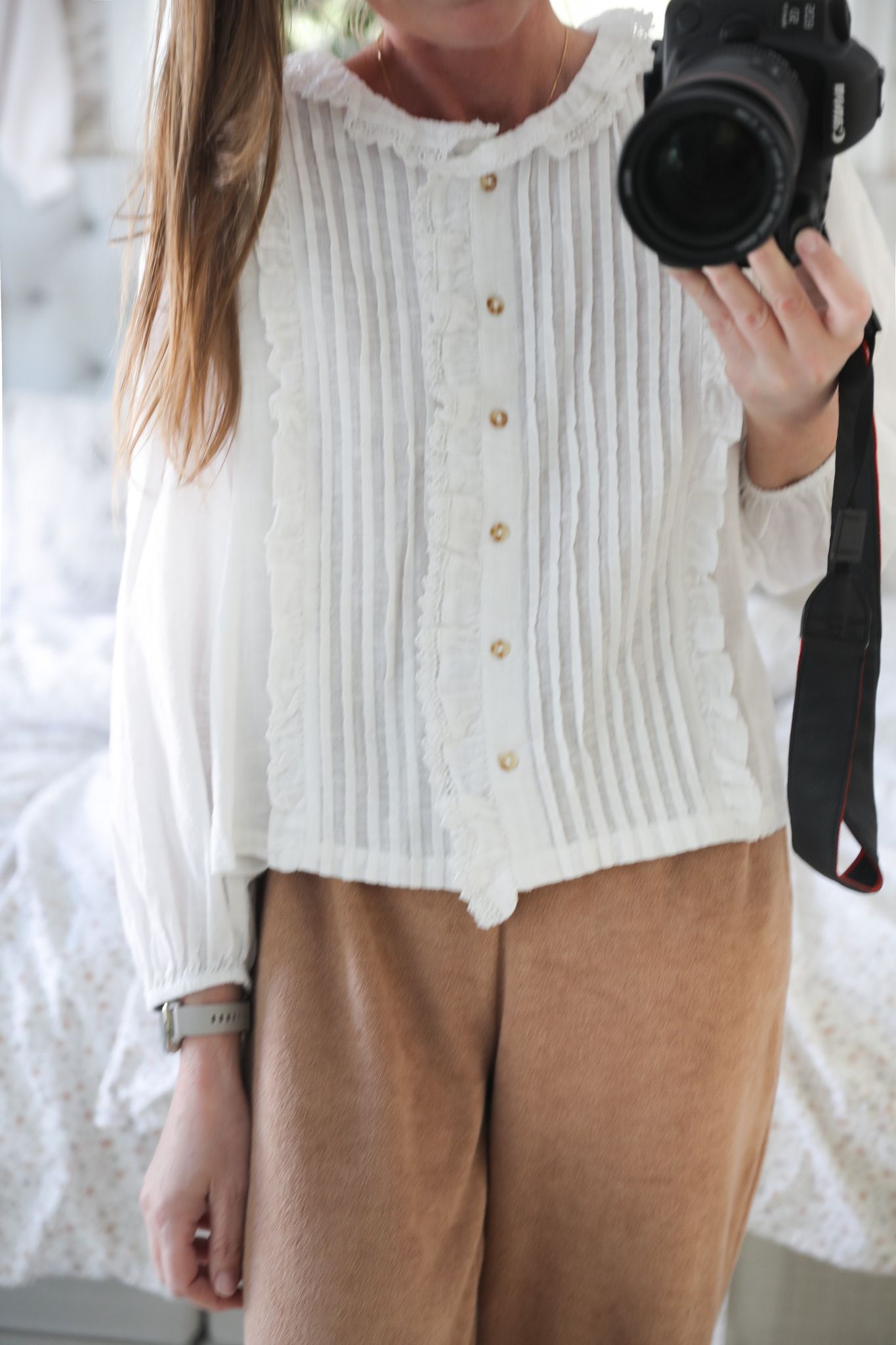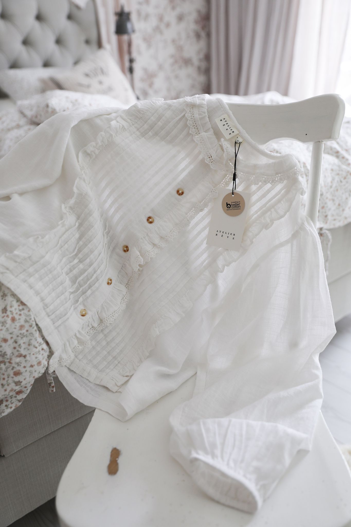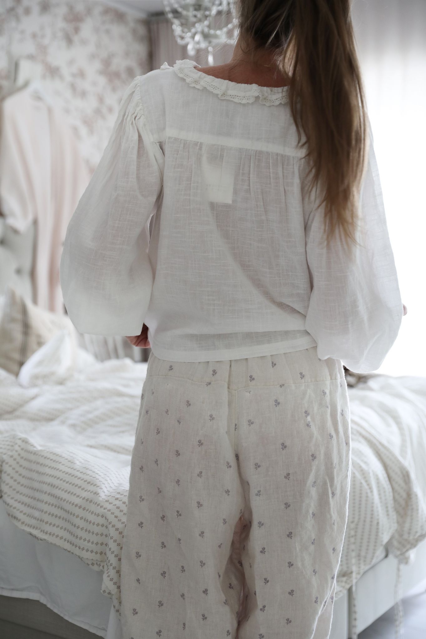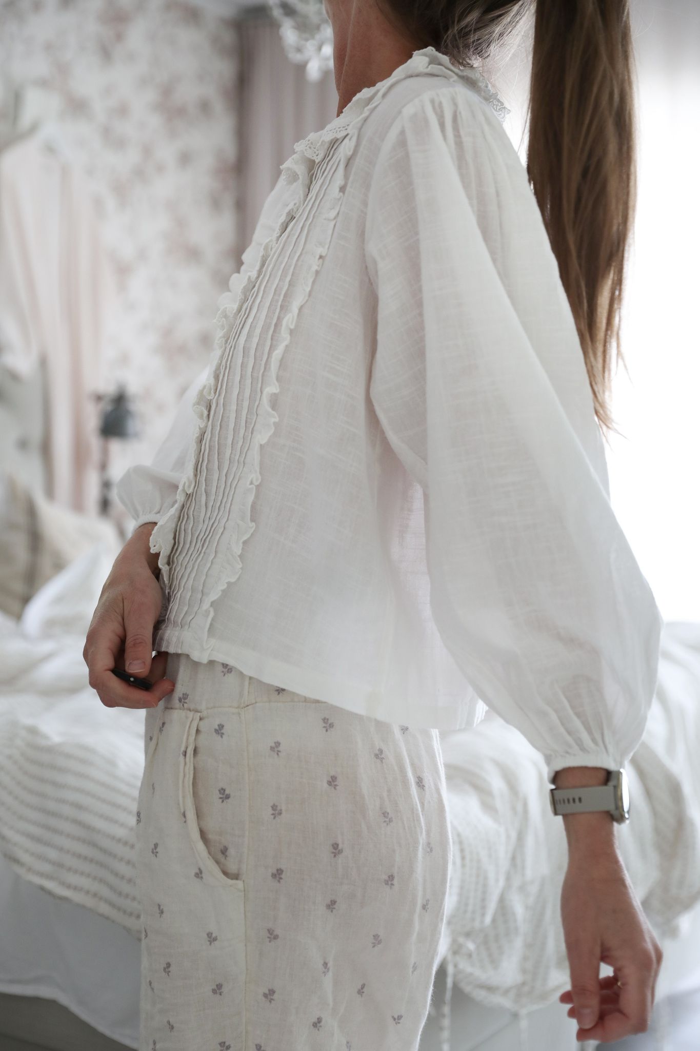 Lantlig blus smed brodyrspets kruskanter och motveck. Så söt så man döör litegrann.. Ganska vid och kort modell i vacker lite glesvävd bomullsväv med lite textur i väven. Underbart bekväm och härlig att bära och blir så väldans fin till sommarens ljusa jeans och jeansshorts, eller till nästan vad som helst faktisk, jag bar min med våra bekväma frottébyxor idag och kände mig väldans fin och välklädd på vardagsnivå, trots mysbyxkänslan på frottebyxan.