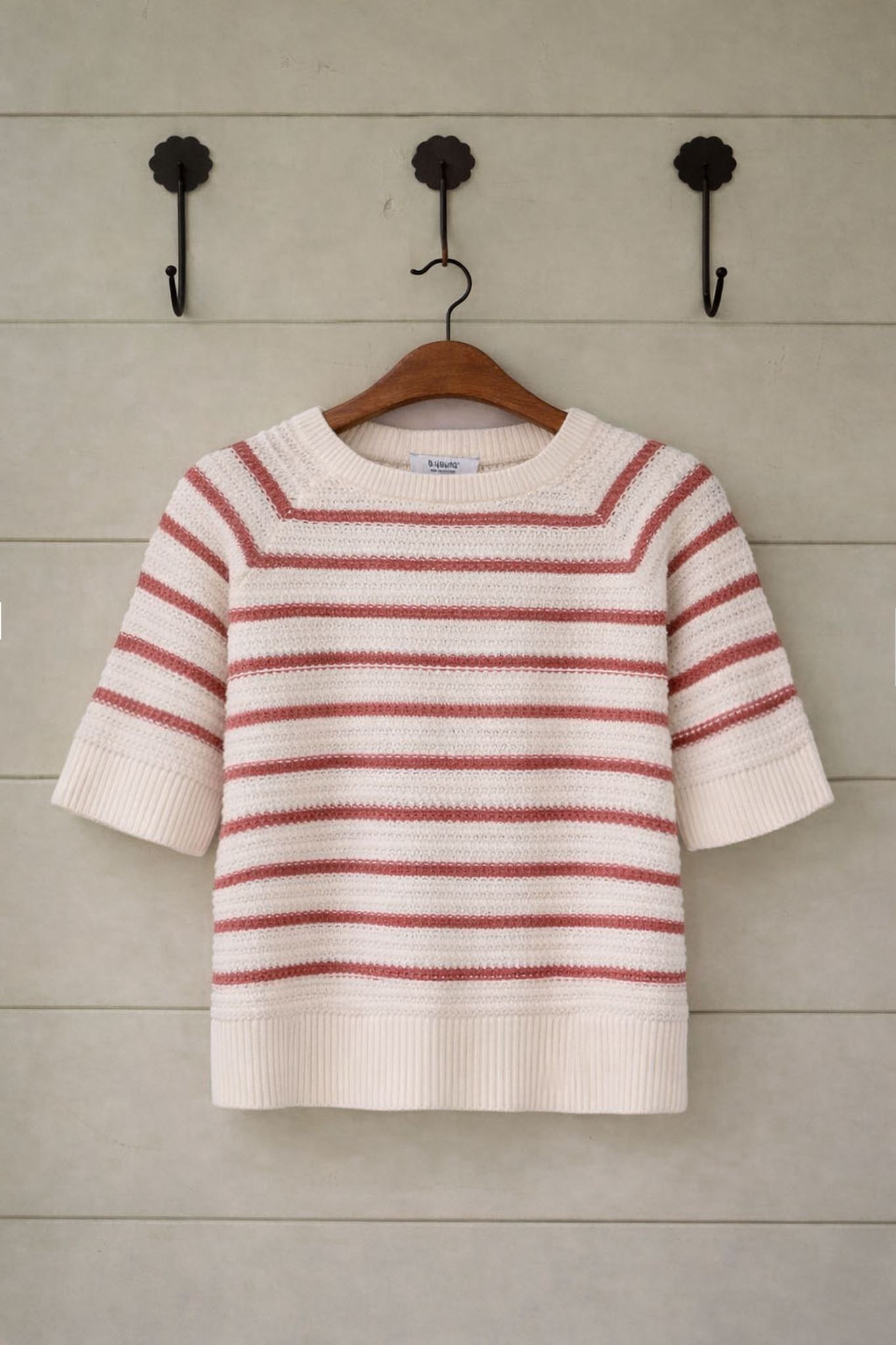 Tröjan är stickad i ett lite grövre bomullsgarn som ger en fin struktur och en härlig handstickad känsla. Tröjan är randig i offwhite och rönnbärsrött.