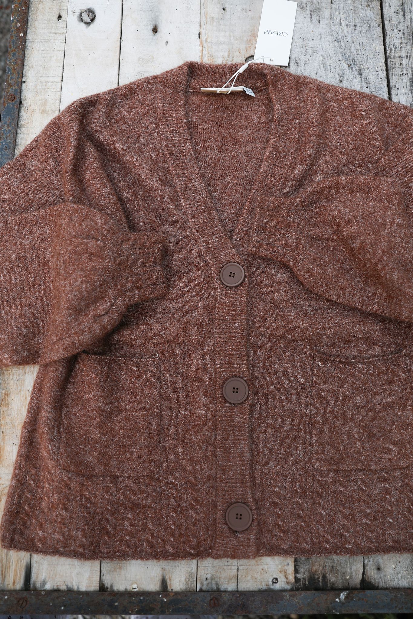 Ljuvlig kofta i avslappnad modell med framfickor och stora knappar. Romantisk mönsterstickning på fickkanter, och muddar i hals och ärmslut. Helt ljuvlig i höstens och vinterns outfits och värmer skönt eftersom det är så mycket ull i materialet, som föresten inte sticks, utan bara känns mjukt och gosigt.