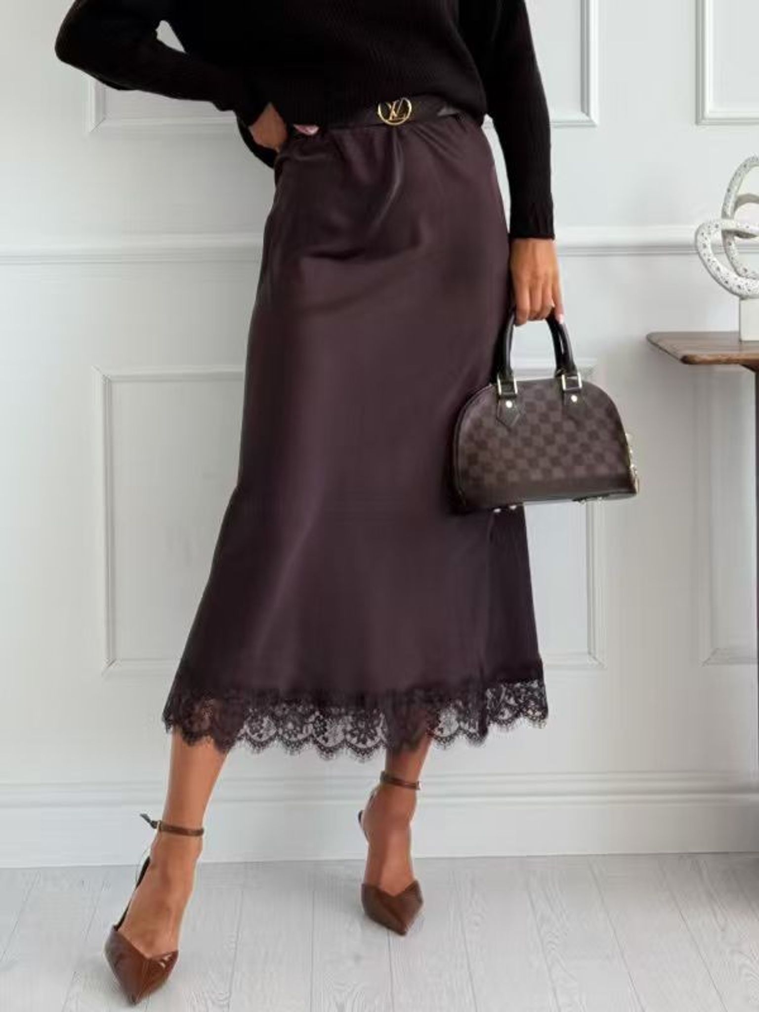 Brun kjol i satin med spets Helt underbar lyster och så fin på - älskar den. Resår i midjan.