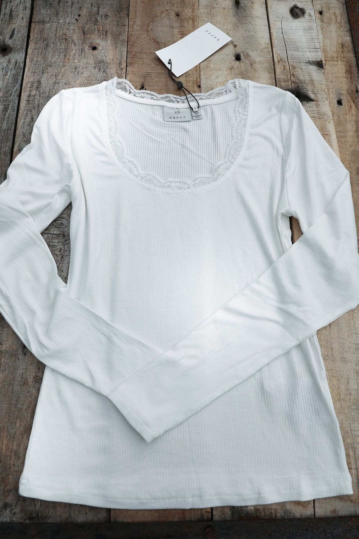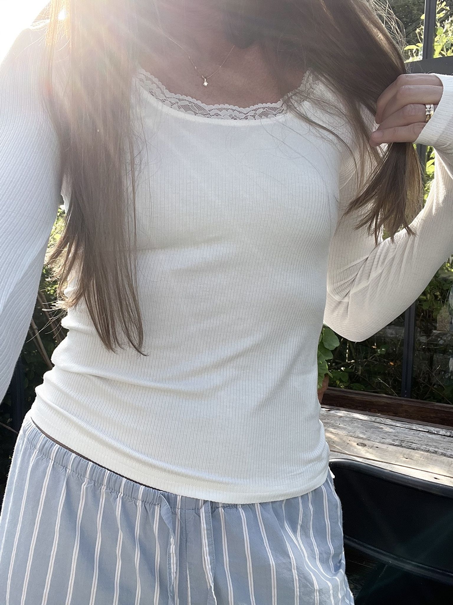 Urgullig ribbad top med spets i halskanten . Gammaldags och underbar och för tankarna till vintage underkläder och blir ljuvlig både för sig själv, eller som undertröja under skjortor och skjortklänningar. Materialet är silkigt, lent och svalt och känns härligt mot huden. Så fin och användbar att du kan behöva flera...