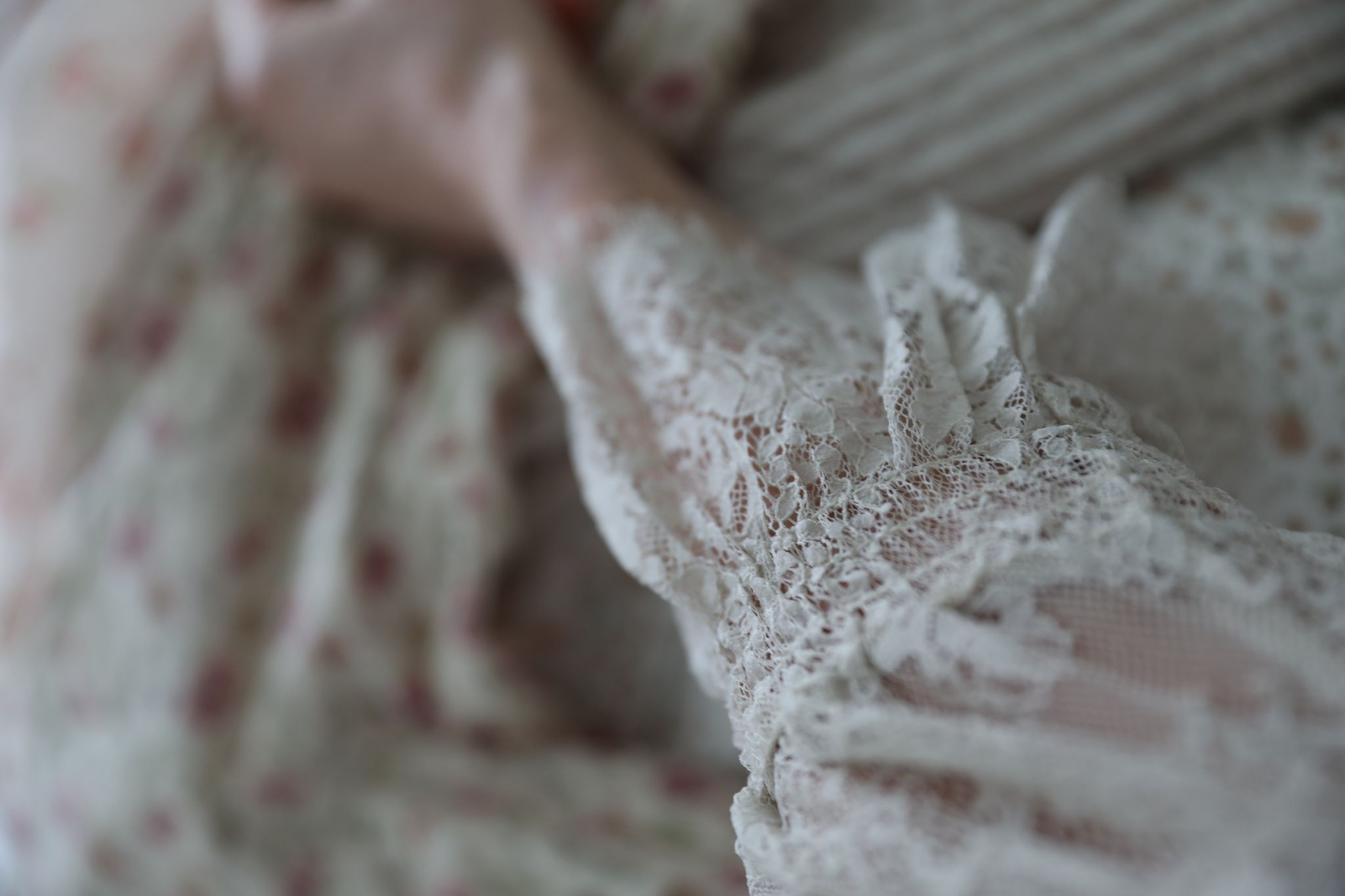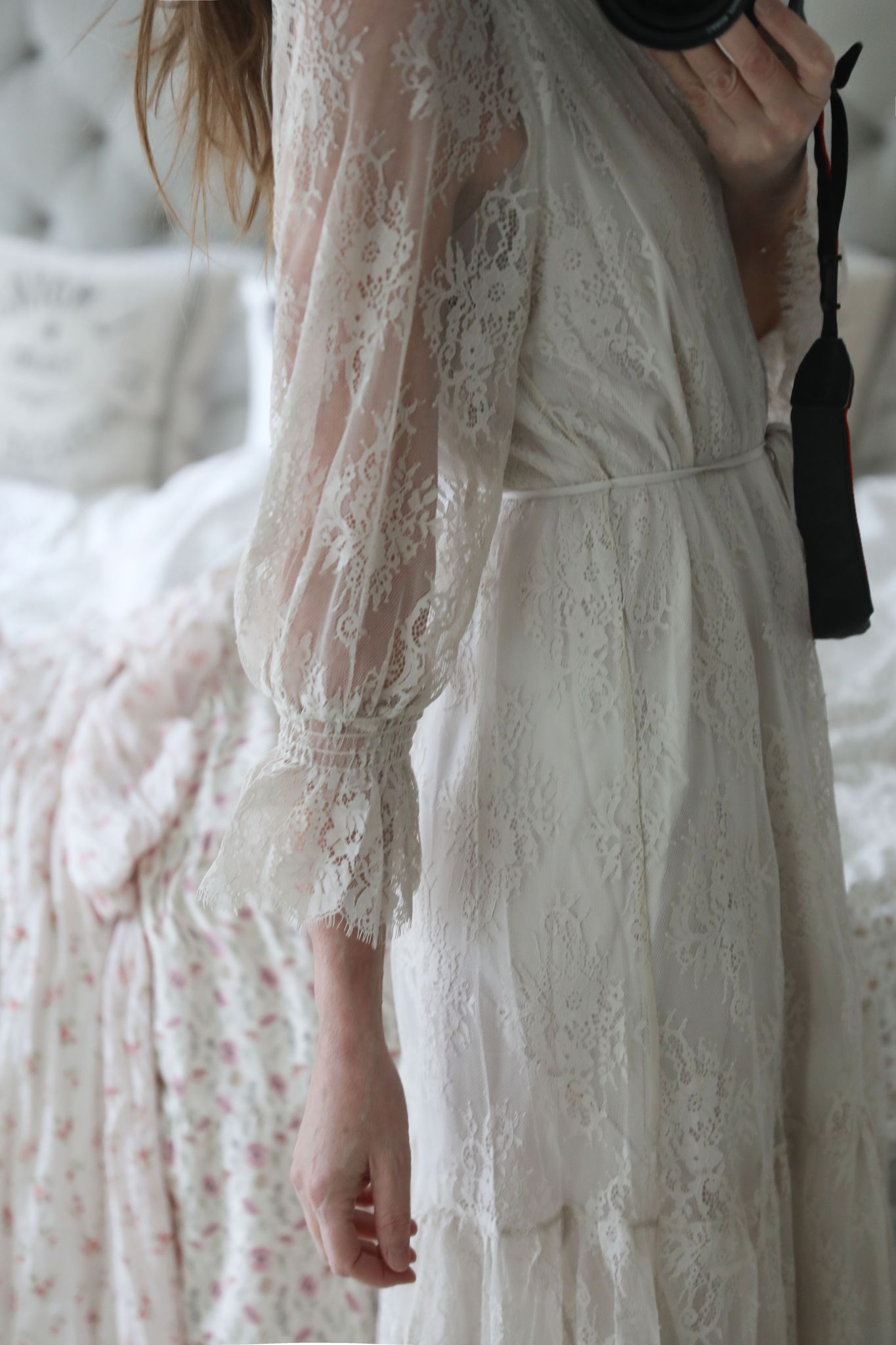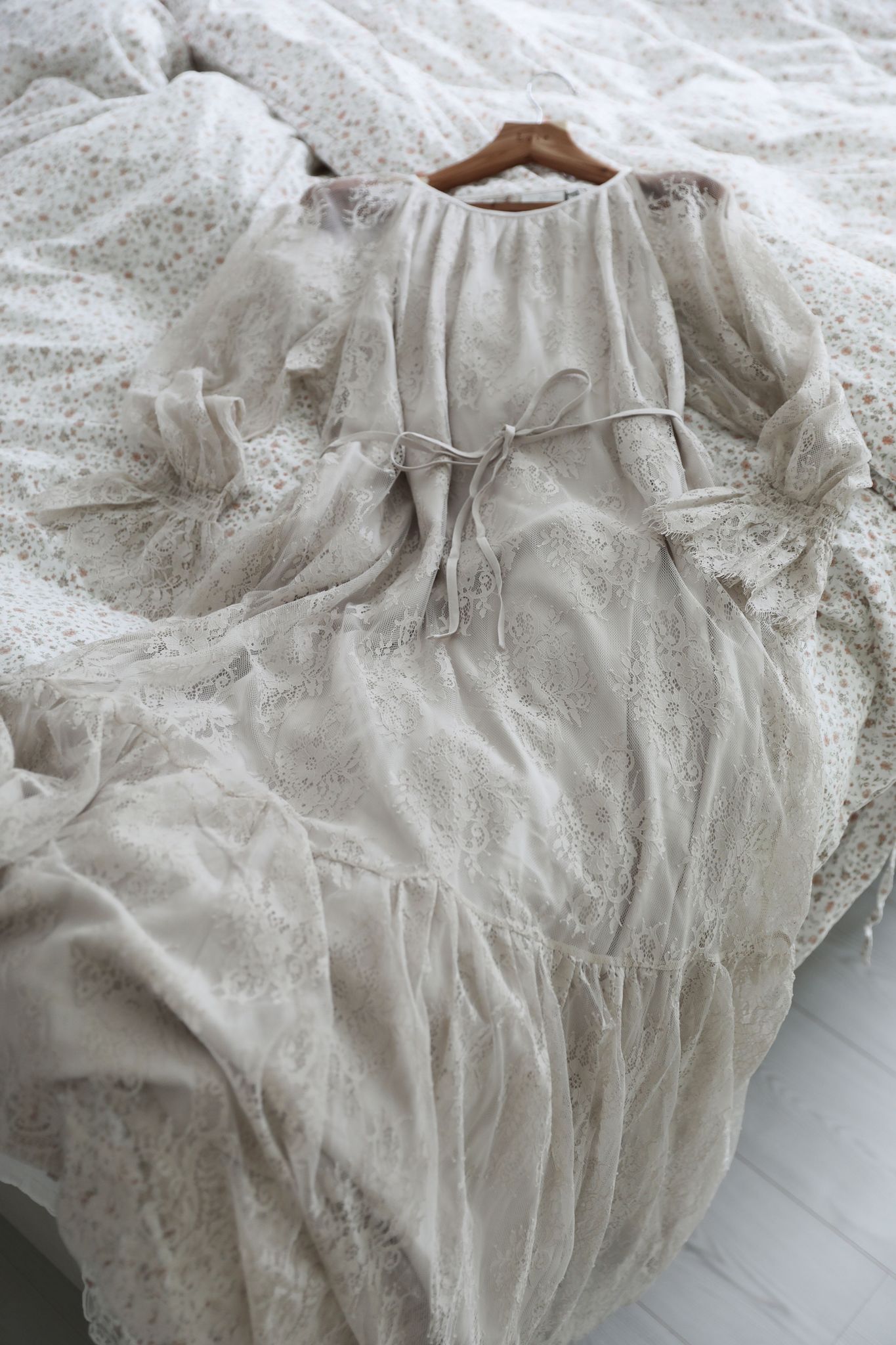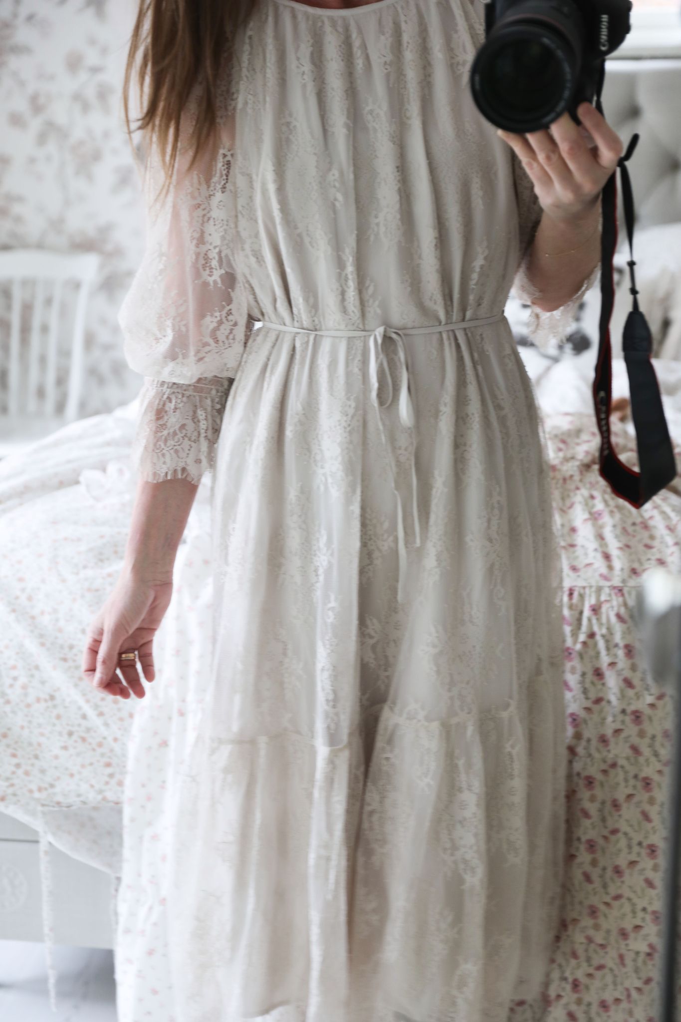 Det tunna spetslagret tillsammans med det mjuka fodret ger klänningen en luftig känsla — som om den hör hemma i stilla sommarljus, vid en gammal veranda, på ett kalas i trädgården eller en lugn kväll när vinden rör sig lätt i kjolen.