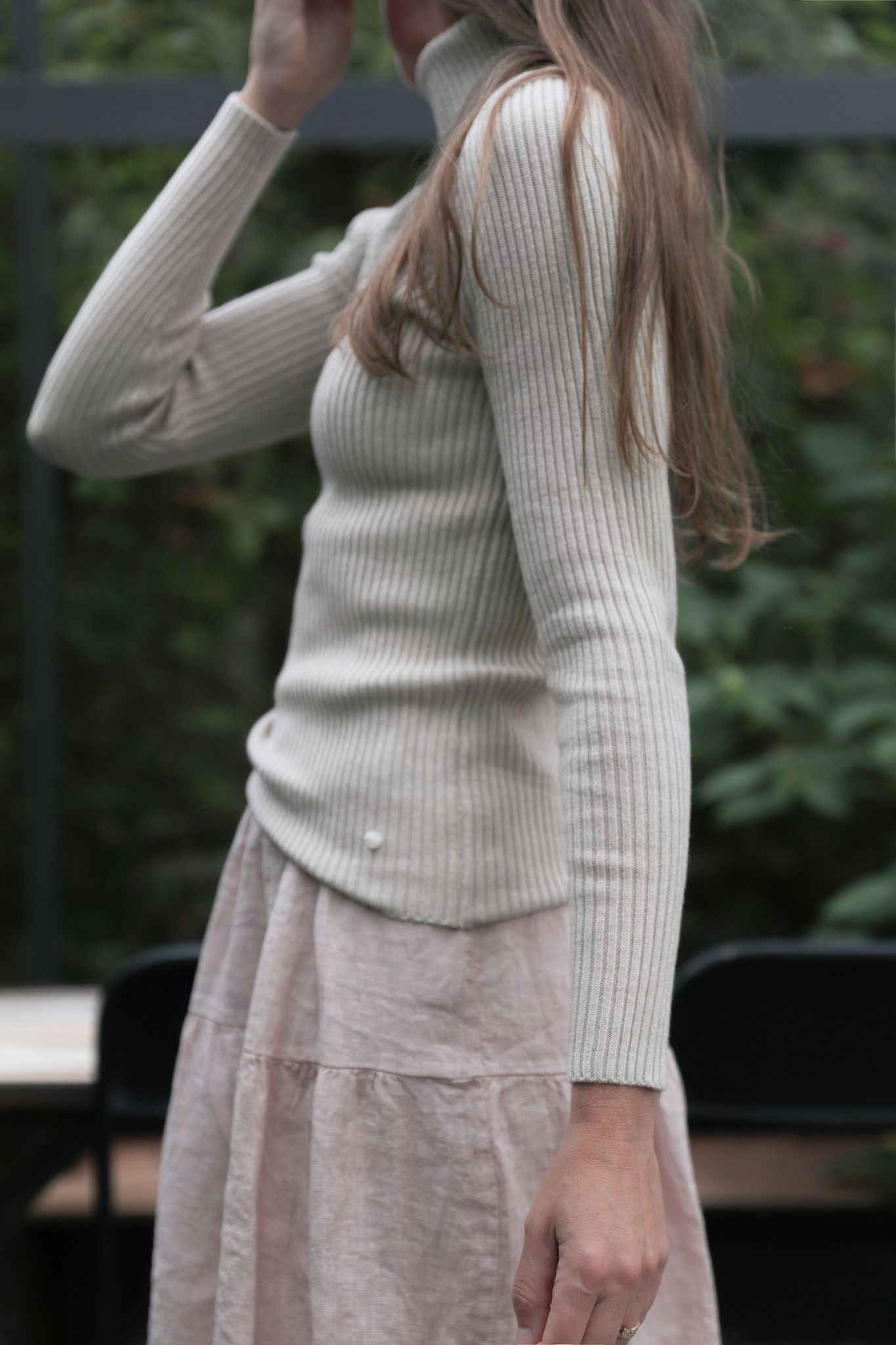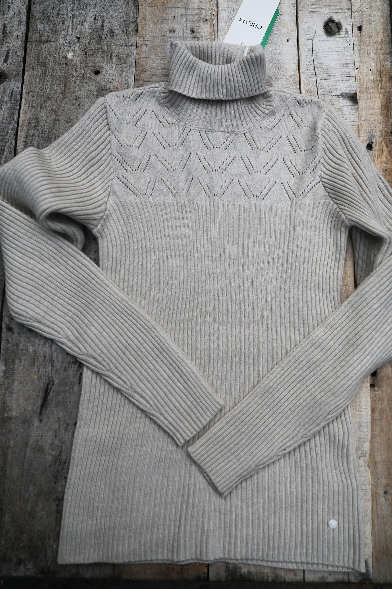Ljuvlig polotröja i vintage beige melerad fin färg. Så mjuk att du aldrig vill ta av den och perfekt för sensommarens mjuka skymningar och höstens första krispiga morgnar. Ribbstickad med vackert stickat mönster över bröstet.