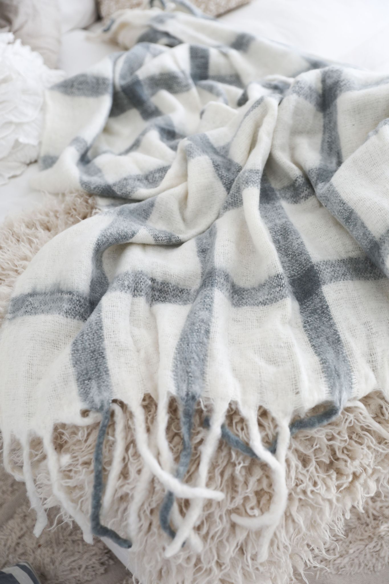 Rutig pläd i blått och offwhite med mjuk och fluffig känsla. En varm och behaglig pläd som passar fint i sommarens inredning.