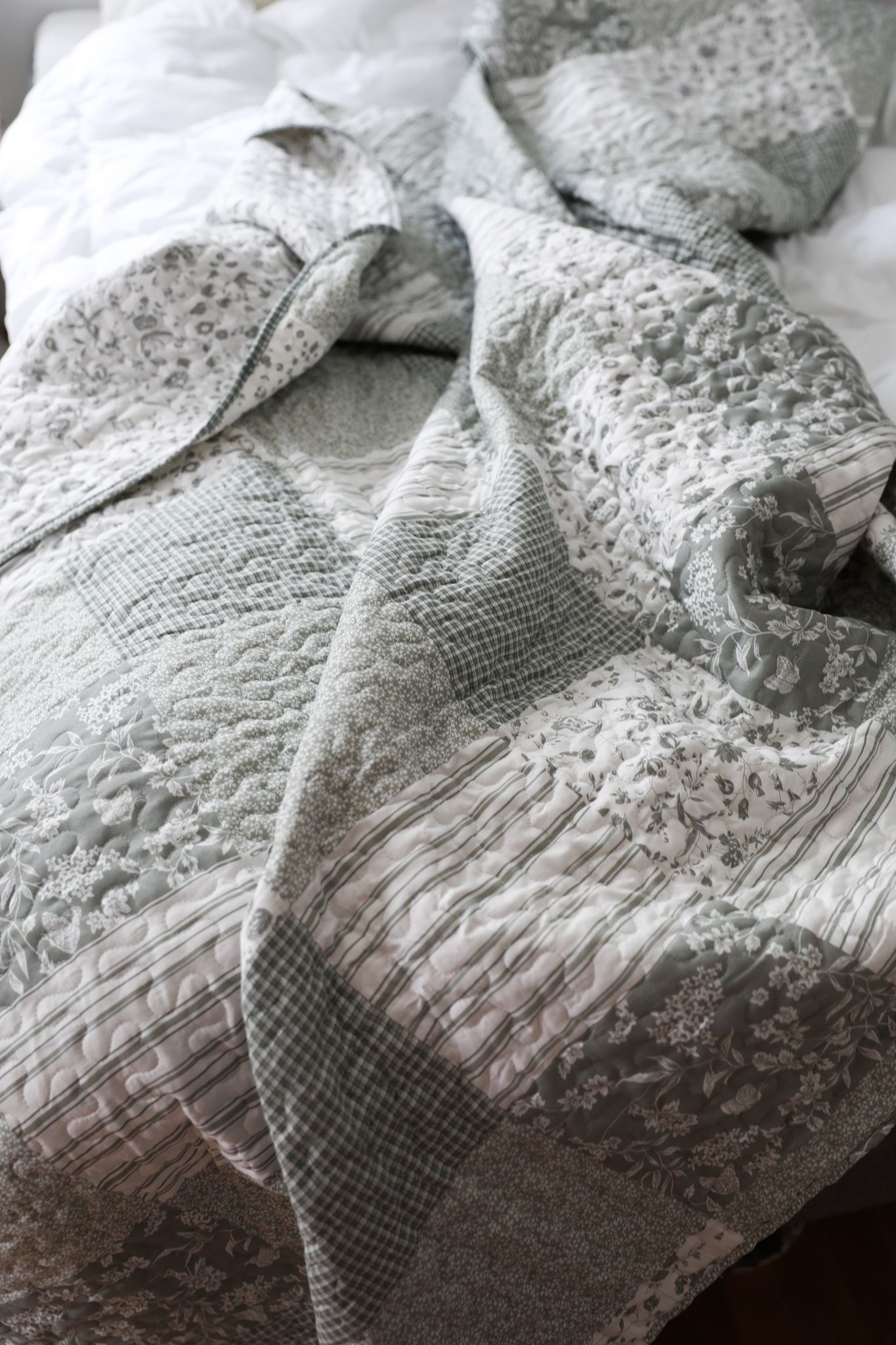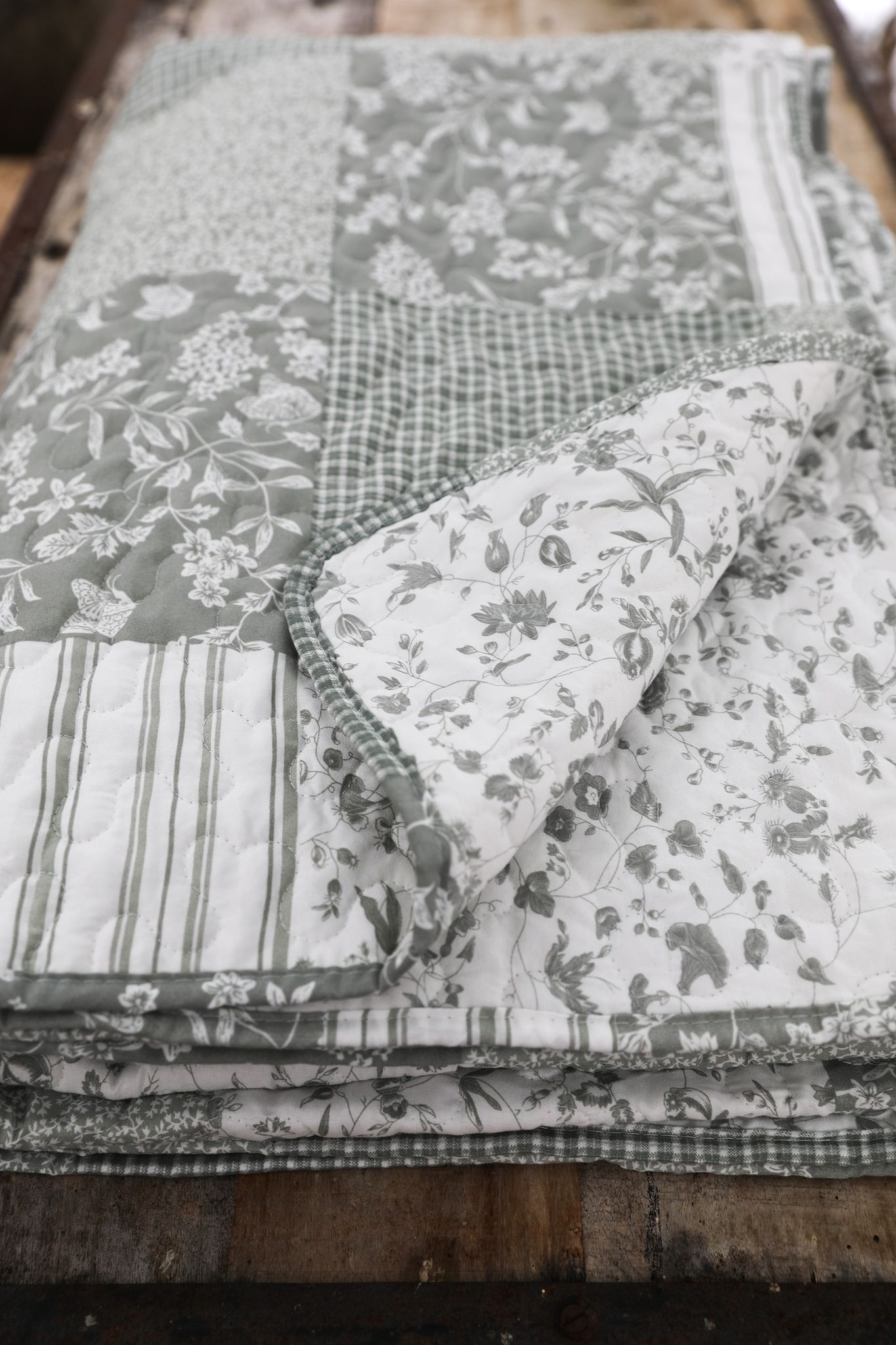 Ett rart och lantligt quiltat lapptäcke i mjuk salviagrön ton som ger hemmet en varm och ombonad känsla. Lika fint över sängen som med ut på en picknick.