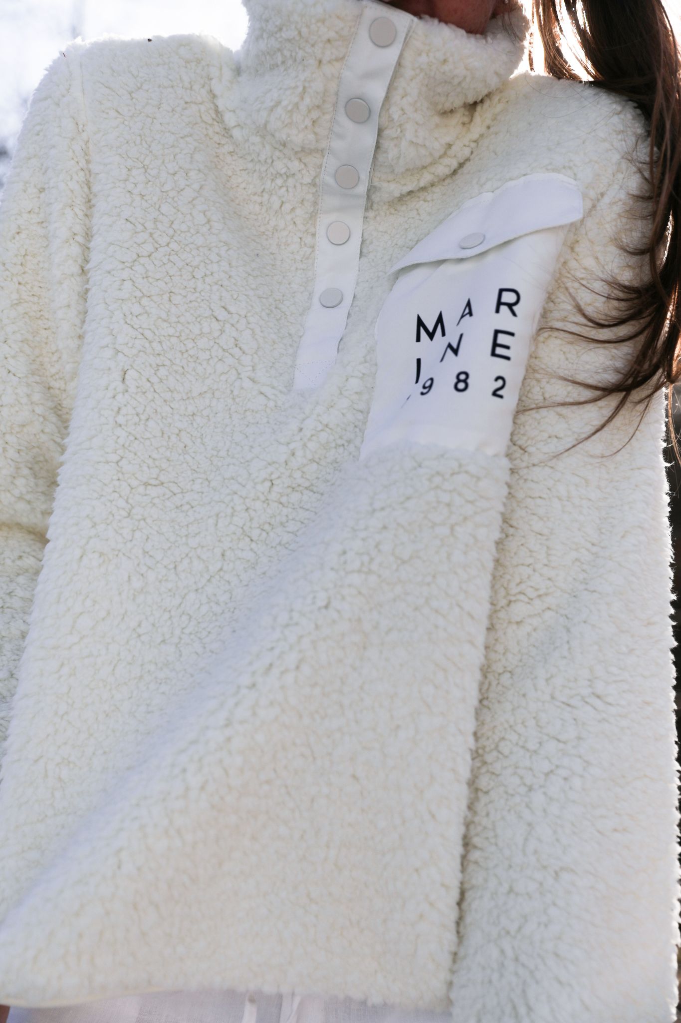 Tröjan är gjord i ett mjukt och lite fluffigt material som värmer utan att kännas tung. Den har en kort knäppning framtill med tryckknappar och en liten fin bröstficka