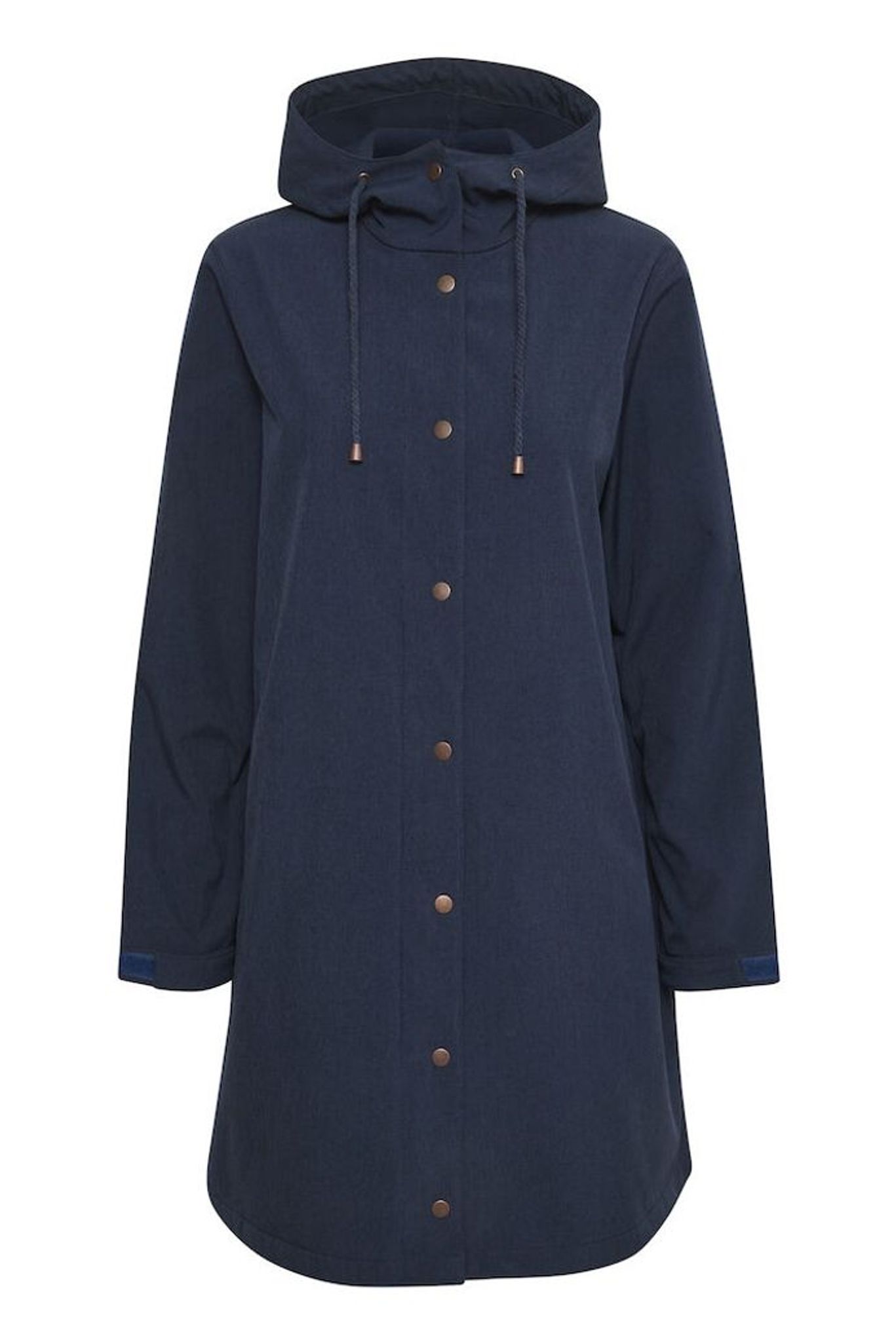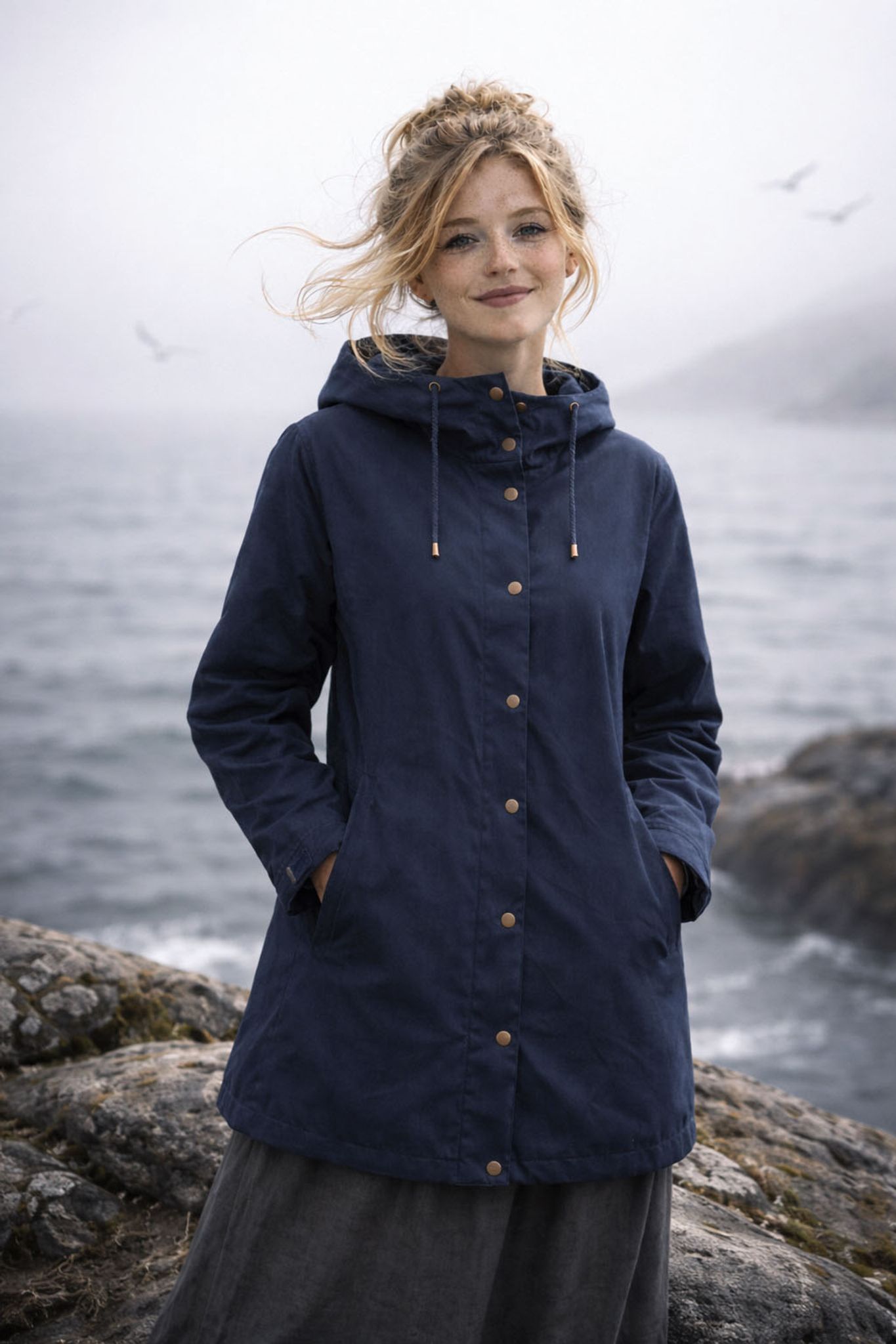 Den djupa mörkblå tonen för tankarna till hav, klippor och disiga morgnar vid kusten. Dragkedjan framtill skyddas av ett vindslå med tryckknappar som hjälper till att hålla kylan ute. Den fasta huvan med dragsko ger extra skydd när vädret skiftar, och ärmsluten kan justeras med kardborre för en bekväm passform.