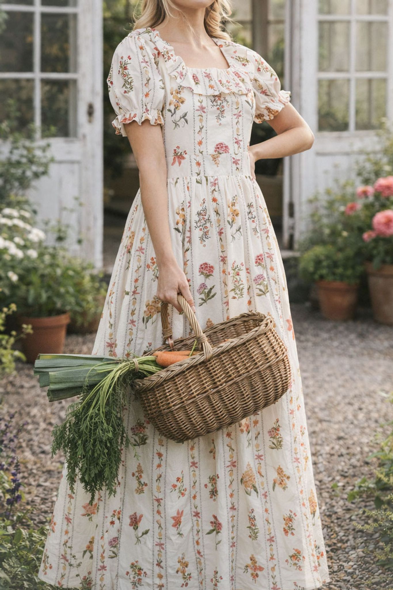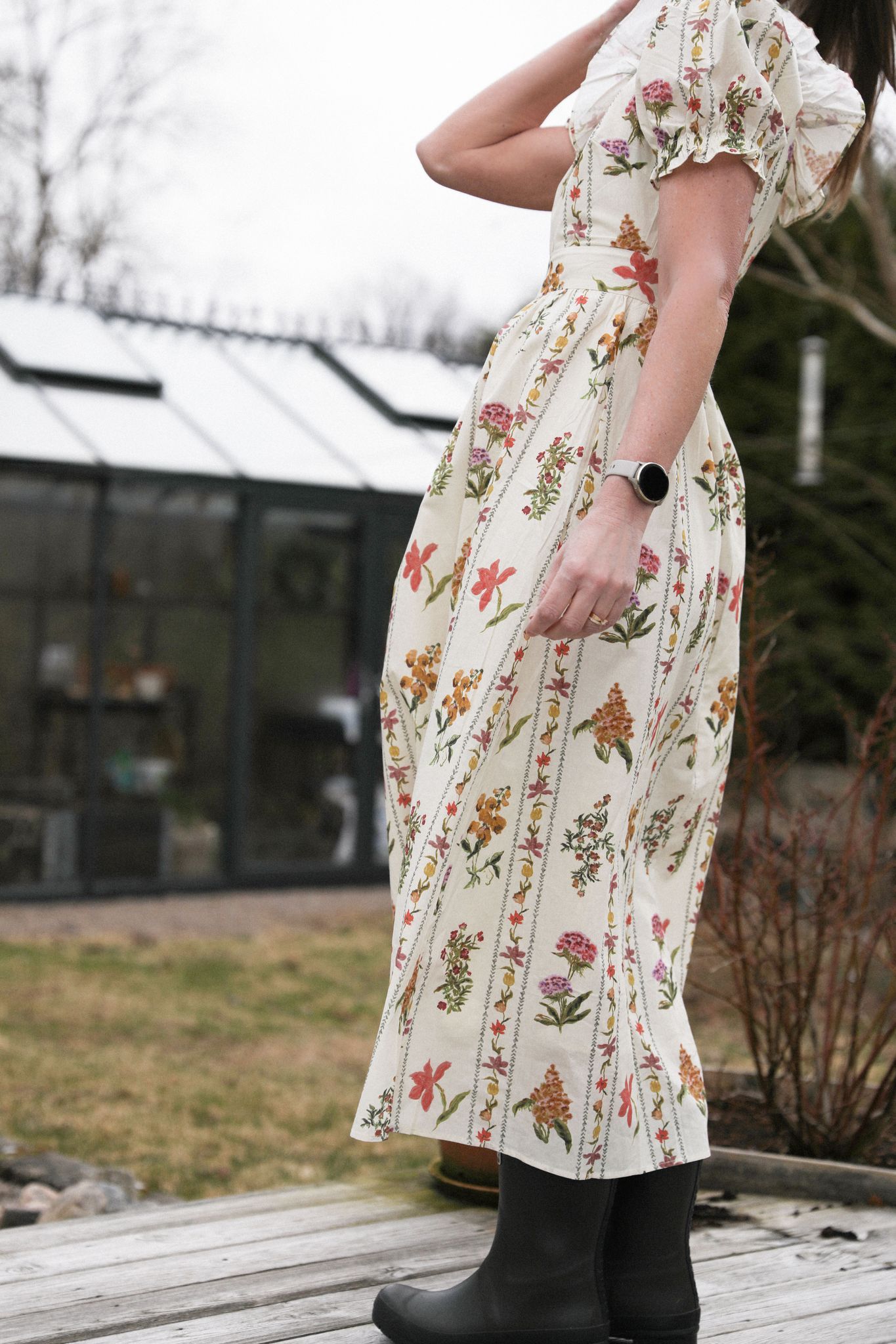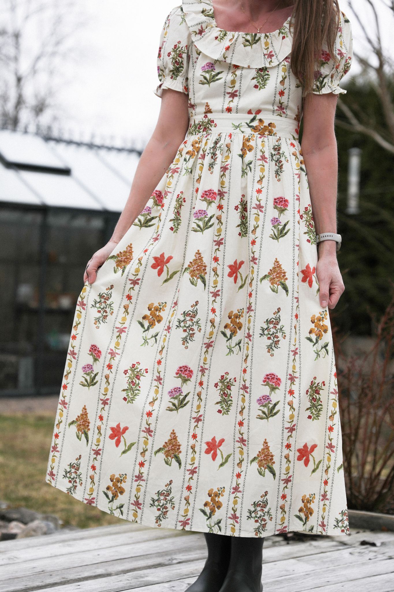 En lång klänning i bomull med blommor på. Klänningen är fodrad och har blixtlås i ryggen. Vacker modell med singoalla-skärning upptill och som är skuren under bysten, där den blir riktigt smal för att sedan falla ut i en vid kjol.