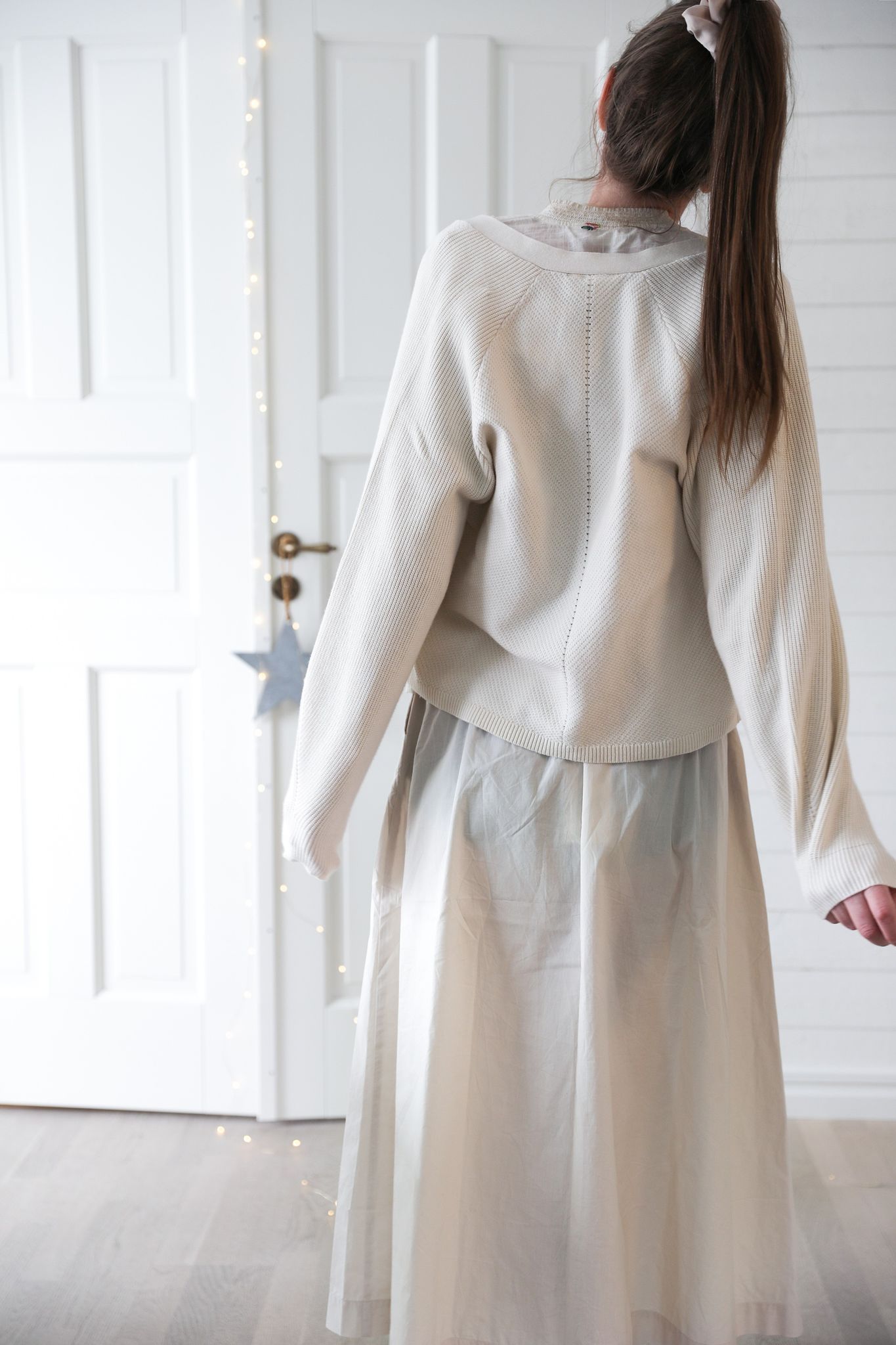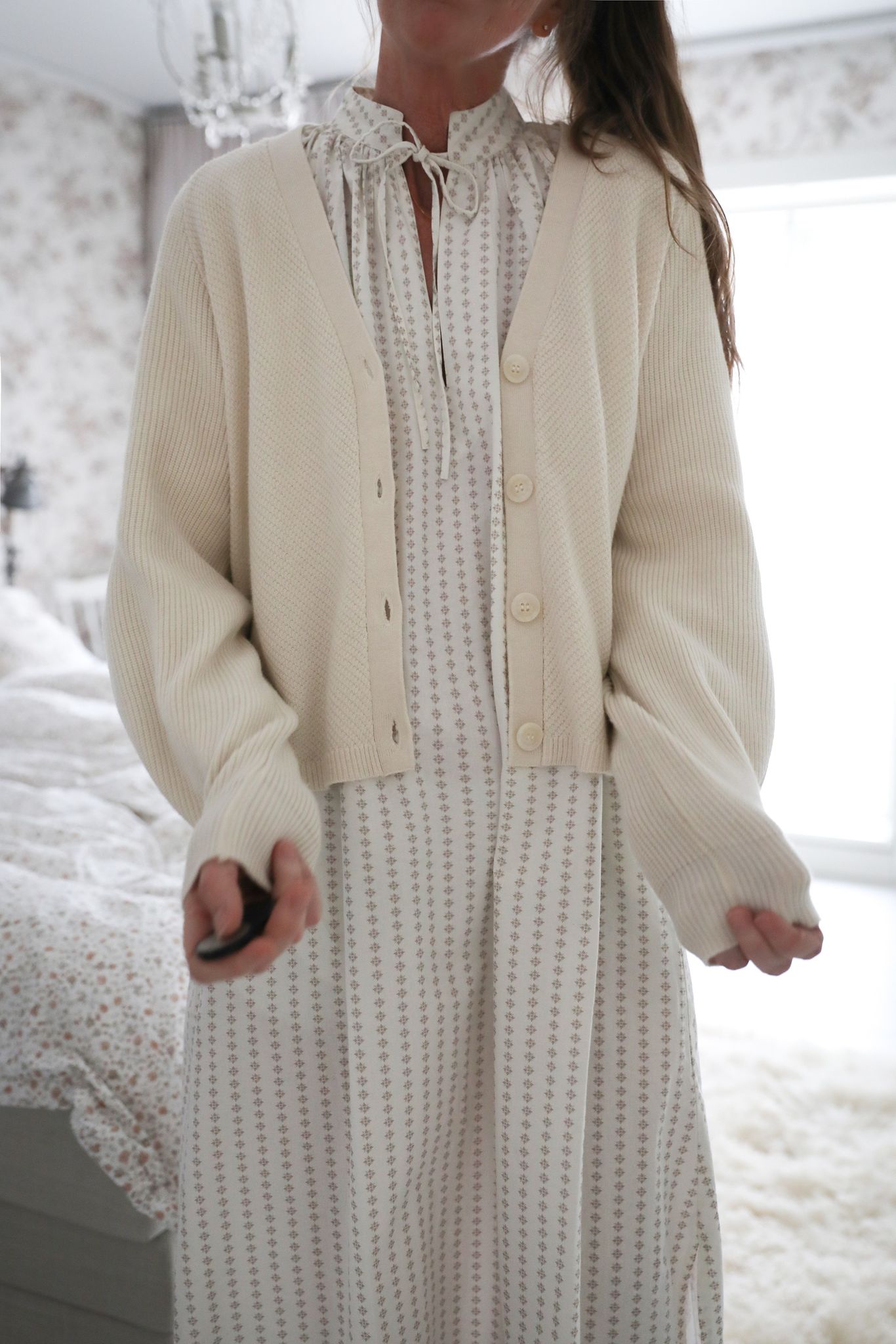 Ljuvlig cremevit kofta som är perfekt att bära över klänningar och toppar när sommarvädret bjuder på kyla. Användbar och fin modell med V-ringning och vida ärmar. Materialet är så himla mjukt och lent och den är stickad i med superfina sticktekniker.