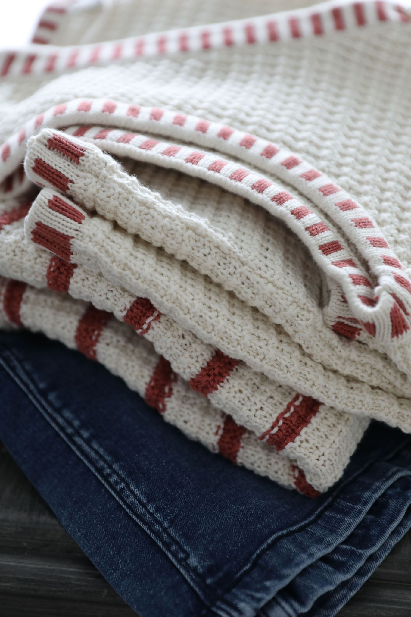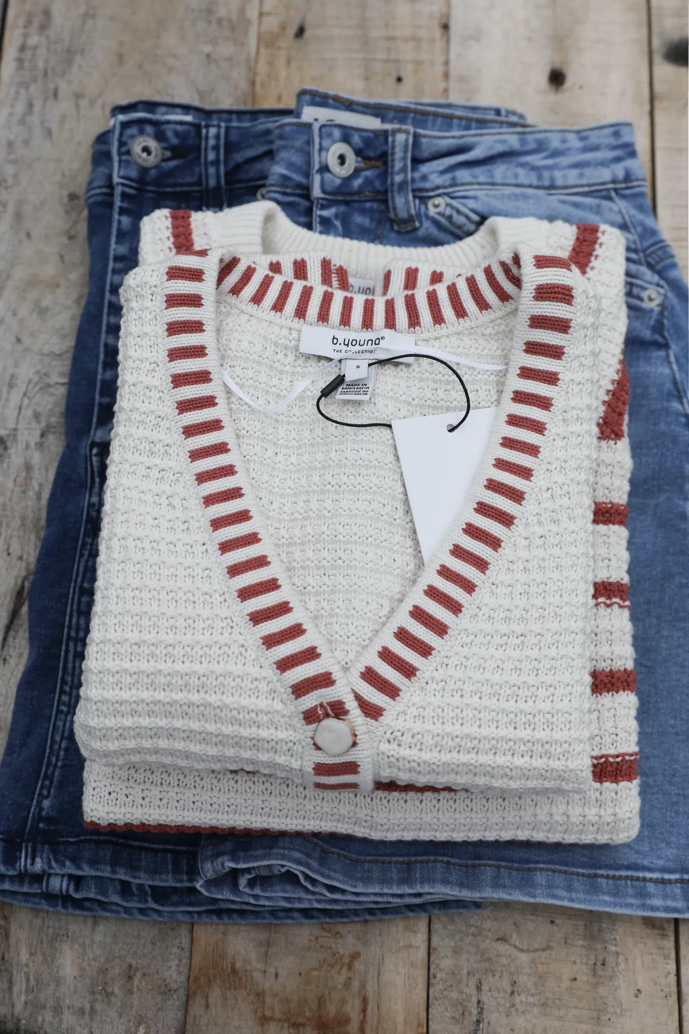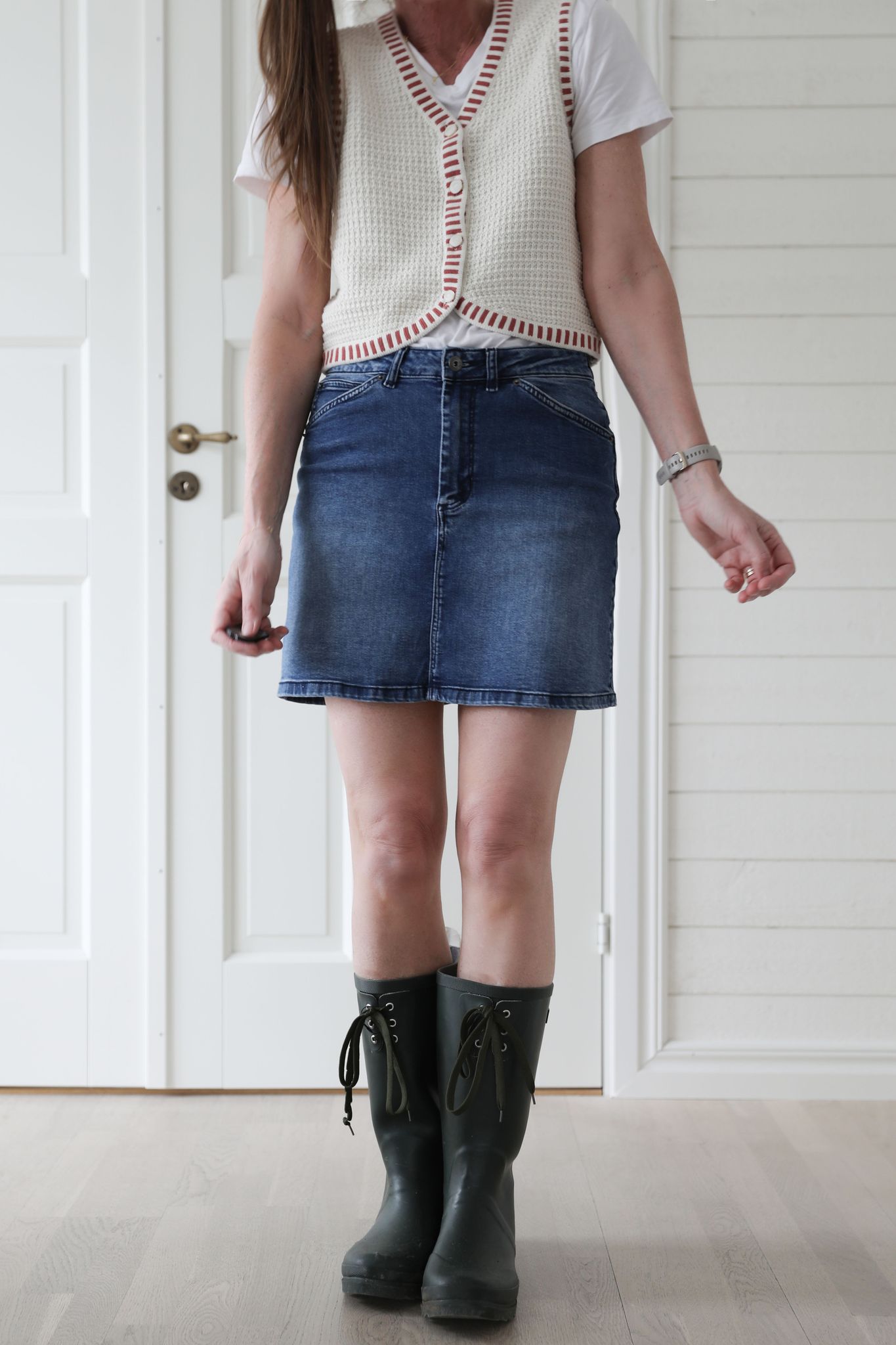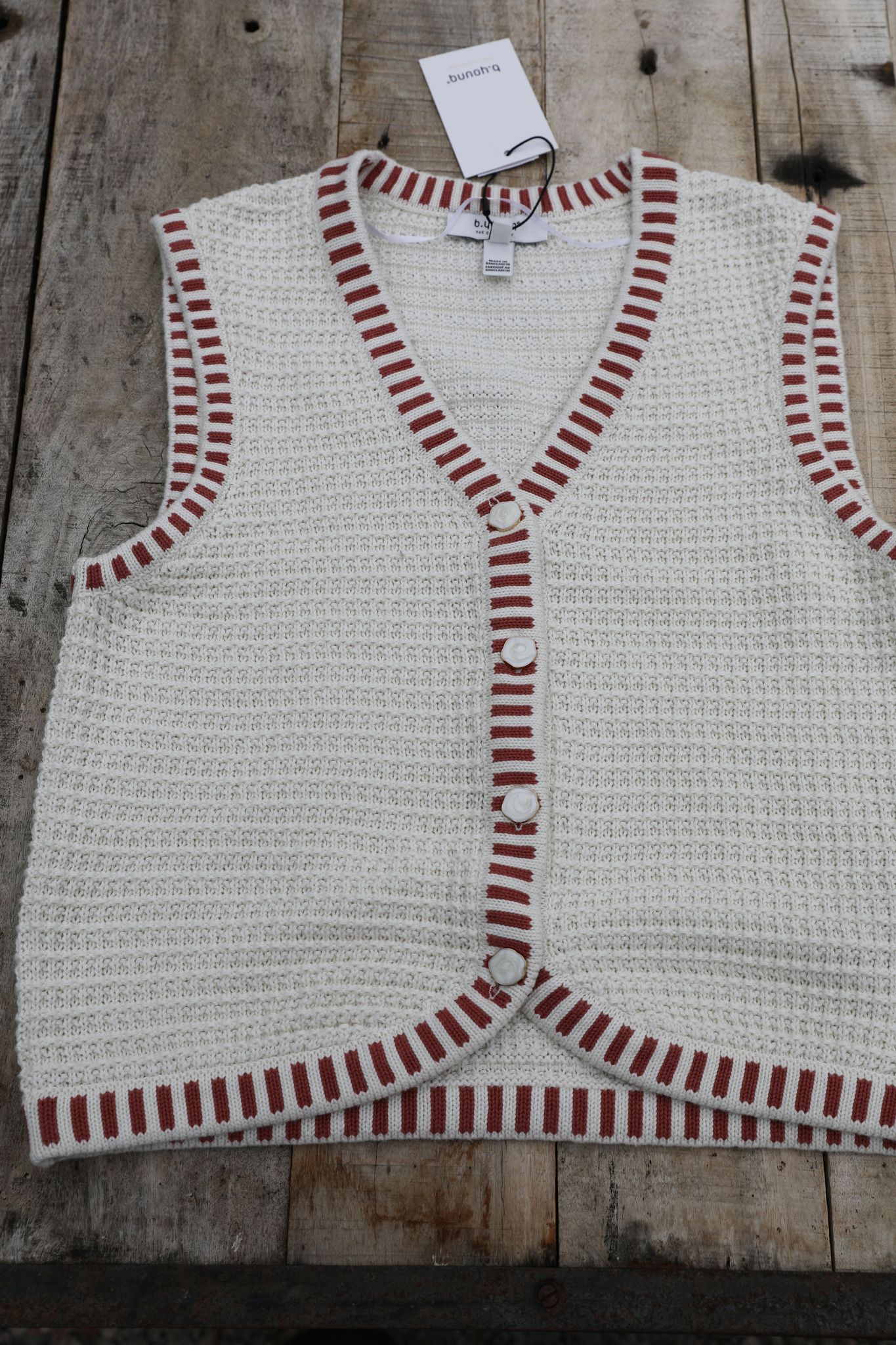 En stickad väst i ecrufärgat bomullsgarn med en lite rustik, nästan handgjord känsla. Enkel och söt med emaljerade knappar och rönnbärsröda ränder som passar fint tillsammans med ecrufärgen.