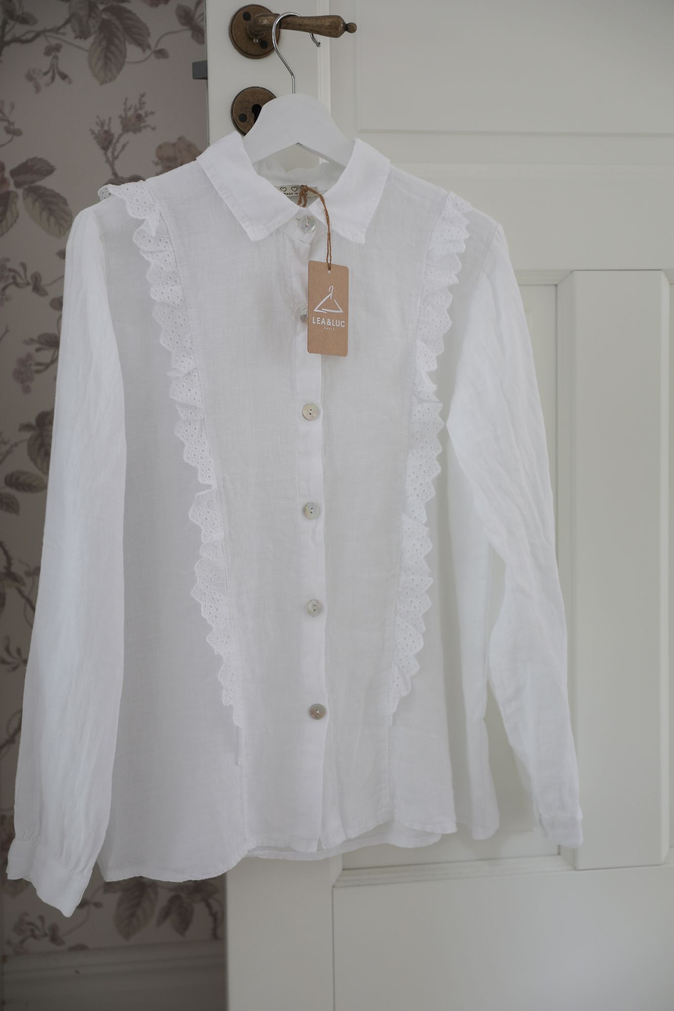 Vit skjorta i mjukt tvättat linne med romantiska spetsdetaljer och fina pärlemorknappar. Rak modell med klassisk skjortkrage och manchetter med knäppning i ärmsluten.