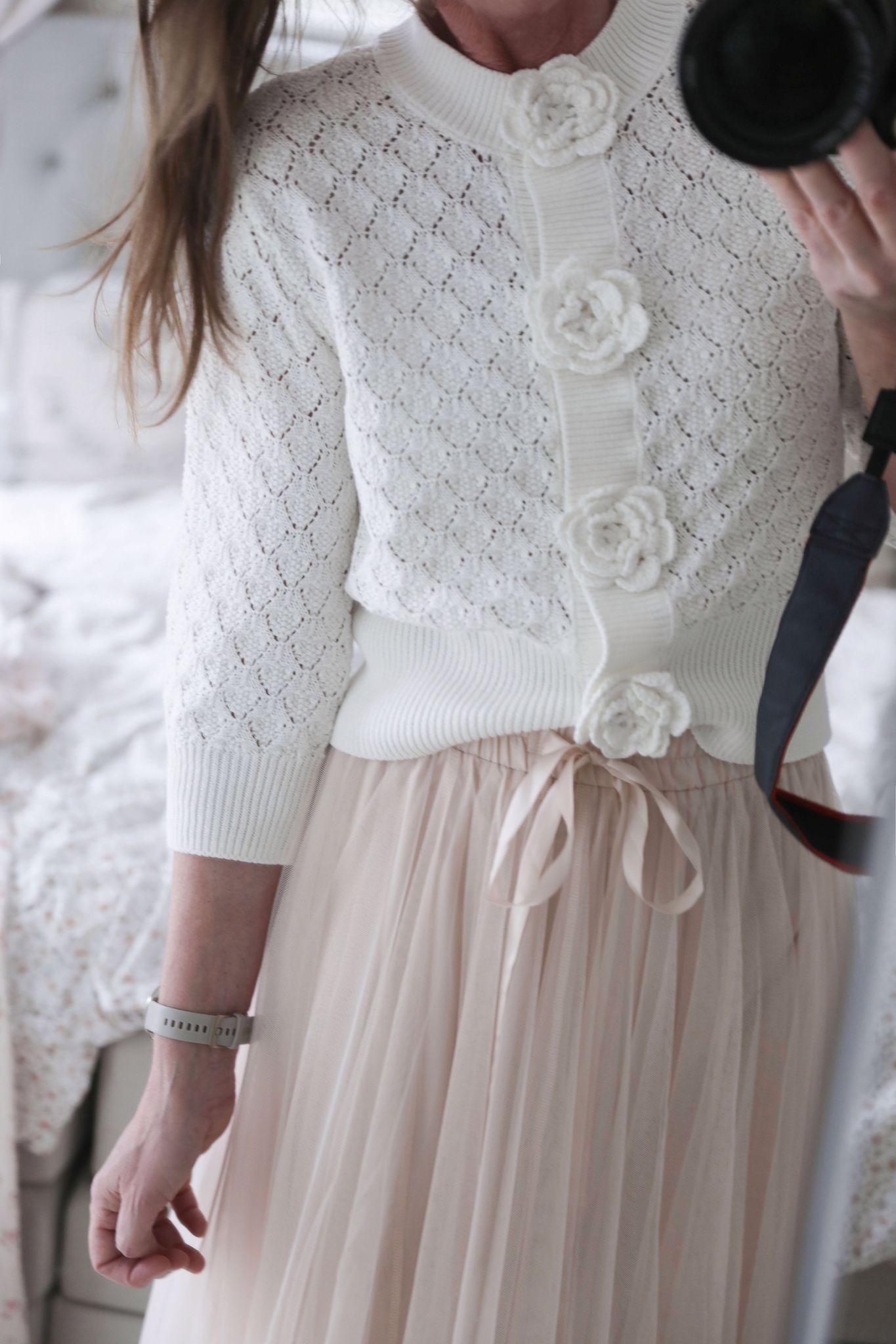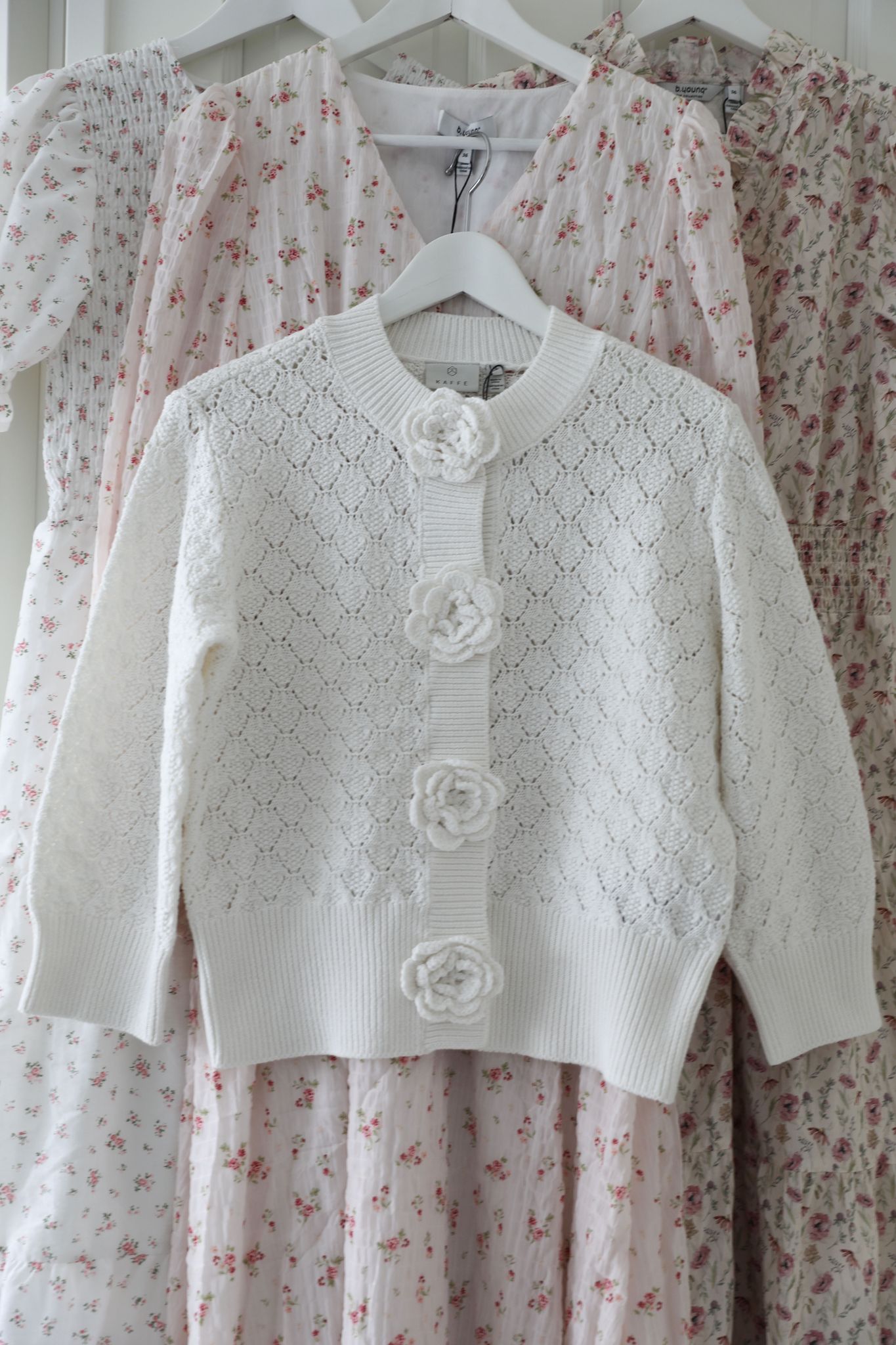 En romantisk stickad kofta i mjuk bomull med fina virkade