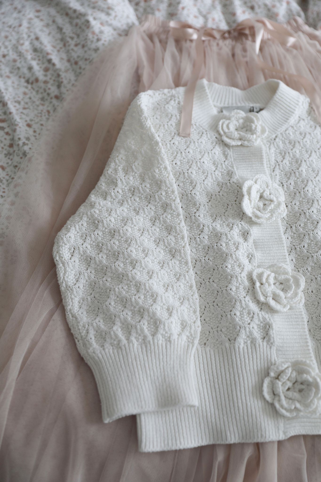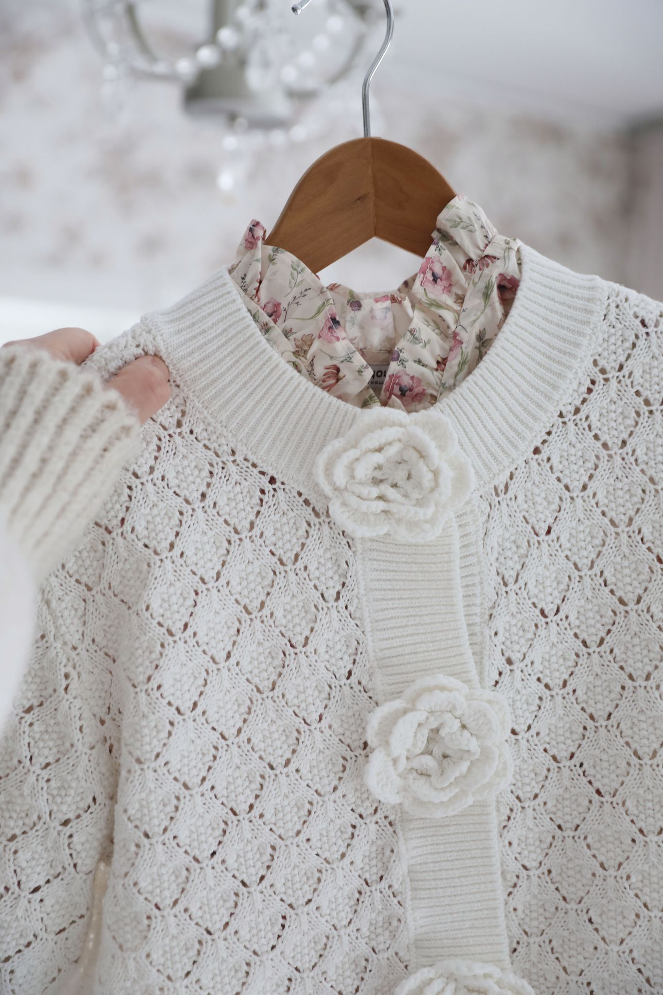 Vit stickad bomullskofta med virkade blommor